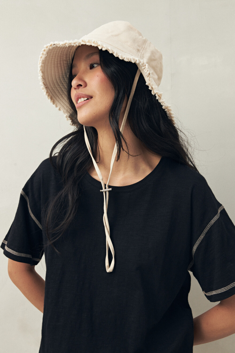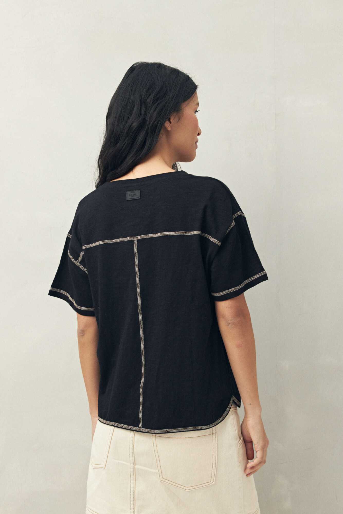 Remera de manga corta y cuello a la base confeccionada en algodón liviano. Presenta costuras a contratono visibles que enmarcan la silueta y aportan un guiño canchero al diseño. Un básico con carácter propio, ideal para sumar textura y contraste a los looks cotidianos.