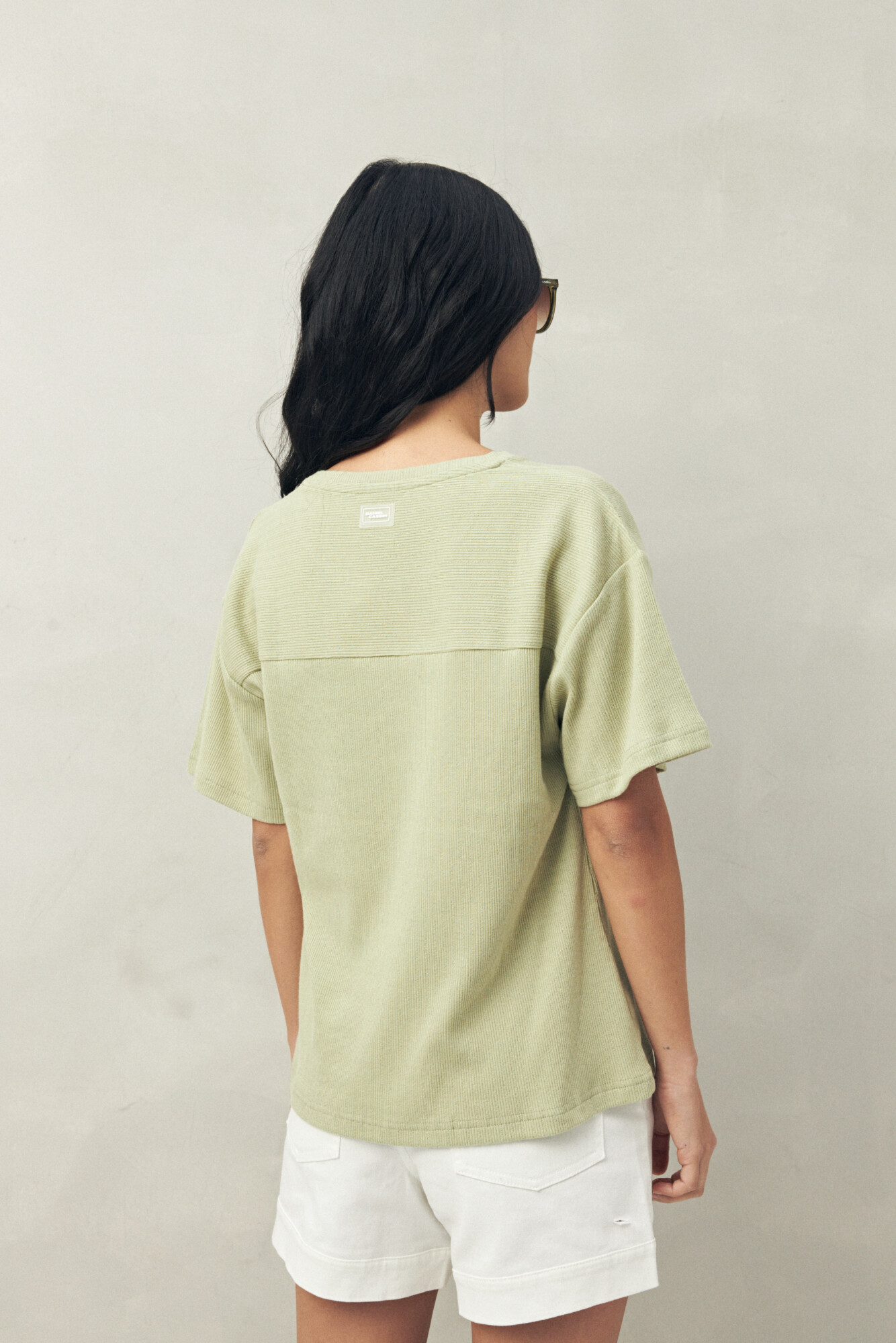 Remera básica de manga corta confeccionada en tejido de punto con leve textura acanalada. Su diseño clásico con cuello redondo y fit relajado la convierte en un esencial versátil, perfecto para combinar con jeans, faldas o shorts. Una prenda atemporal que se adapta a múltiples estilos y ocasiones, ideal para tener siempre a mano en el guardarropa.