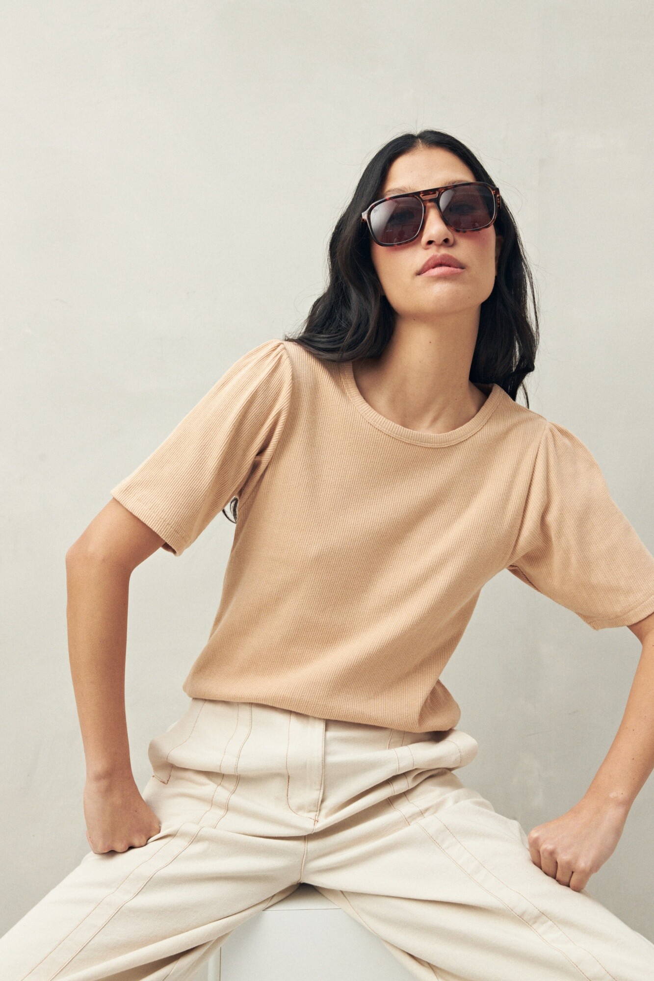 Remera de manga corta confeccionada en tejido acanalado suave al tacto. Su diseño clásico con cuello redondo y sutil frunce en los hombros aporta un toque femenino sin perder simpleza. Ideal para acompañar jeans, pantalones amplios o faldas, es una prenda versátil que se adapta a distintas ocasiones con un aire relajado y moderno.