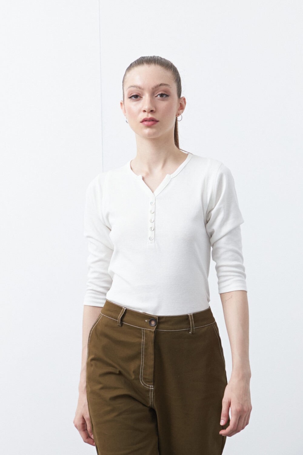 Remera de manga larga confeccionada en algodón, de calce clásico y silueta limpia, pensada como un básico infaltable de guardarropa. Presenta escote con abertura y cartera corta de botones que suma un detalle sutil y funcional, manteniendo una estética minimal y atemporal. Ideal para usar sola o como base de looks urbanos y de oficina relajada, es una pieza versátil que acompaña distintas temporadas.