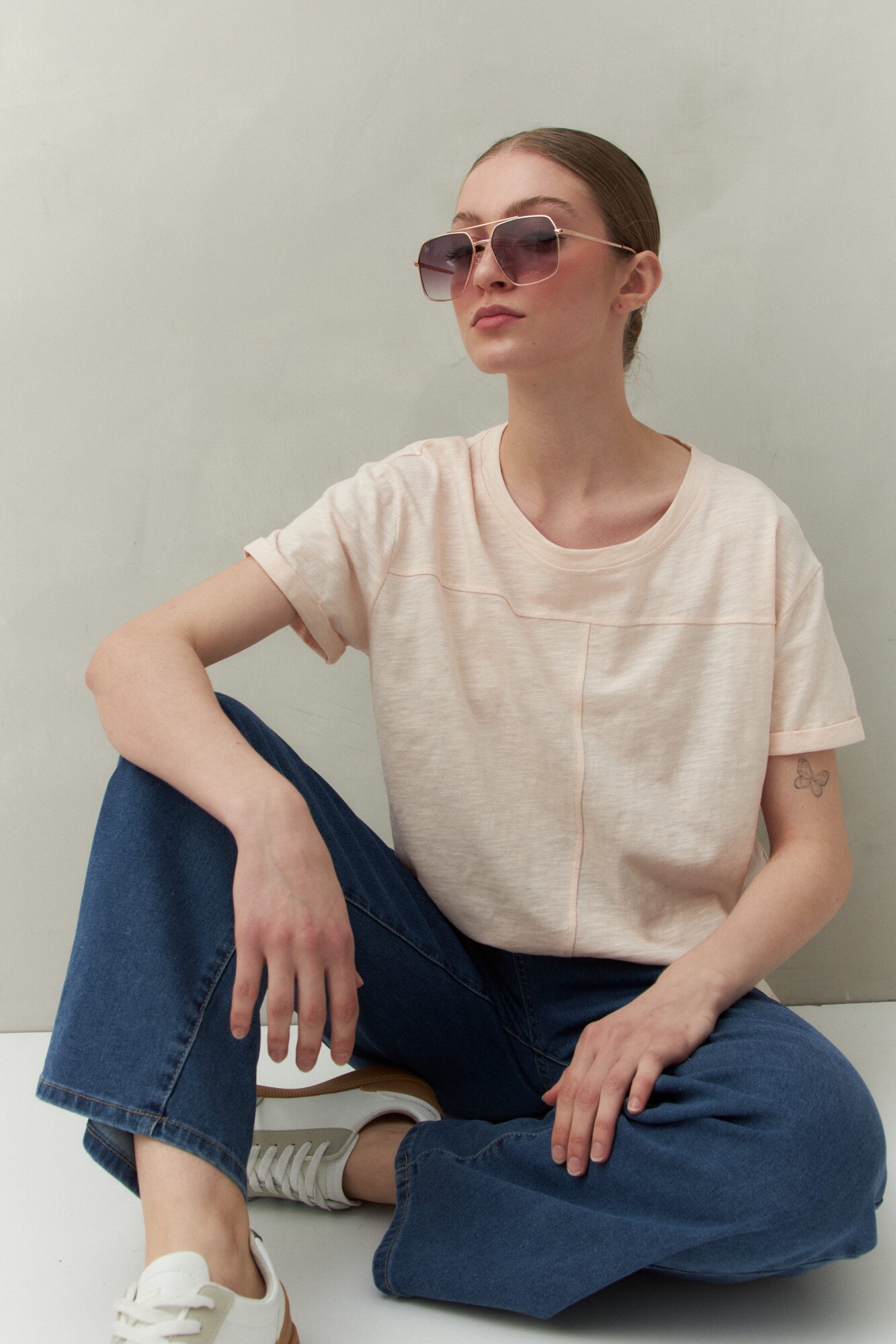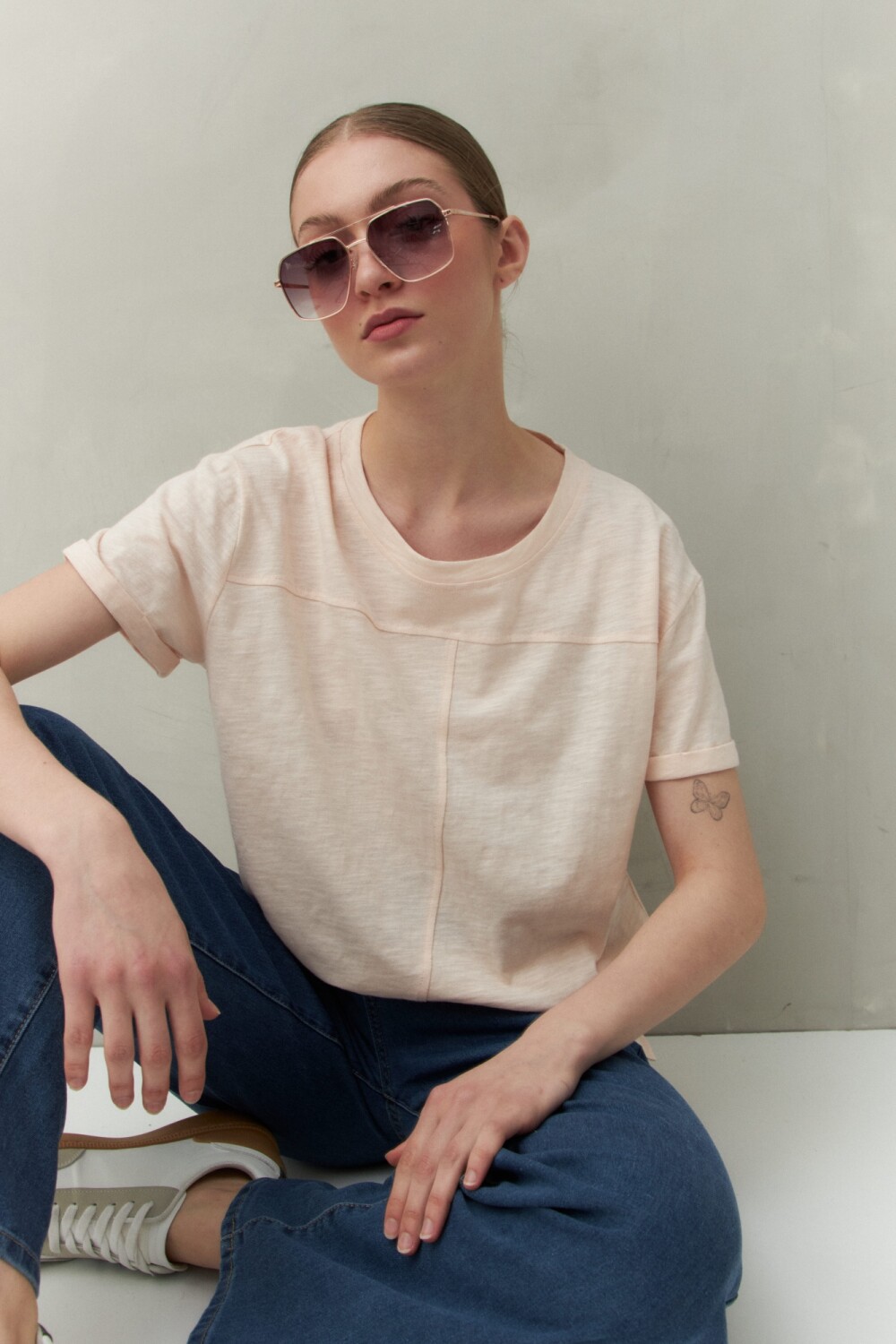 Remera básica de manga corta confeccionada en algodón liviano con textura levemente jaspeada. Presenta tajos laterales y costura central al frente, aportando un toque de diseño a un clásico del guardarropa. Ideal para acompañar looks casuales con un aire relajado y actual.