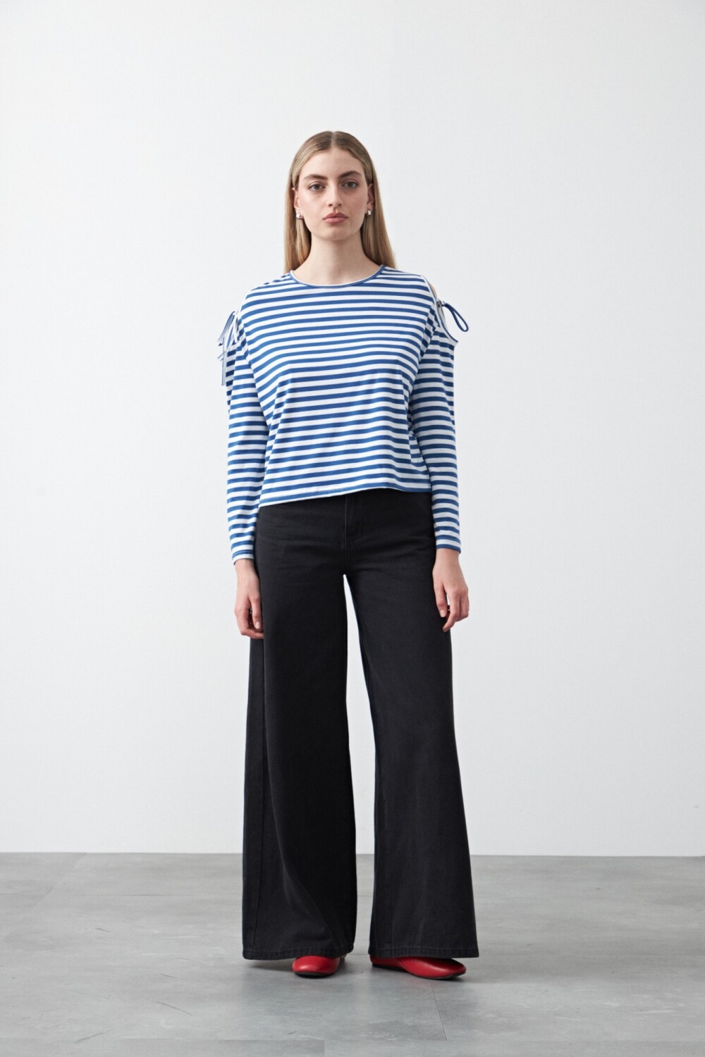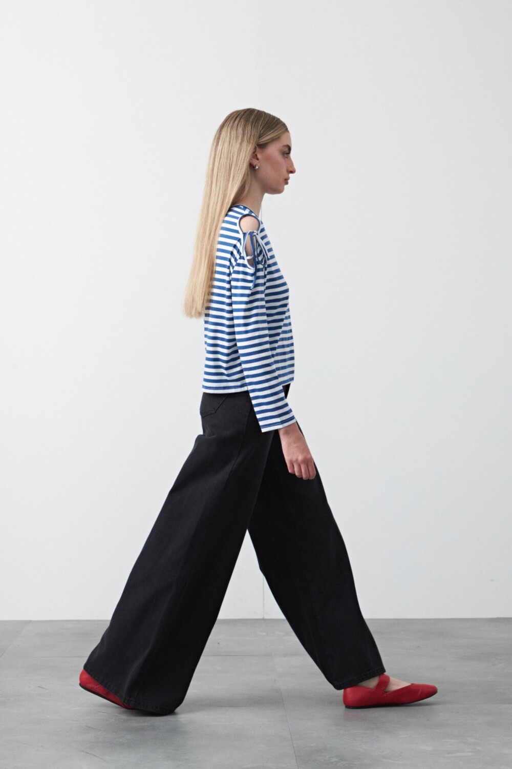 Remera de manga larga a rayas con diseño de cut outs en los hombros y lazos regulables que suman un detalle distintivo sin perder versatilidad. Las rayas, de inspiración navy, refuerzan su carácter atemporal y la convierten en una prenda fácil de integrar a distintos looks, desde combinaciones relajadas hasta estilismos más cuidados.