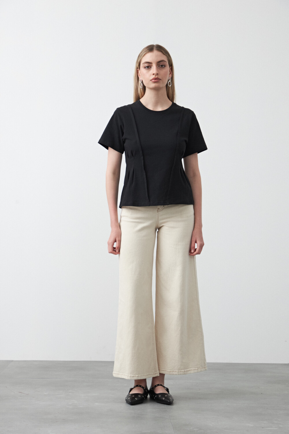 20 Remera de manga corta con cuello a la base y calce cómodo. Las costuras visibles en el frente están pensadas para acompañar la silueta y acentuar sutilmente la cintura, aportando estructura y un efecto estilizador. Confeccionada en algodón, es una prenda versátil que funciona tanto para looks de día como para combinaciones más prolijas, según los accesorios y el styling.