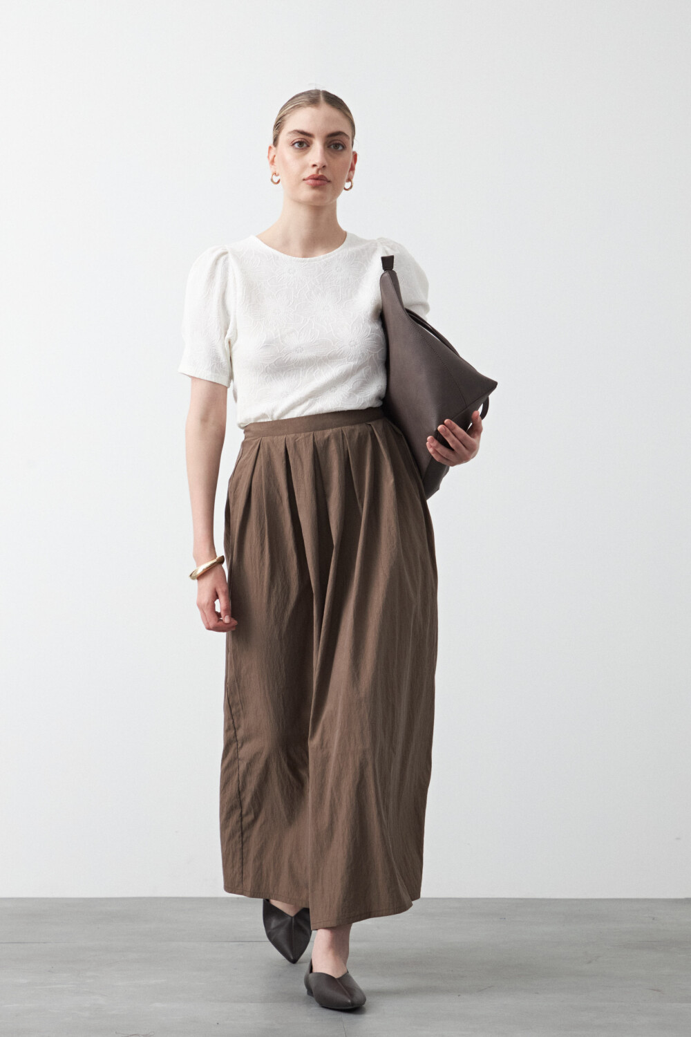 Remera de manga corta con textura floral en relieve y diseño de inspiración romántica. La superficie trabajada aporta profundidad visual y un diferencial sutil, mientras que las mangas abullonadas suman estructura y equilibrio.