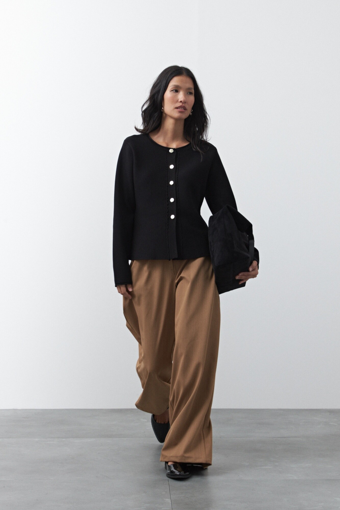 Cardigan corto de cintura entallada y silueta levemente evasé, diseñado para realzar la figura con una construcción precisa y femenina. El cierre frontal con botones protagonistas aporta un detalle distintivo, mientras que el tejido de punto acompaña el cuerpo con suavidad y estructura.