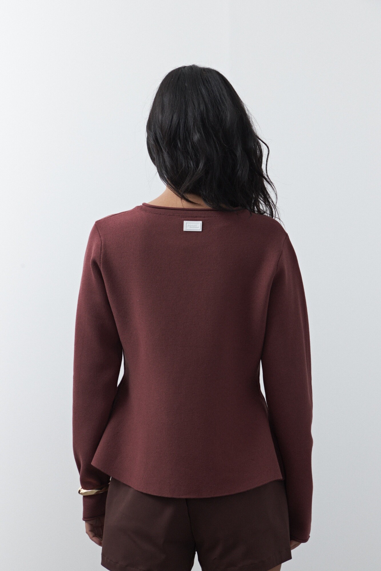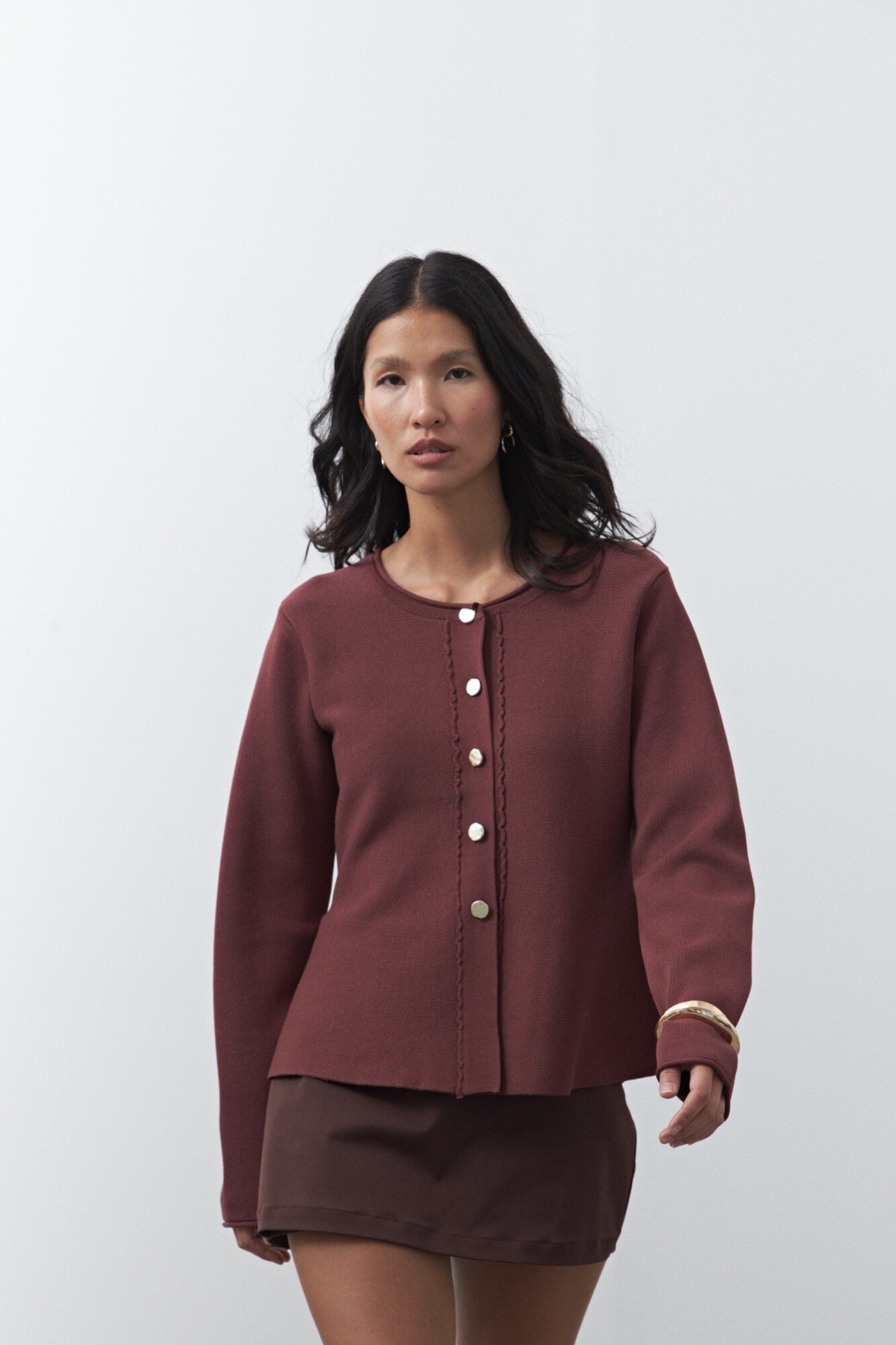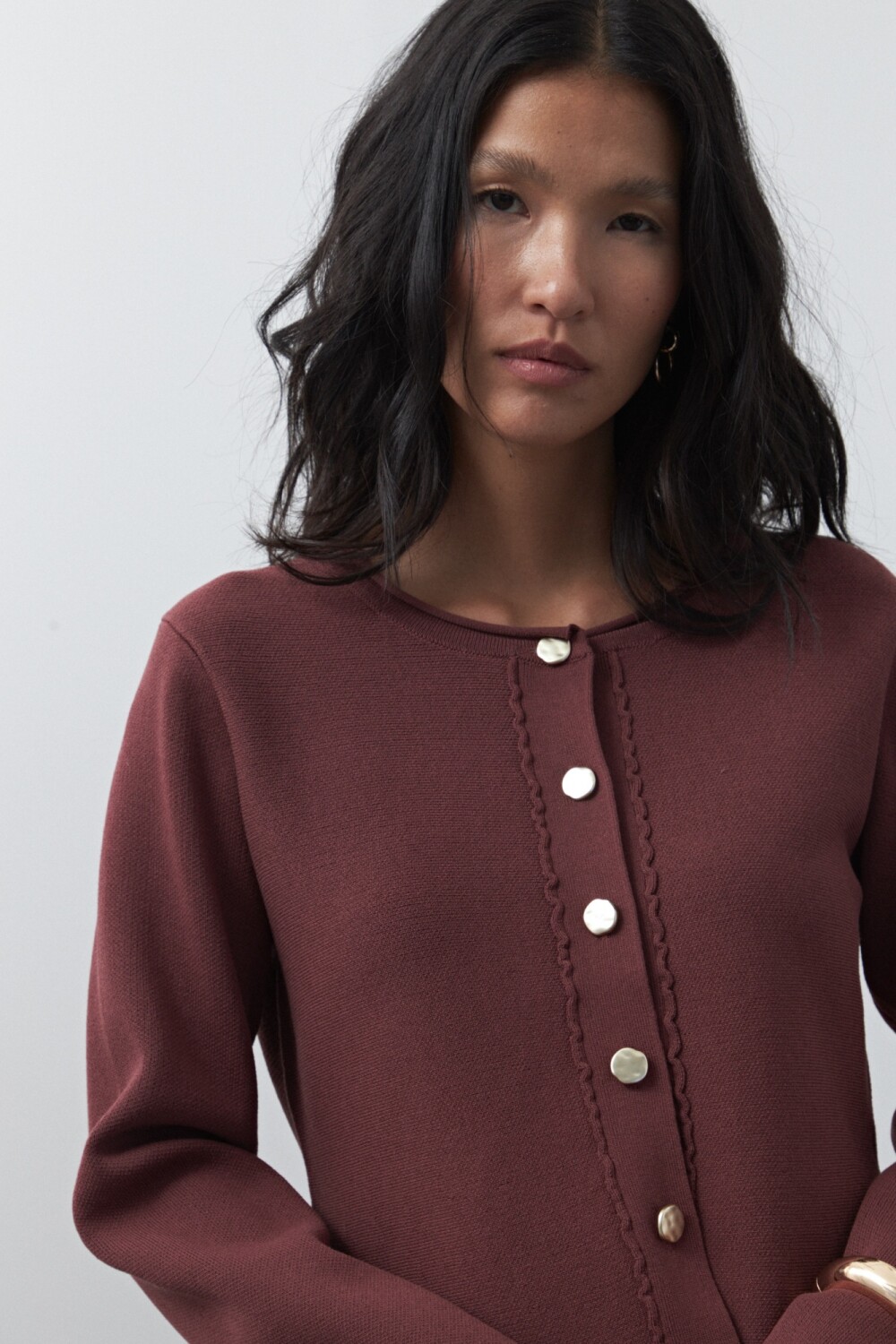 Cardigan corto de cintura entallada y silueta levemente evasé, diseñado para realzar la figura con una construcción precisa y femenina. El cierre frontal con botones protagonistas aporta un detalle distintivo, mientras que el tejido de punto acompaña el cuerpo con suavidad y estructura.