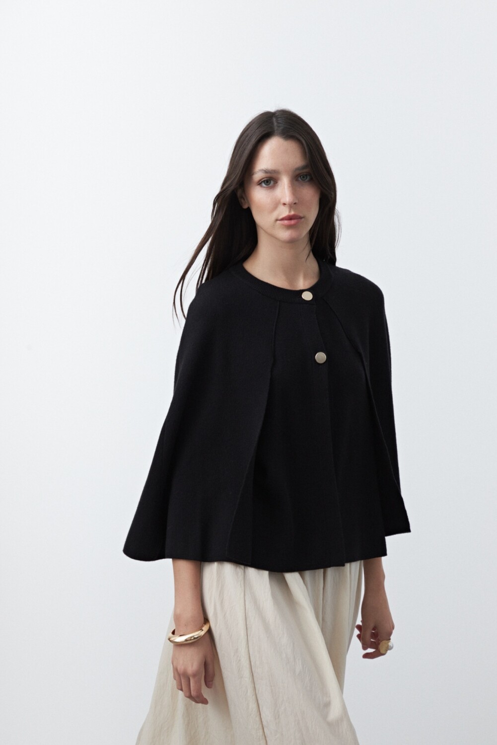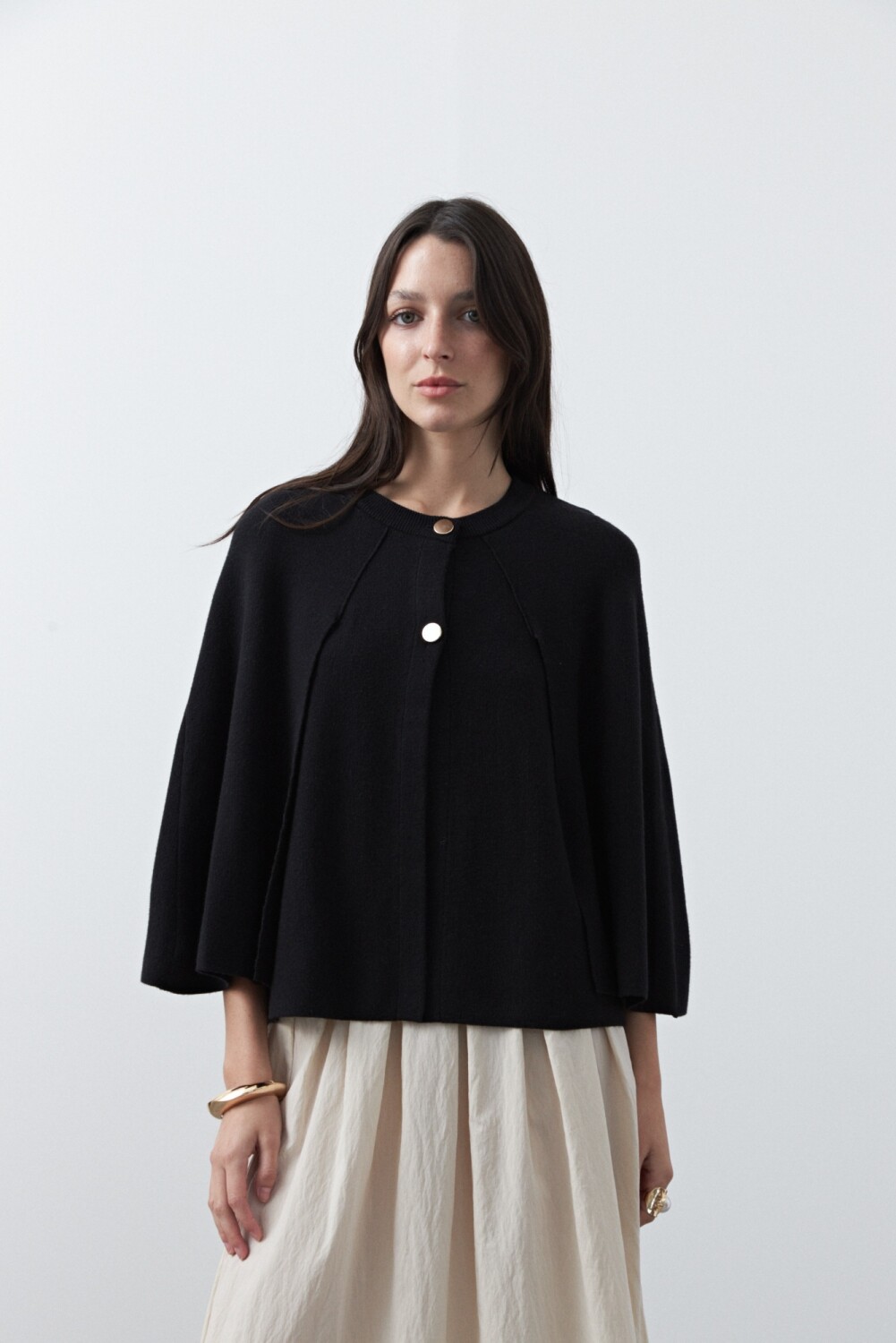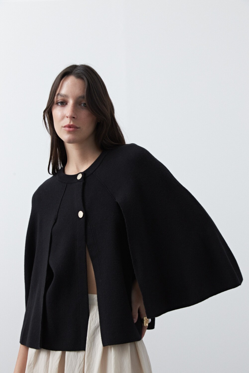 20 Saco tipo capa de líneas limpias y silueta fluida que aporta un aire elegante y sofisticado. Su diseño minimalista con caída amplia y cierre frontal con botones genera movimiento y estructura al mismo tiempo, convirtiéndolo en una pieza protagonista. Ideal para superponer sobre camisas o básicos y lograr un estilismo pulido que eleva cualquier look.