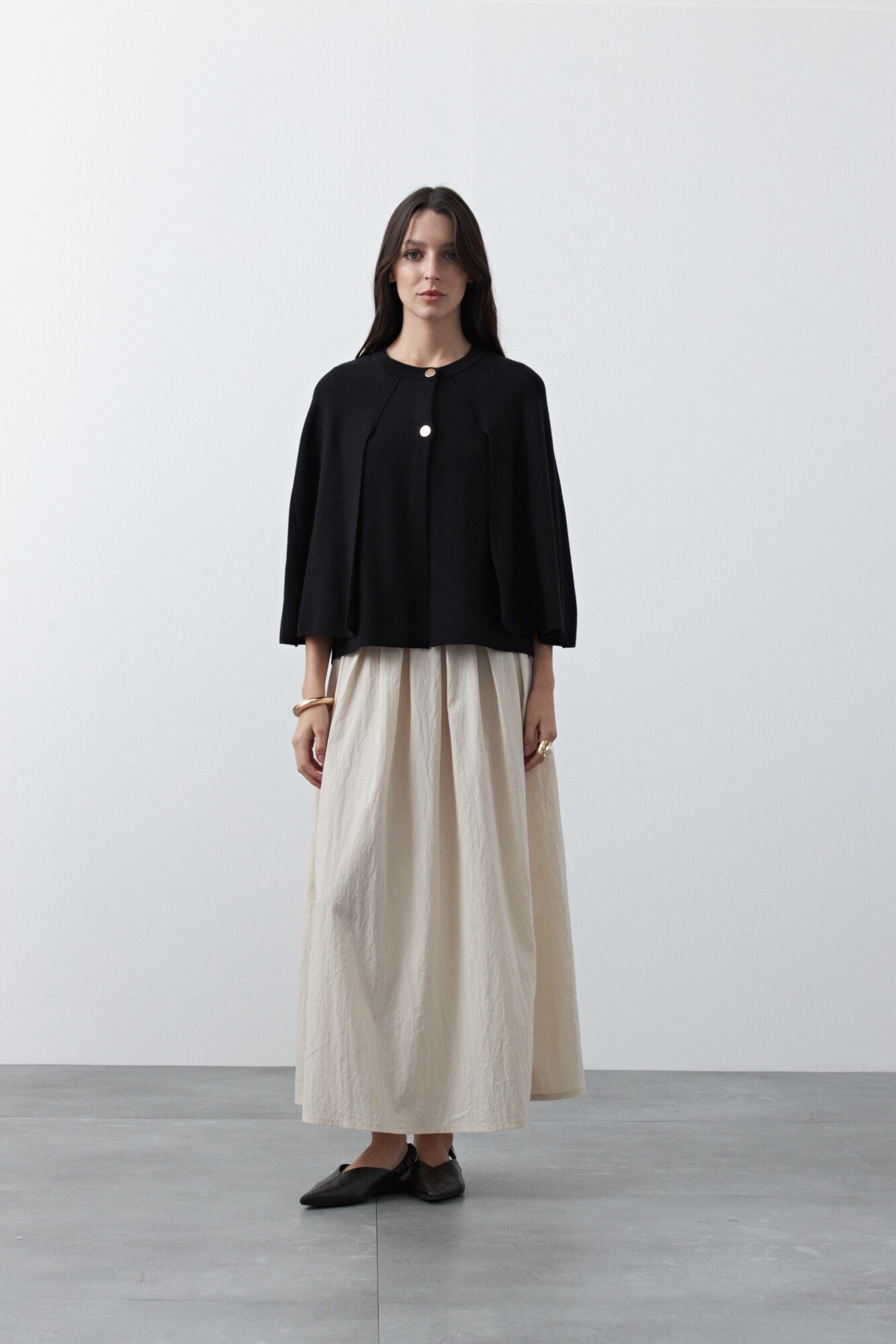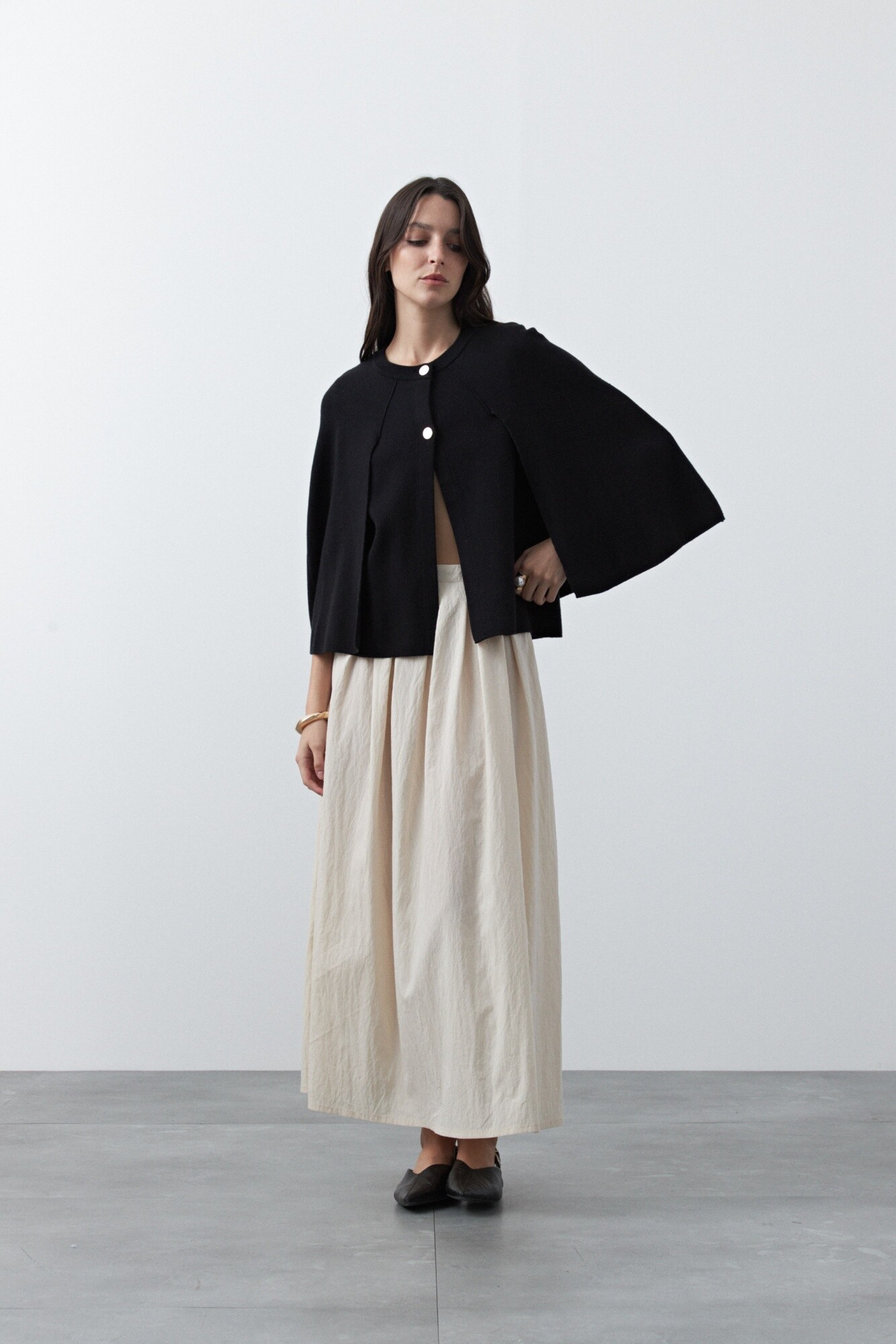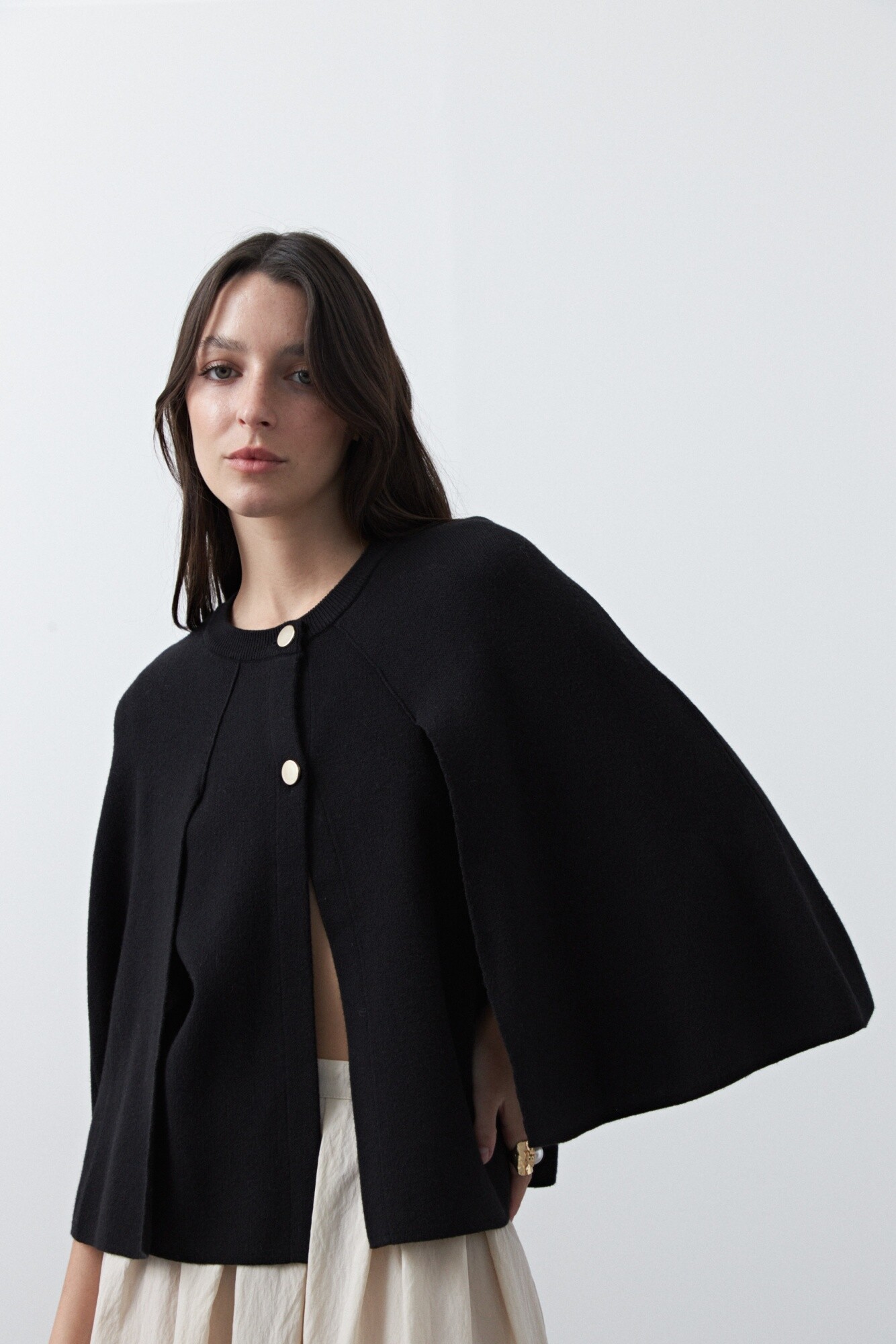 20 Saco tipo capa de líneas limpias y silueta fluida que aporta un aire elegante y sofisticado. Su diseño minimalista con caída amplia y cierre frontal con botones genera movimiento y estructura al mismo tiempo, convirtiéndolo en una pieza protagonista. Ideal para superponer sobre camisas o básicos y lograr un estilismo pulido que eleva cualquier look.