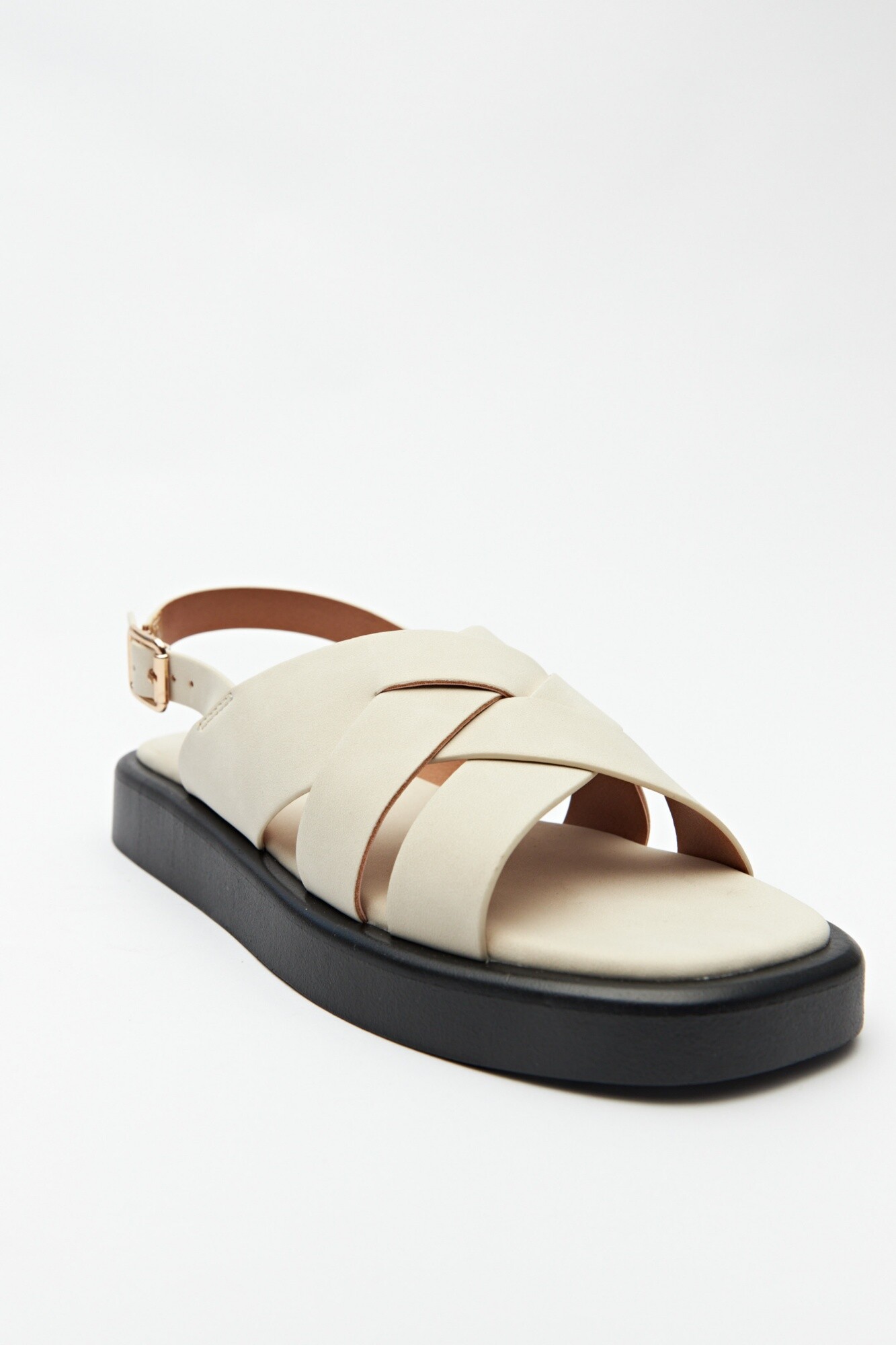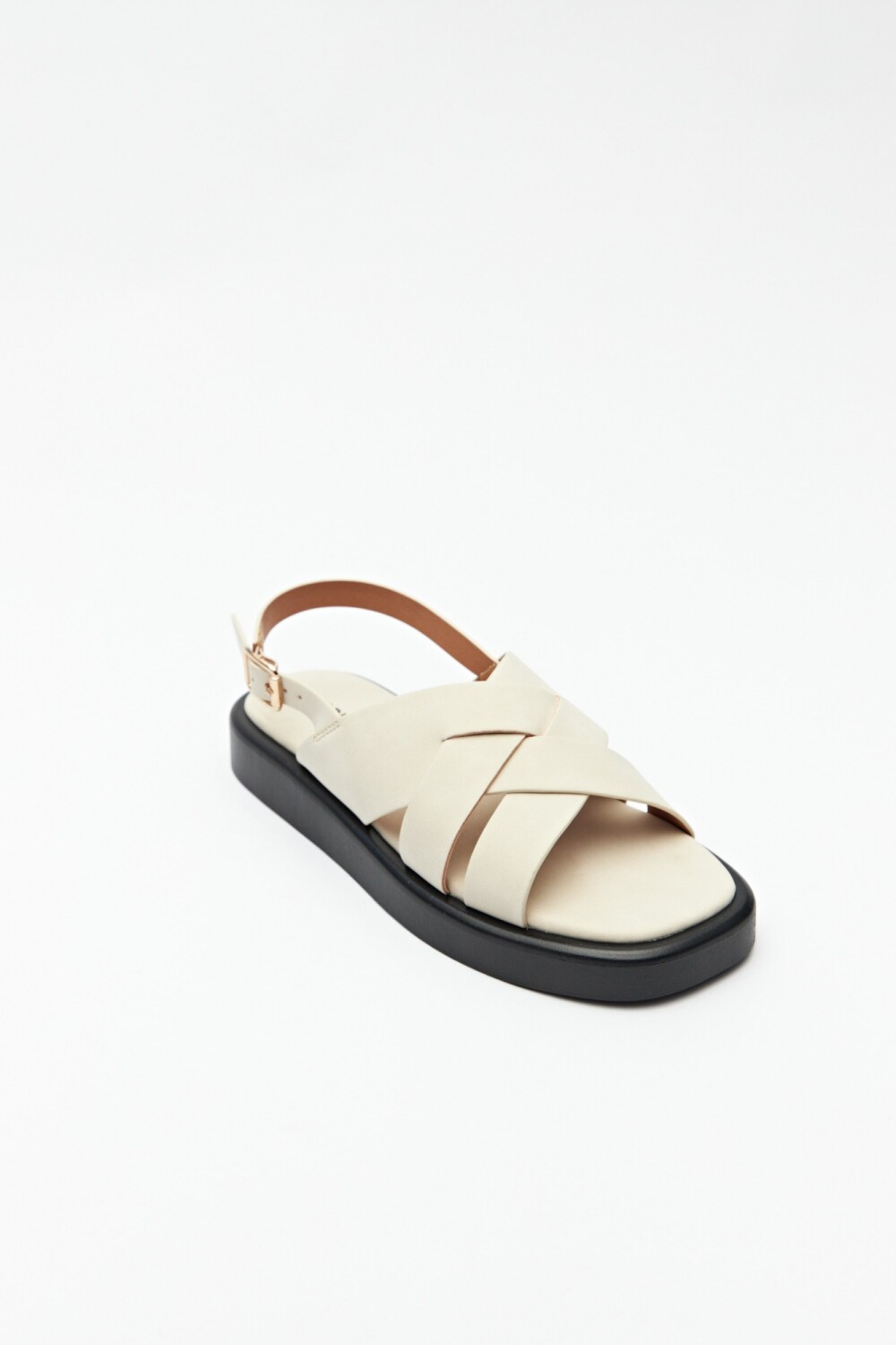Sandalias en símil cuero con agarre ajustable en el talón y capellada entrelazada. Su plataforma es de 3cm de alto.