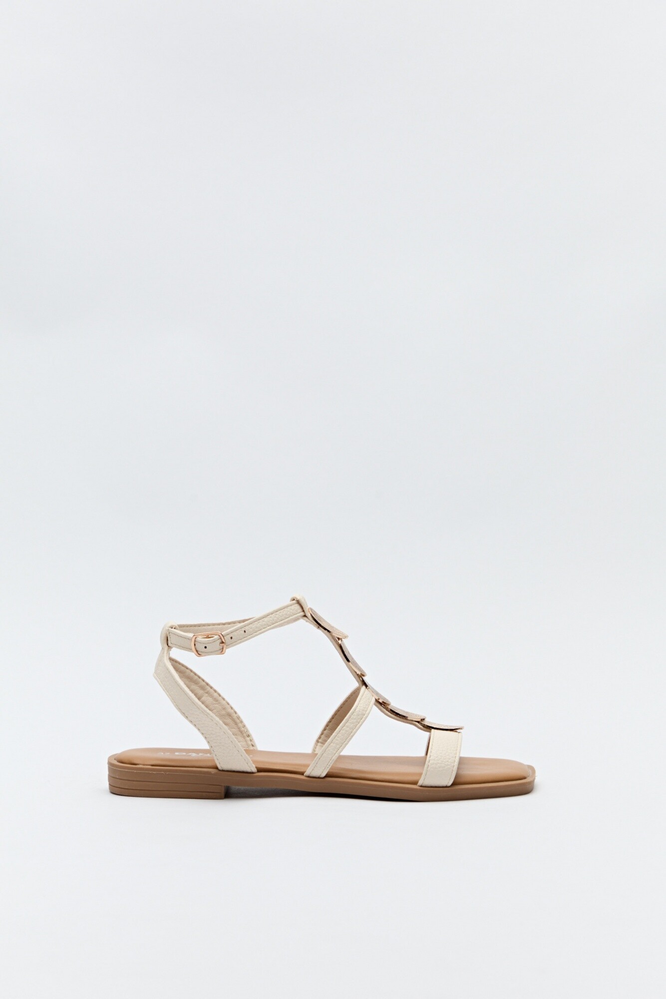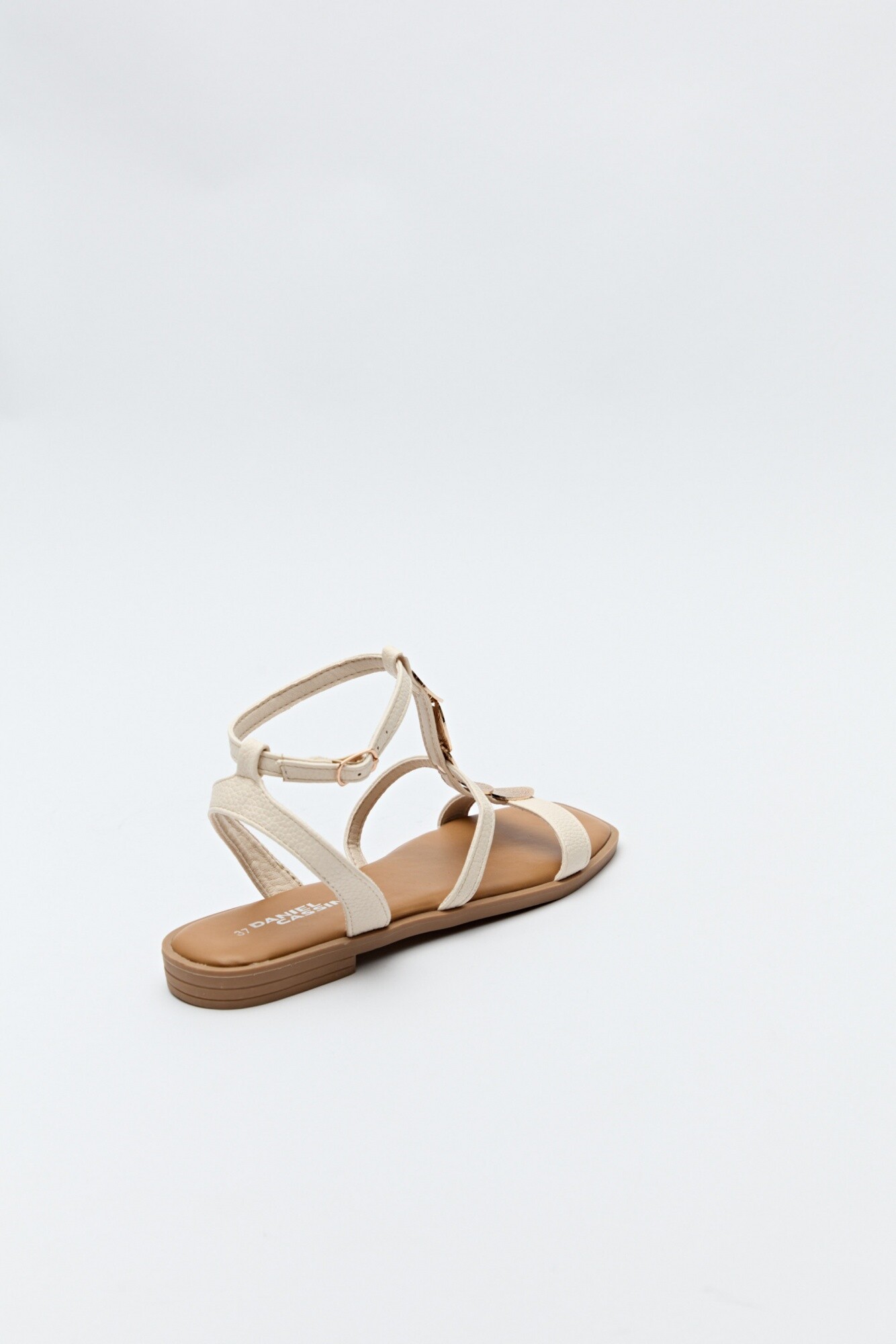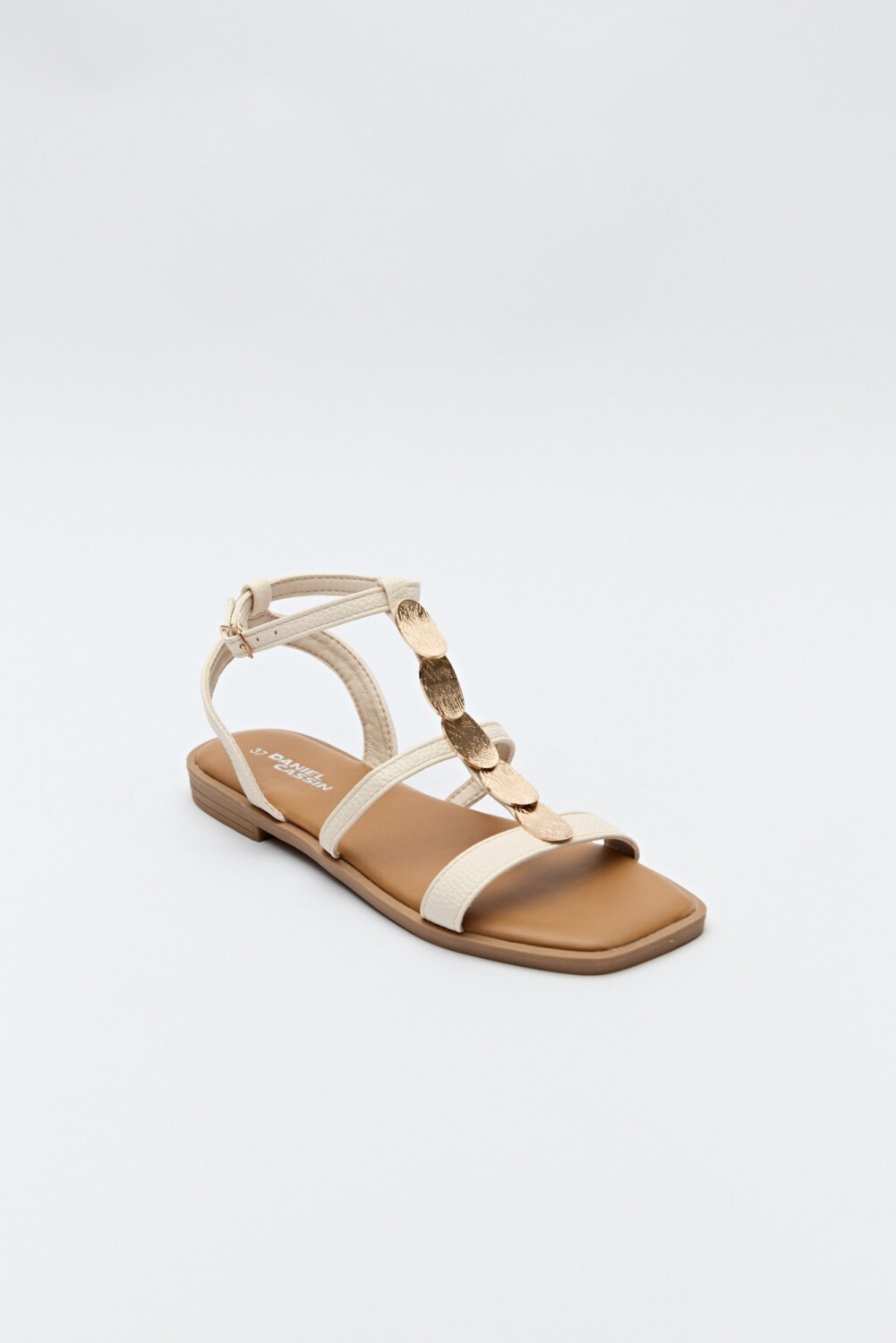 De inspiración boho chic, estas sandalias planas se destacan por sus tiras finas y el aplique metálico central que aporta un toque distintivo y sofisticado. Con cierre de hebilla lateral y base cómoda, son el aliado perfecto para looks de verano que combinan estilo y ligereza. Ideales para acompañar vestidos, shorts o faldas.