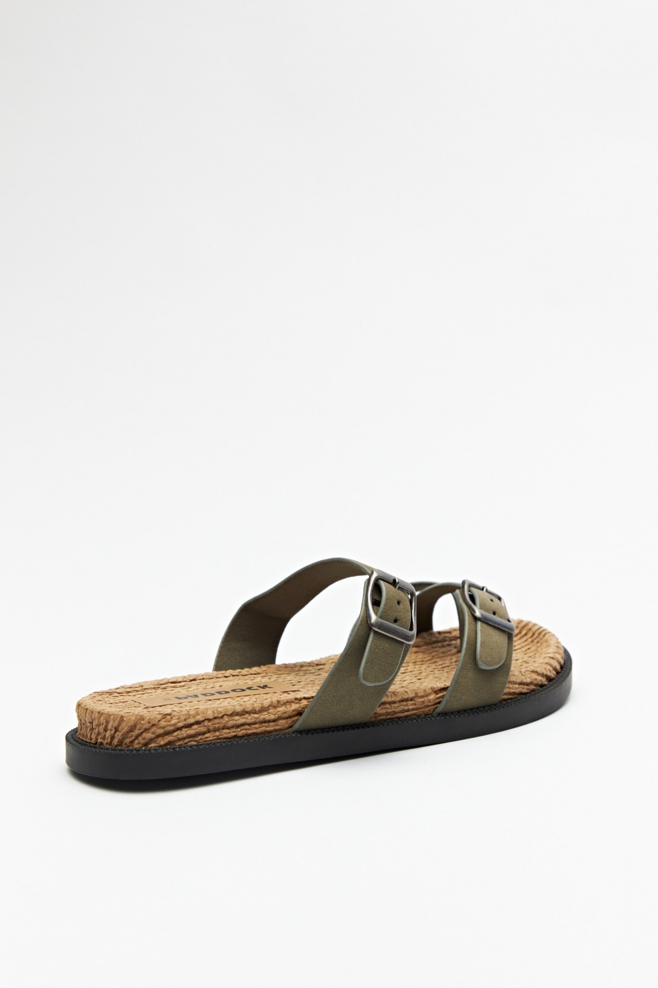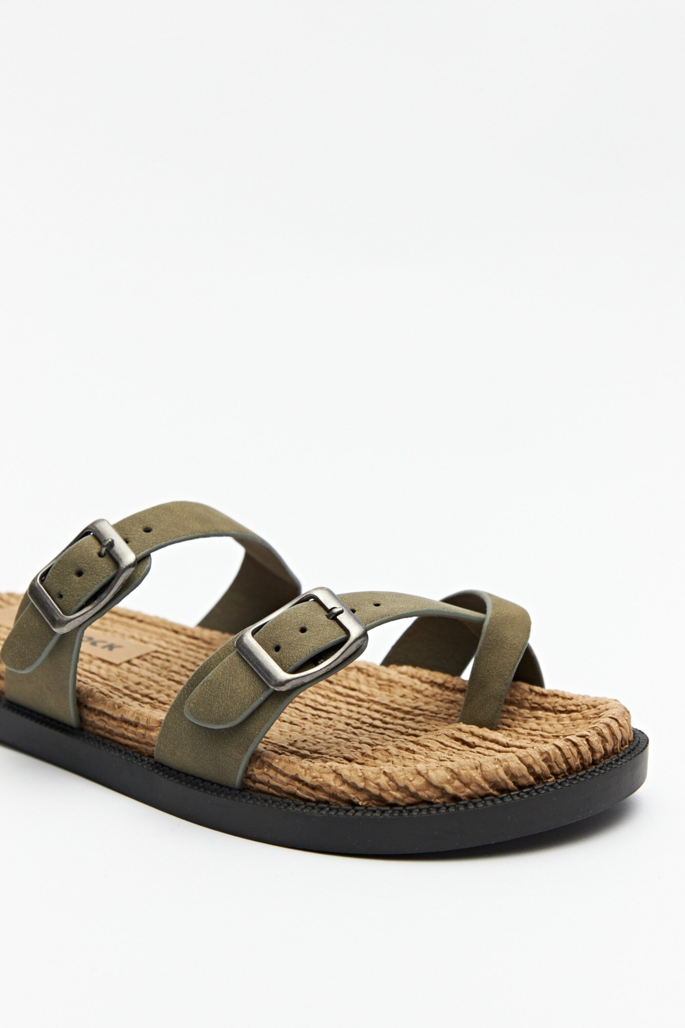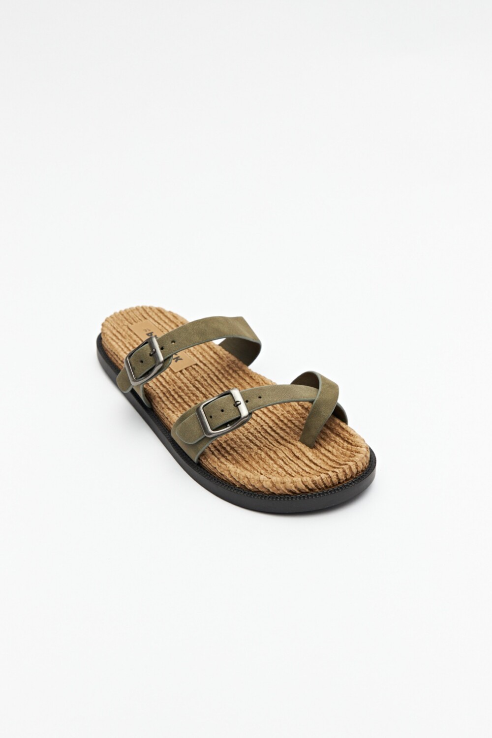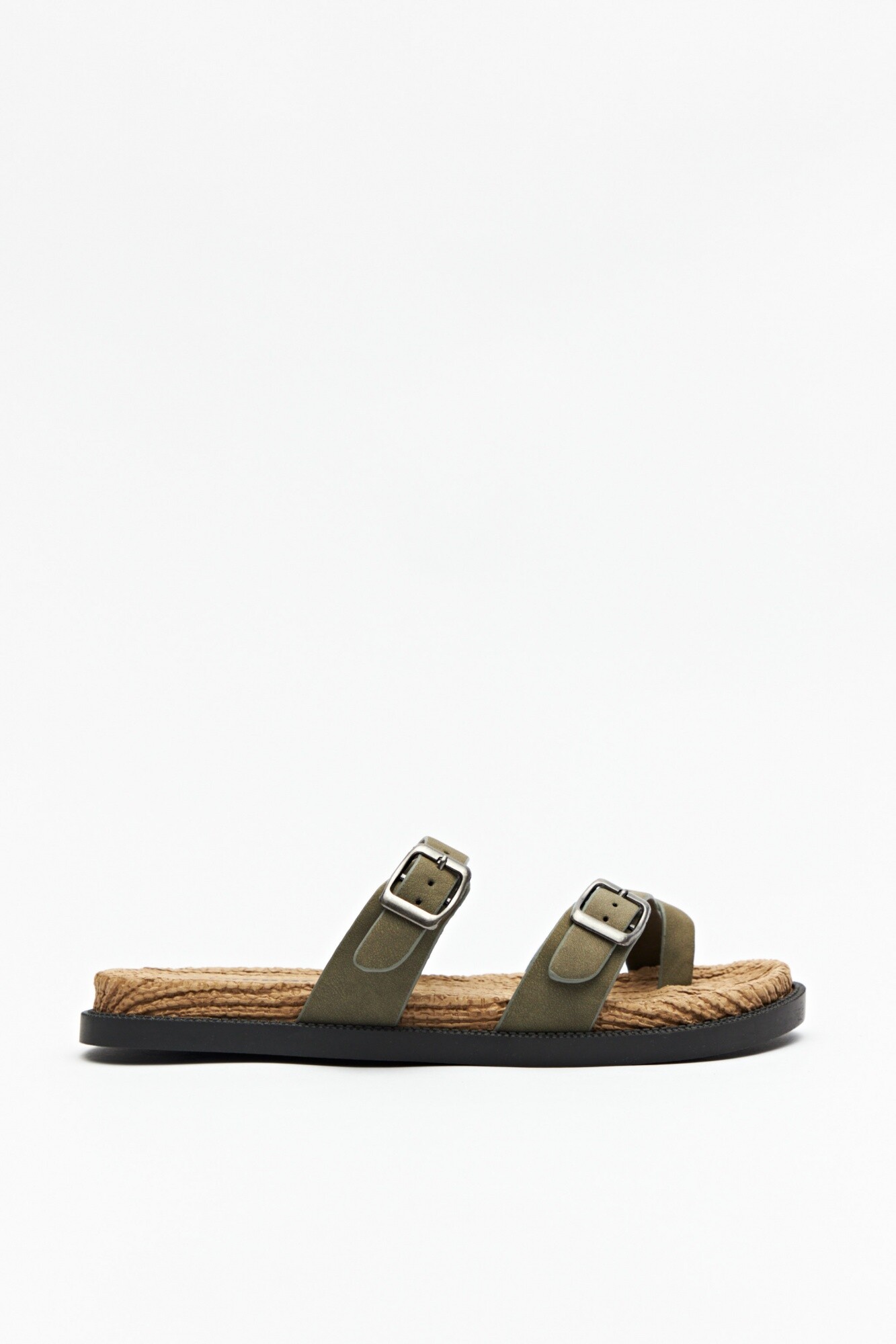 Sandalia plana con base de fibra trenzada y tiras cruzadas ajustables con hebillas metálicas. Un básico cómodo y fresco, ideal para completar cualquier look de verano o festival.