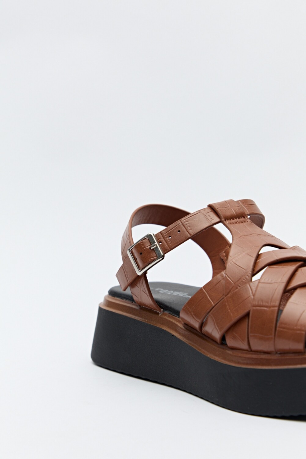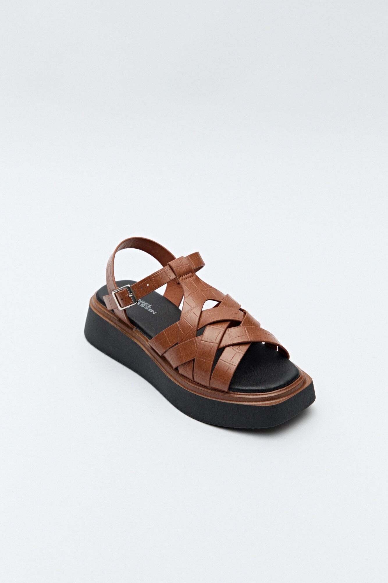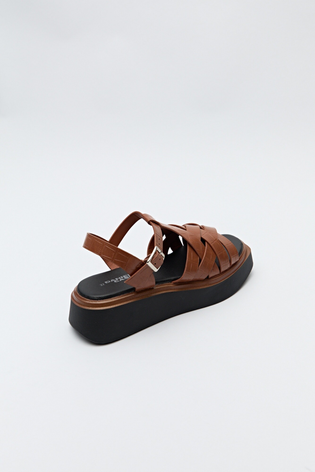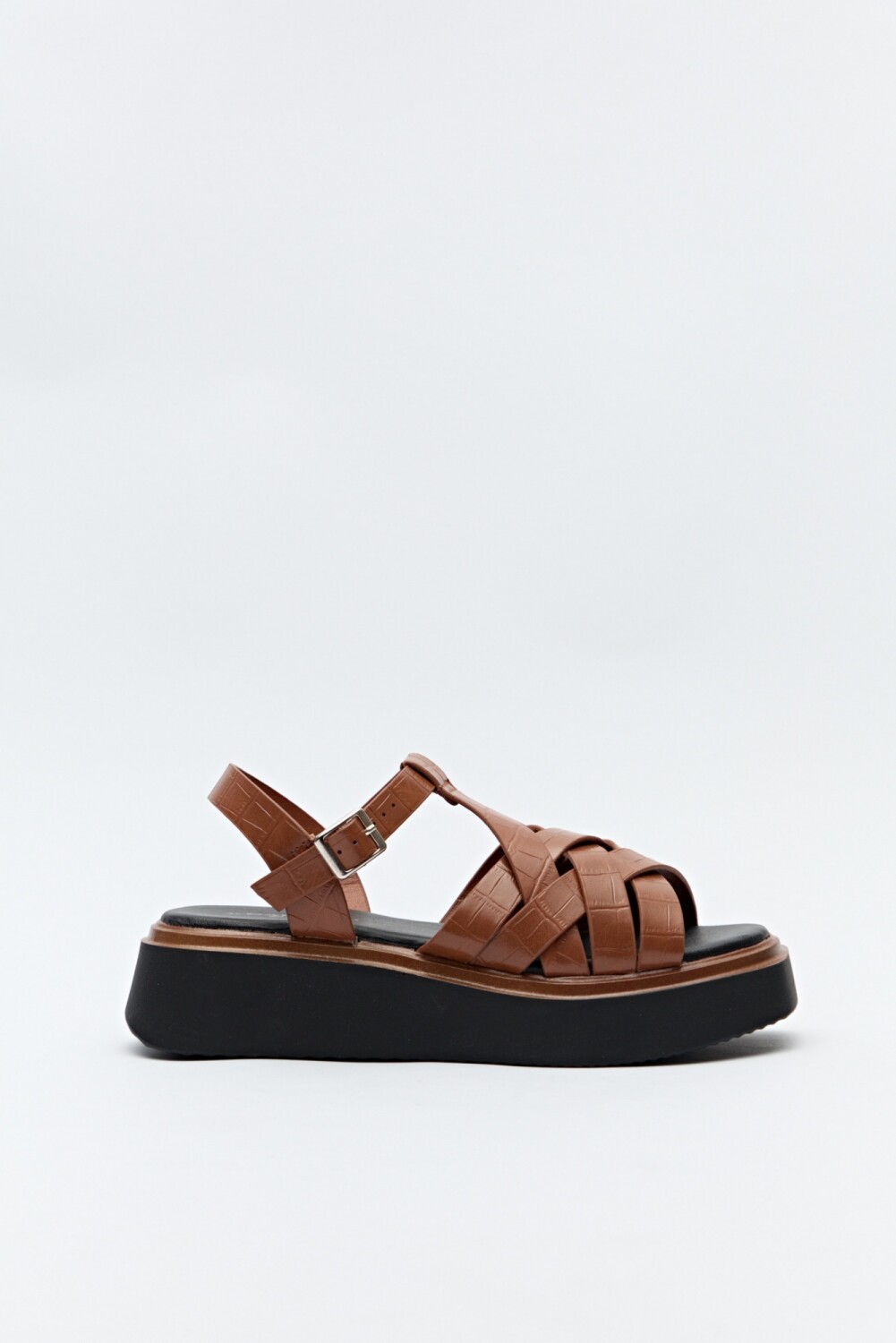 Sandalia con base plataforma bicolor y capellada de tiras entrelazadas con textura símil reptil. La hebilla metálica lateral permite ajustar el calce, mientras que la suela de goma aporta estabilidad y confort. Una pieza trendy y funcional que equilibra diseño artesanal con un estilo urbano contemporáneo.