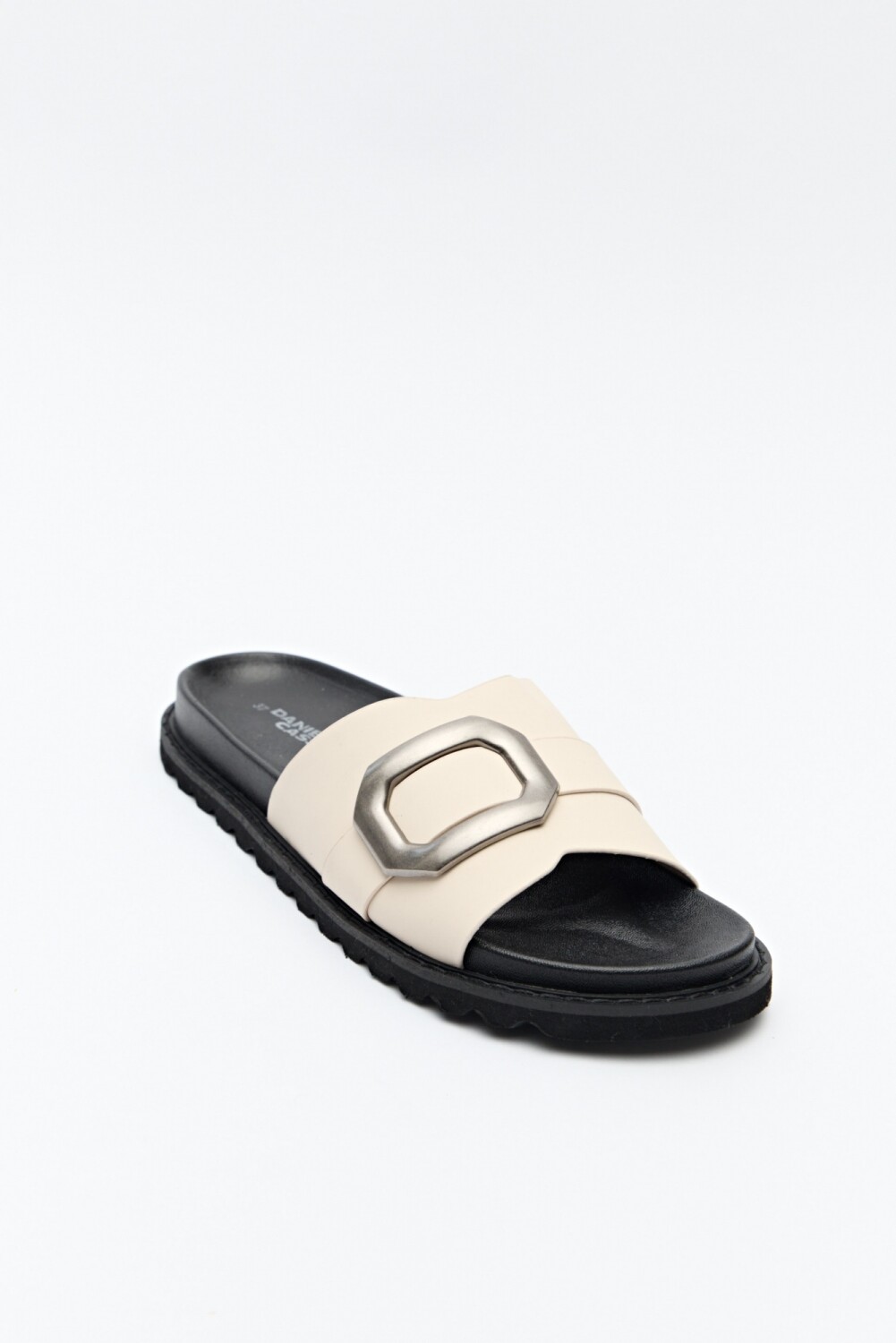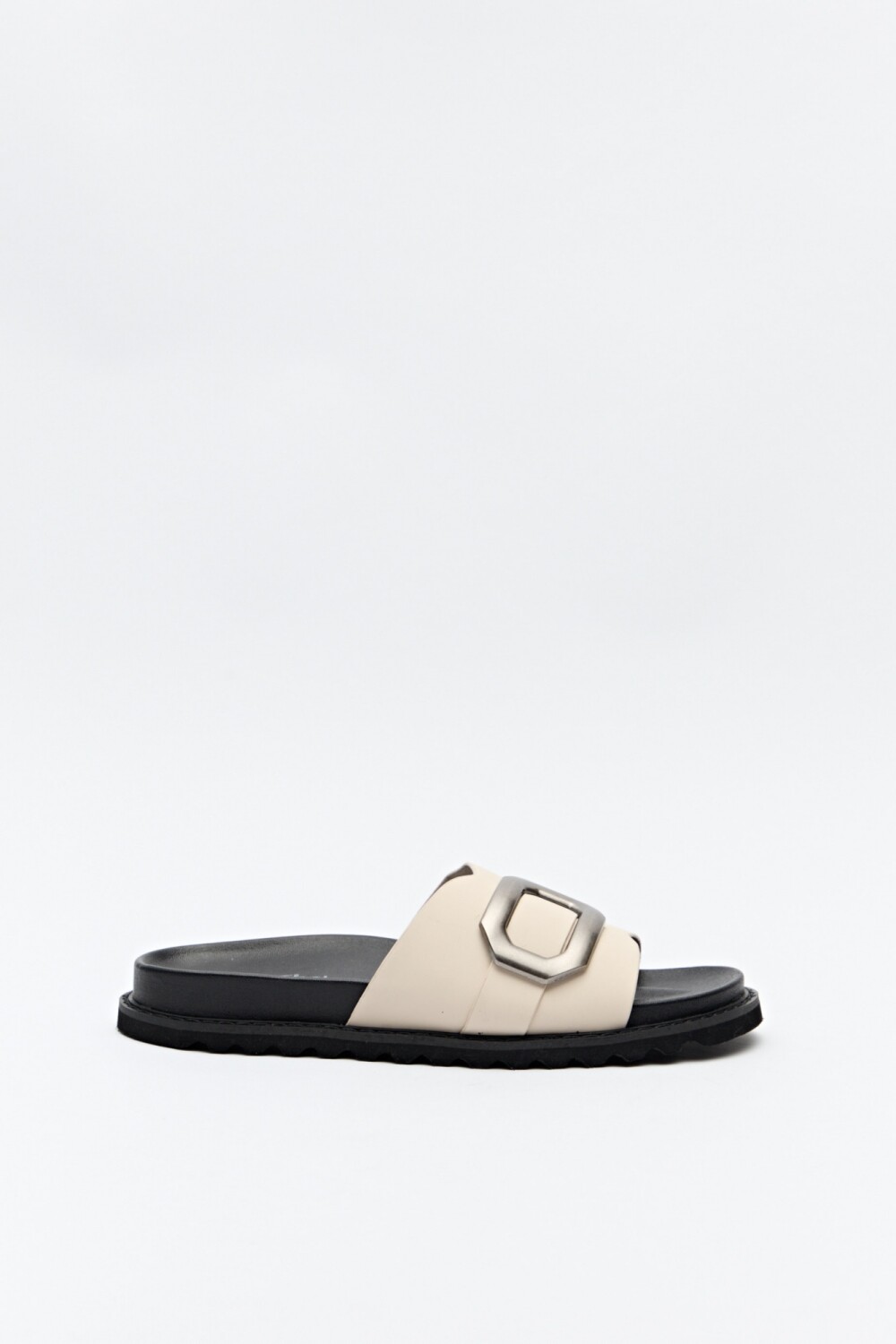 Sandalia tipo slide con una sola tira ancha y detalle de hebilla metálica XL que aporta un aire moderno y canchero. Su base liviana y su plantilla acolchonada garantizan comodidad en cada paso, ideal para un look relajado con un toque de diseño. Perfecta para acompañar outfits casuales o elevar conjuntos simples con un guiño trendy.