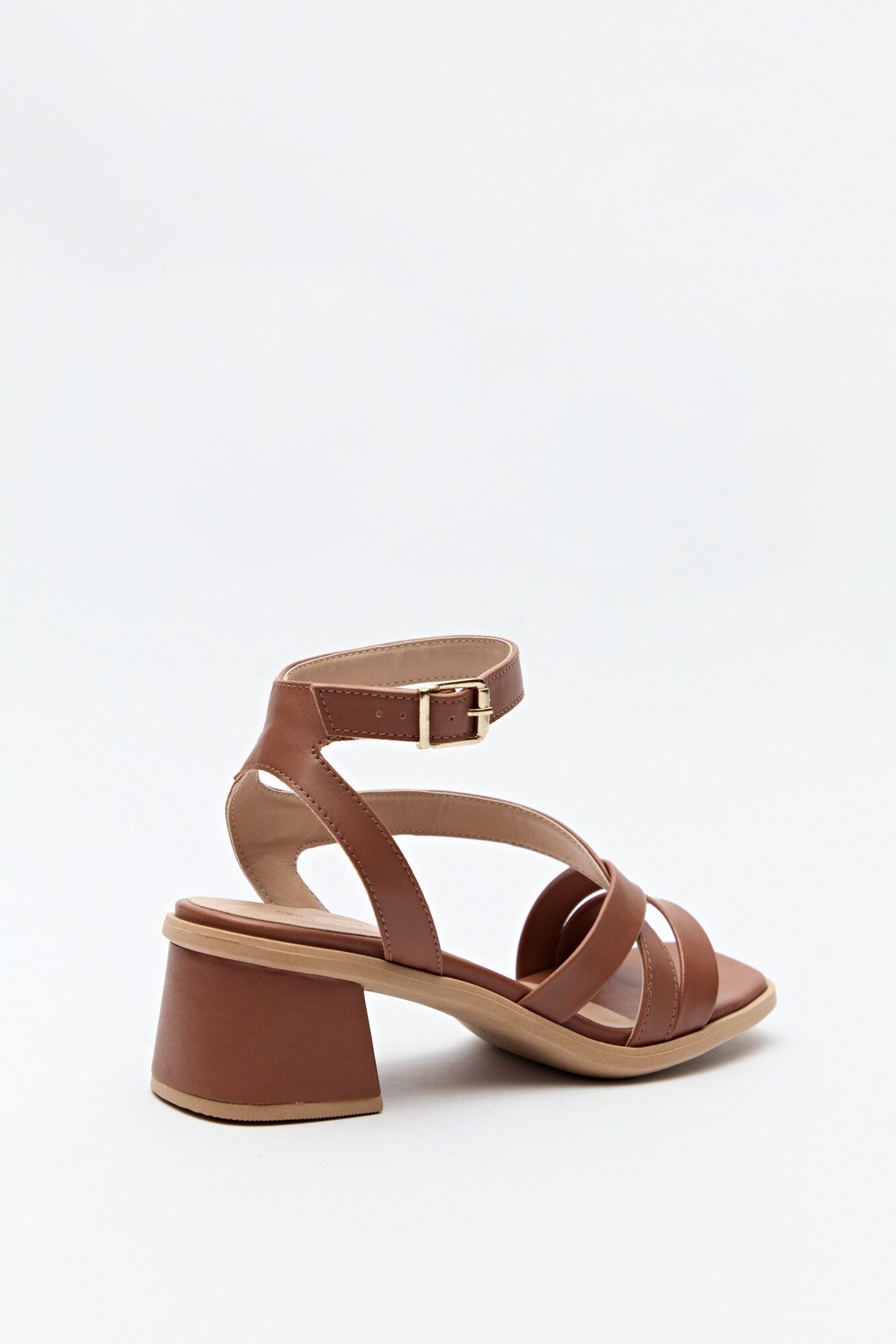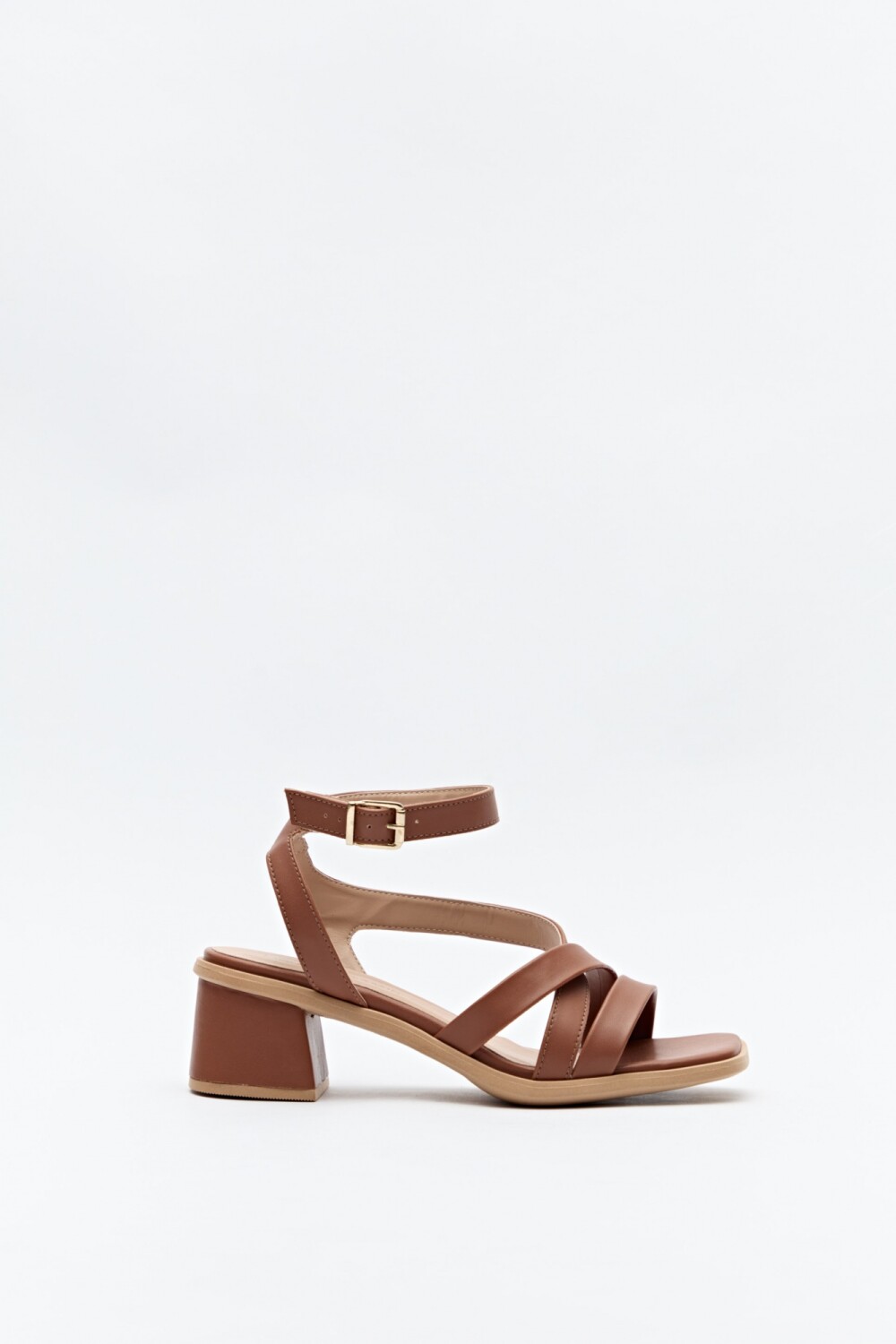 Sandalia con diseño de tiras cruzadas y pulsera al tobillo con hebilla metálica. Su taco ancho medio ofrece estabilidad y comodidad sin perder estilo. Un modelo versátil y elegante, ideal para acompañar looks de día o de noche.