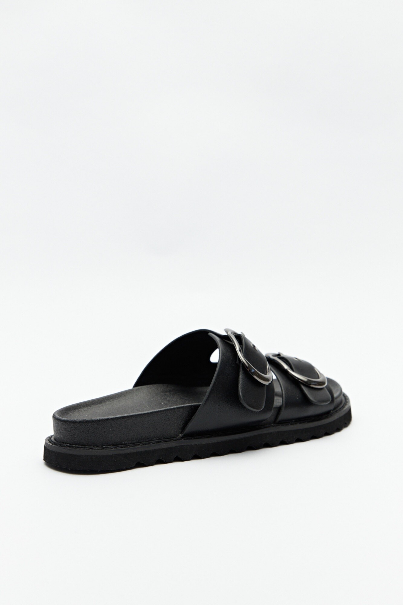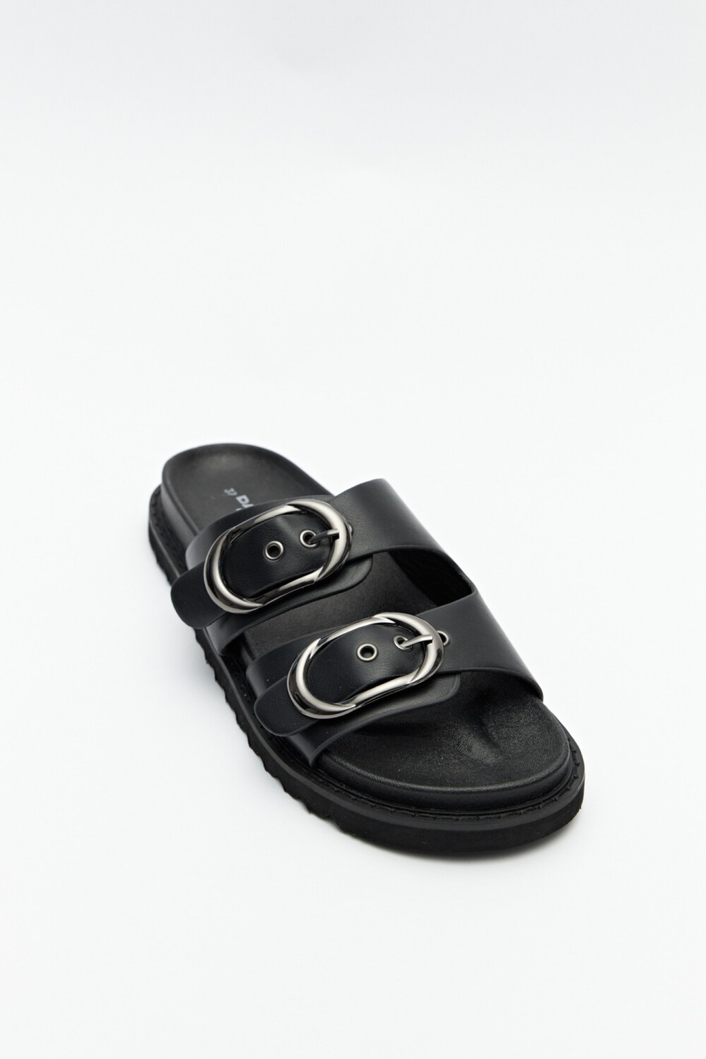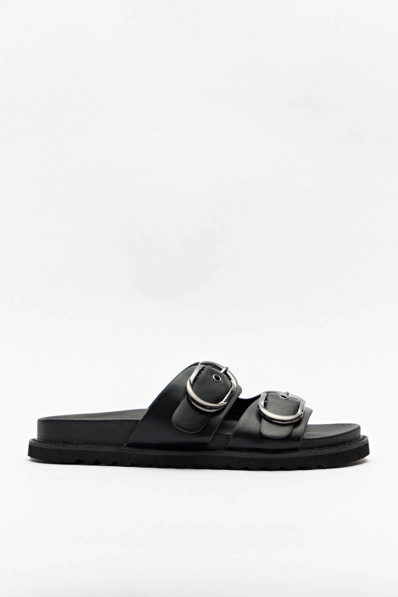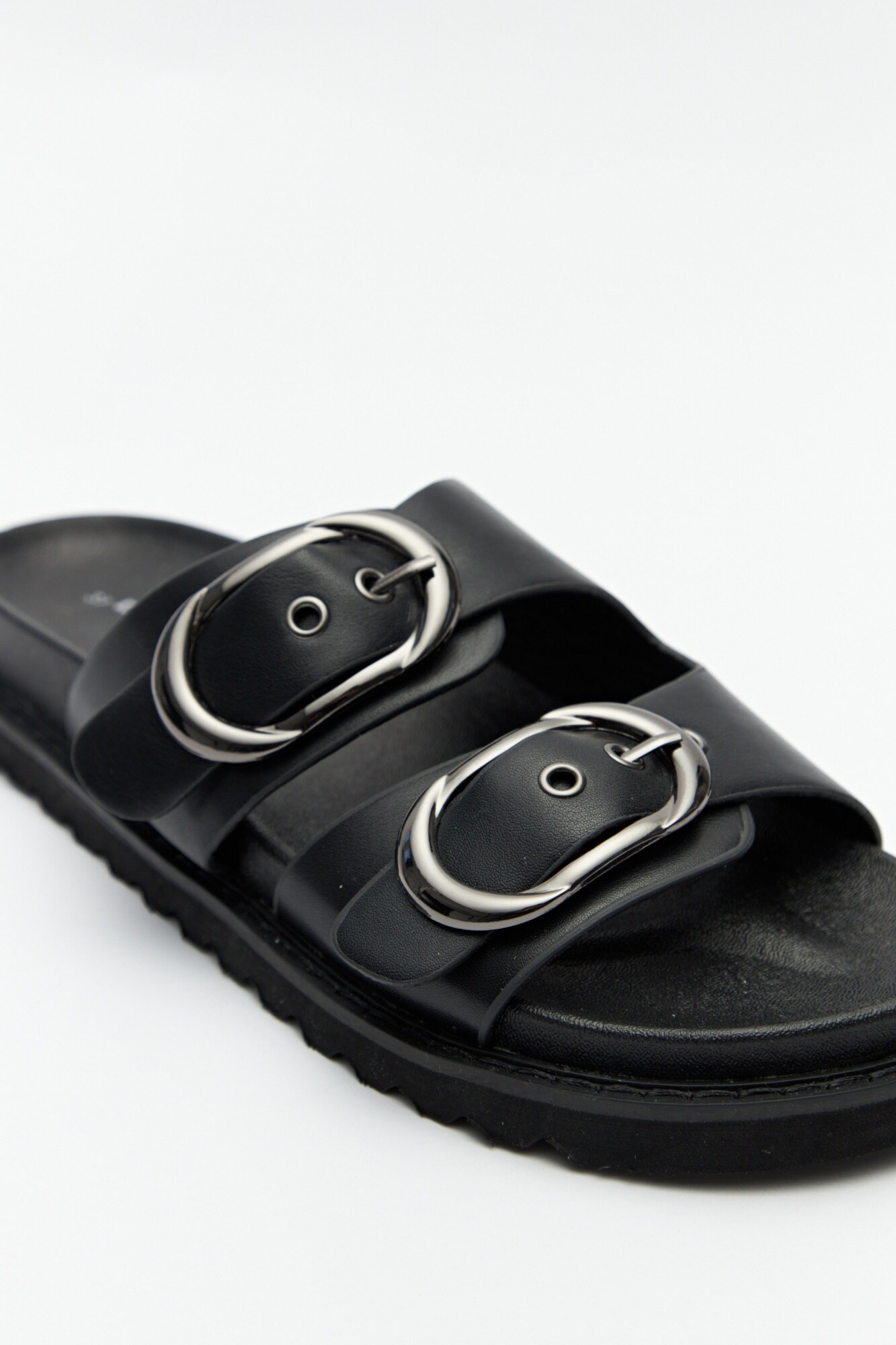 Sandalias bajas de doble tira ajustable con grandes hebillas metálicas.