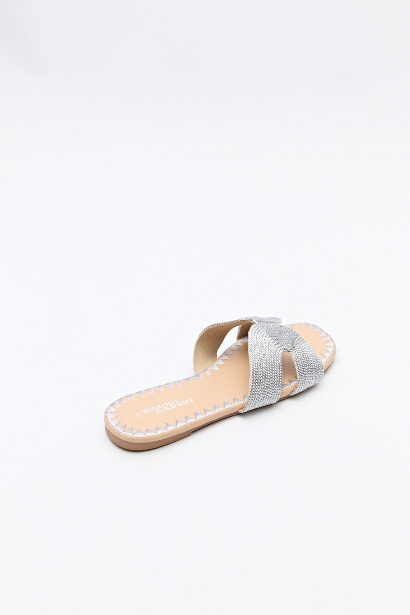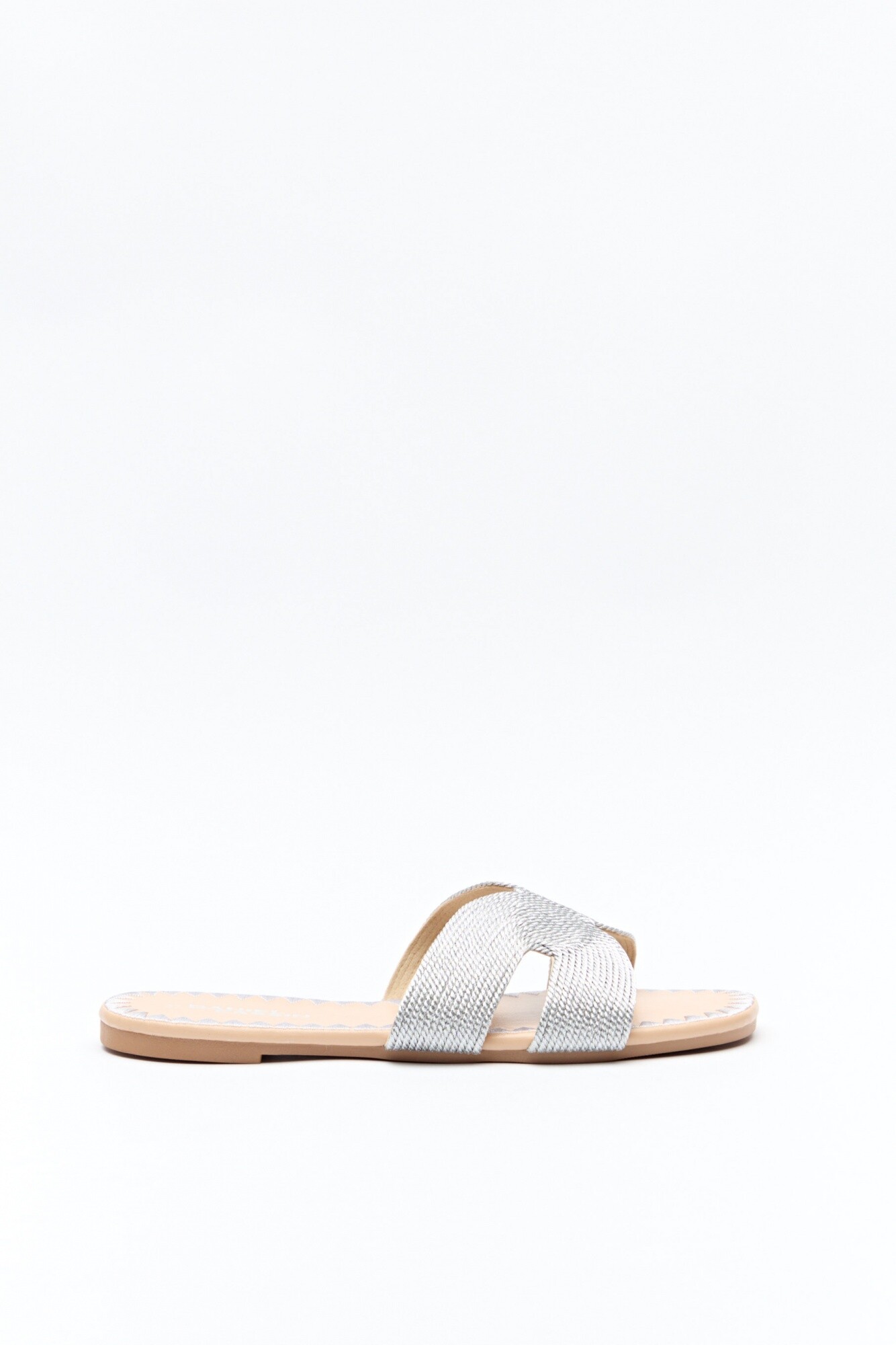 Sandalia baja con capellada trenzada tipo cordón, de textura artesanal y diseño envolvente. La suela presenta un delicado bordado a tono, que realza el acabado y suma un detalle distintivo al modelo. Ideal para completar looks de verano con un aire natural y femenino.
