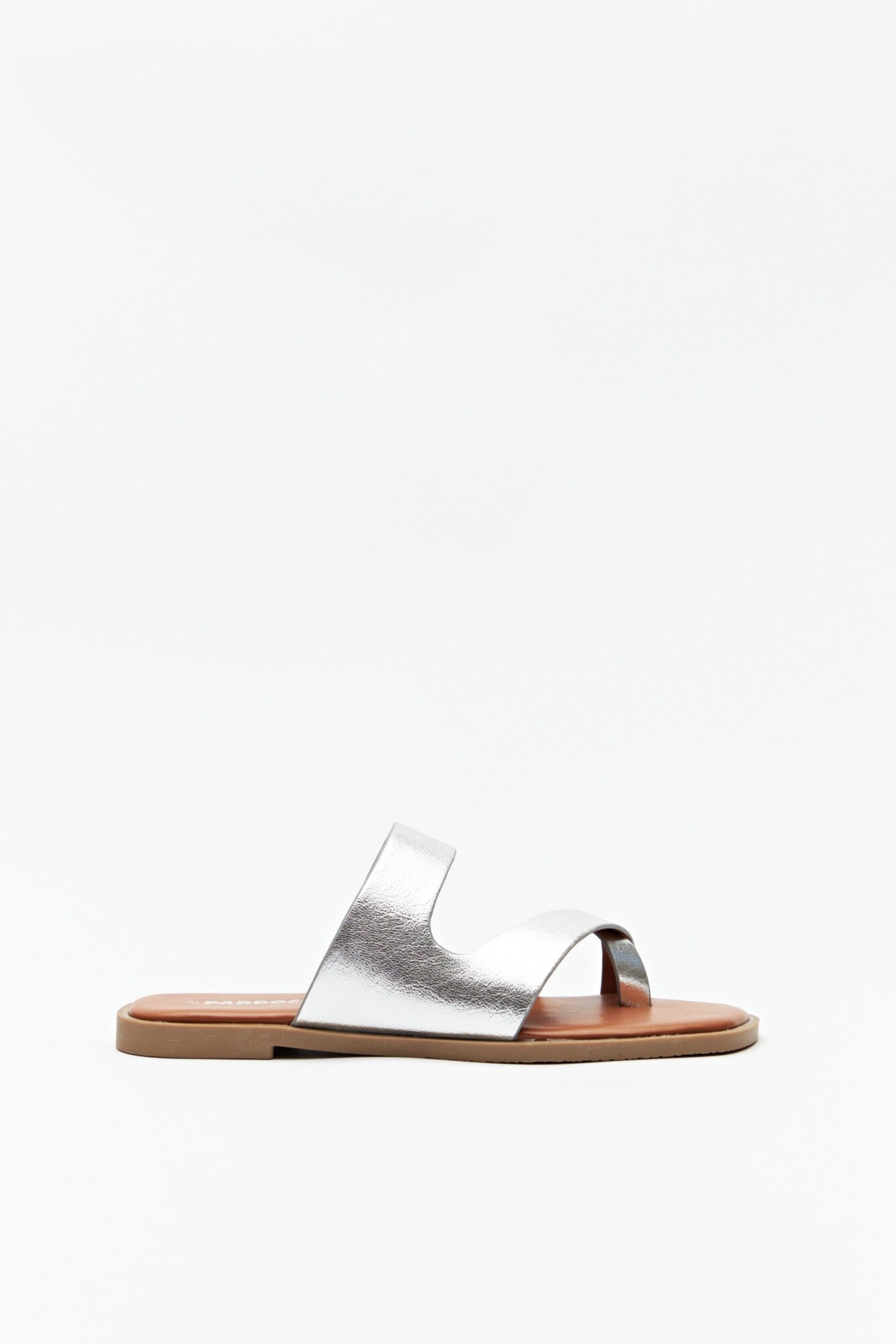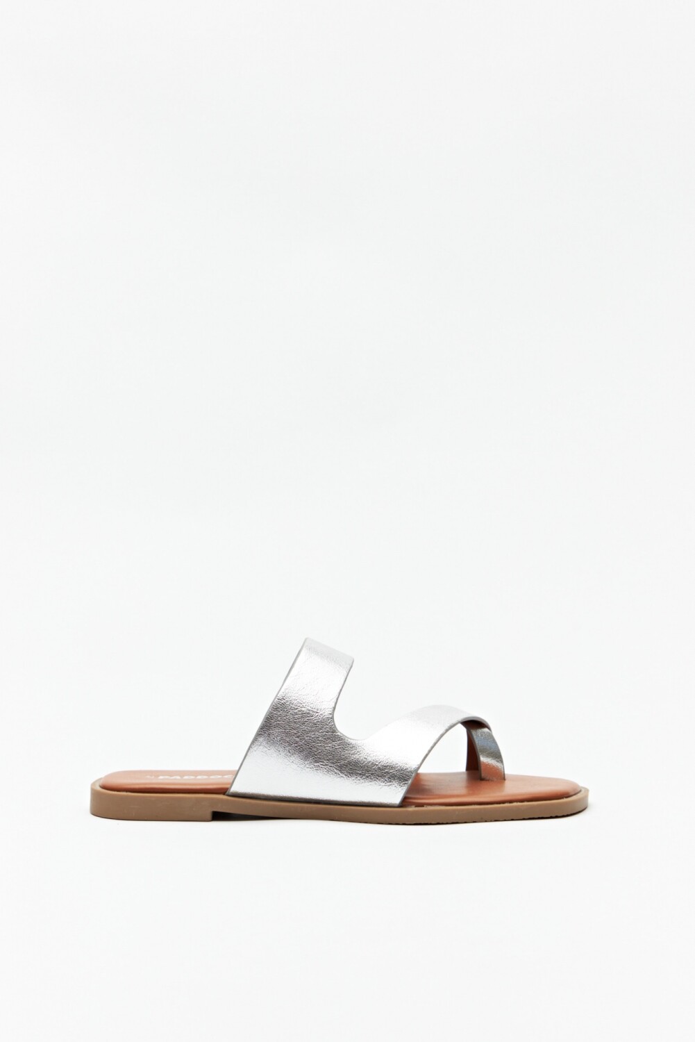 Sandalias bajas abiertas en símil cuero con capellada en símil cuero y agarre del dedo gordo.
