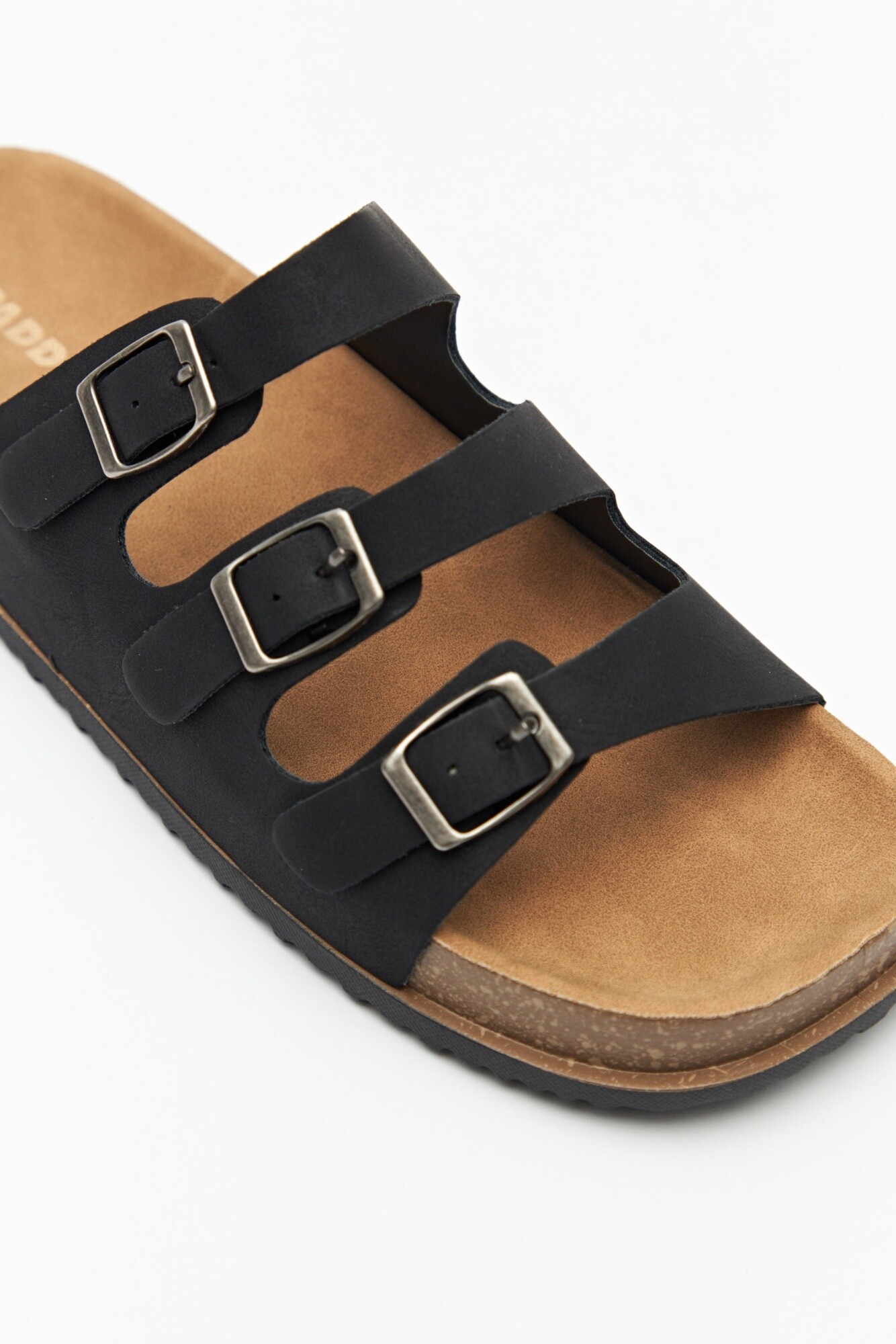 Un básico para todo el verano!Sandalias con base de corcho y triple tira ajustable de gamuza y hebillas metálicas.