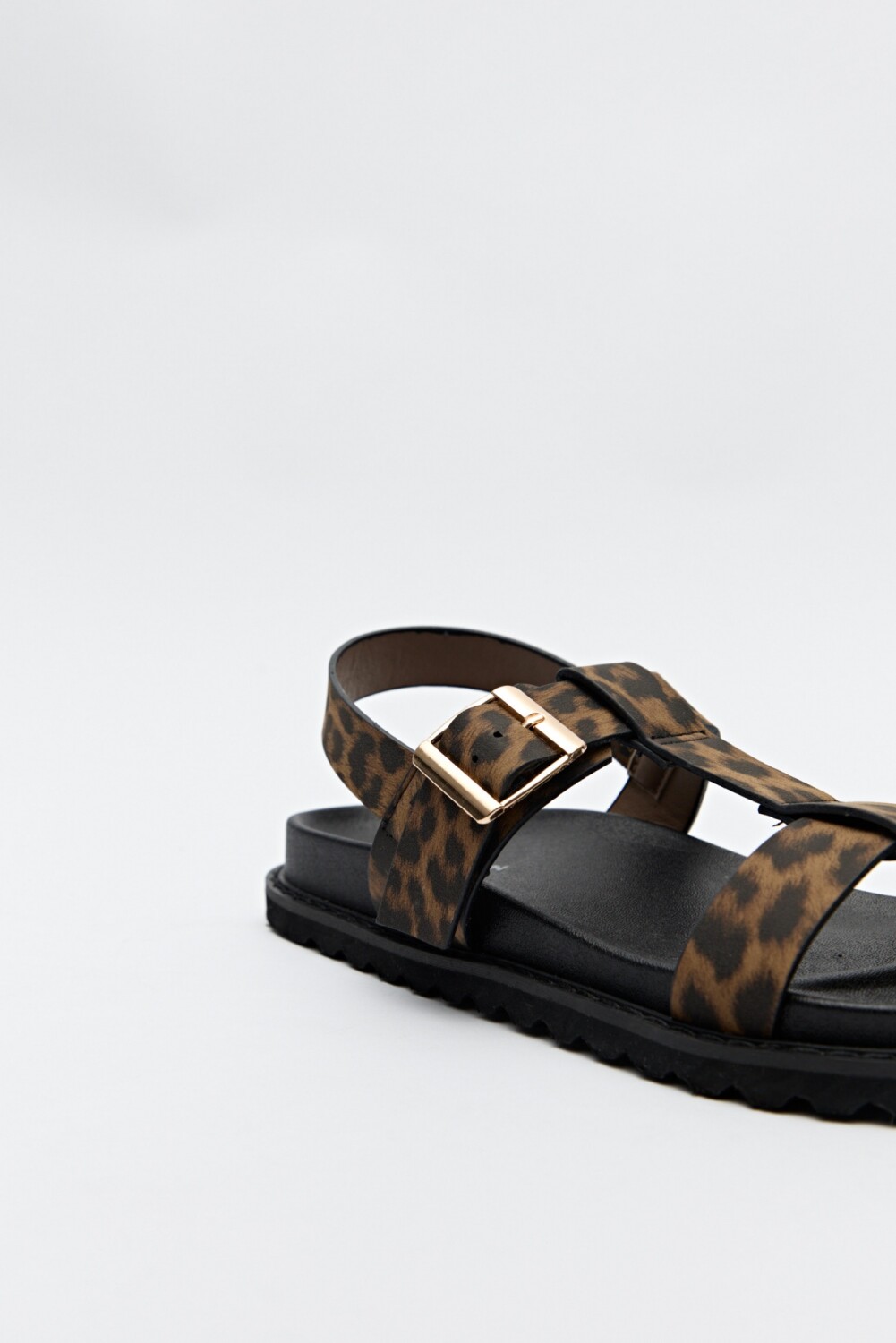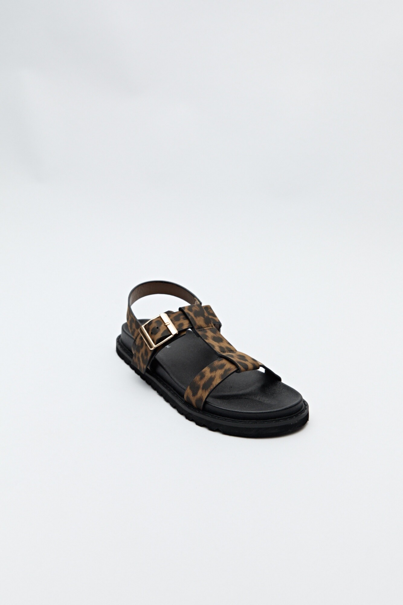 Sandalia plana con base de goma dentada y tiras anchas con estampado animal. El diseño incluye una hebilla metálica ajustable que aporta un toque moderno y funcional, asegurando un calce cómodo y firme. Su planta acolchonada brinda confort durante todo el día, ideal para sumar un toque canchero a tus looks de verano, desde los más casuales hasta los más urbanos.