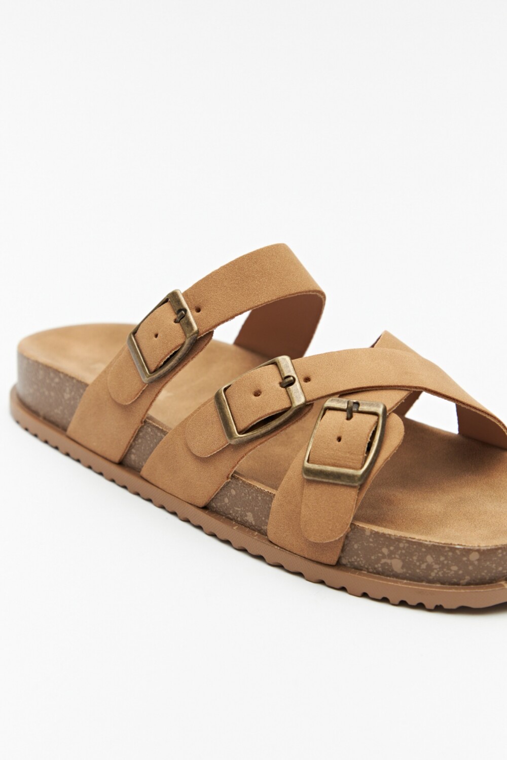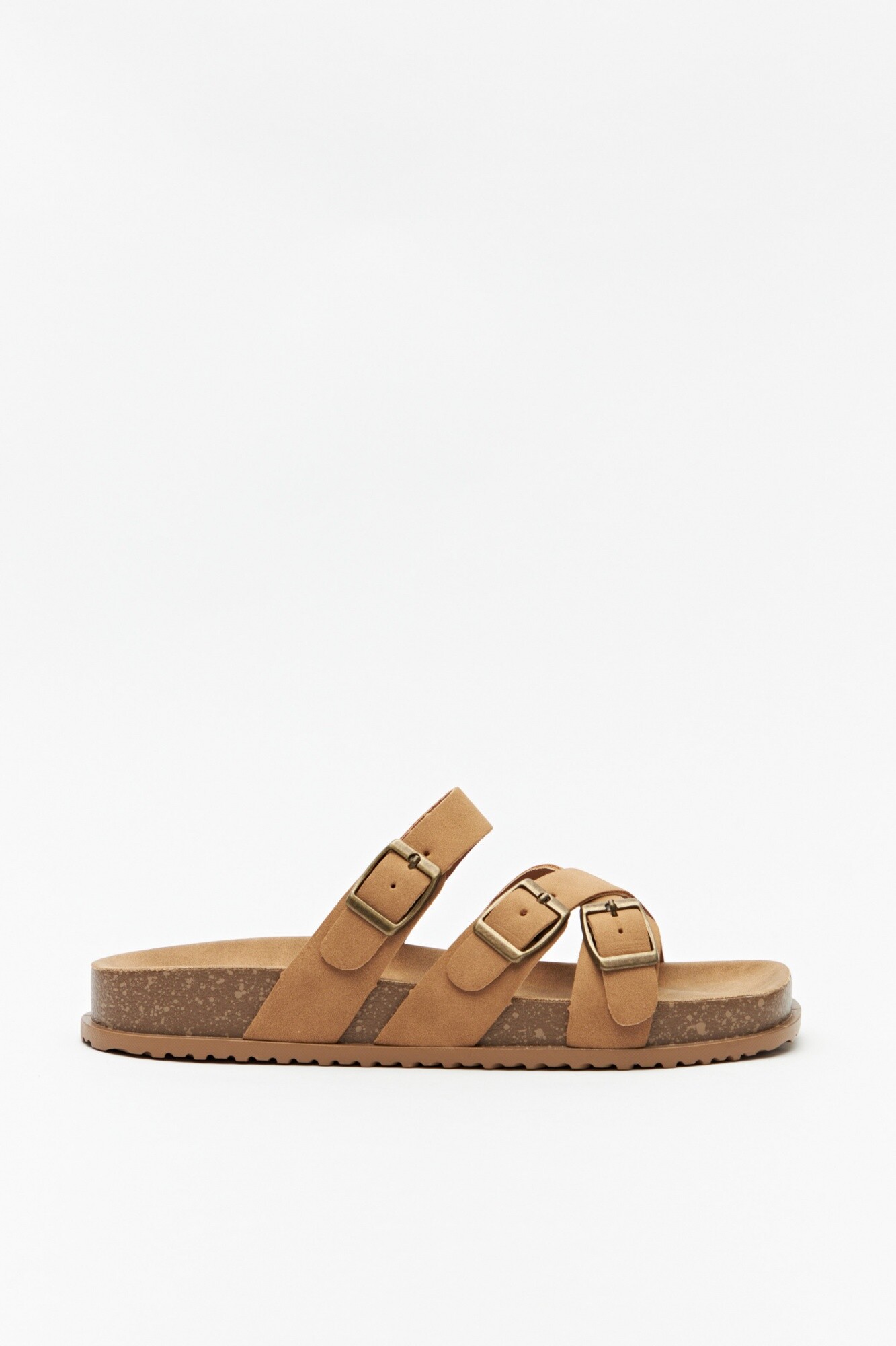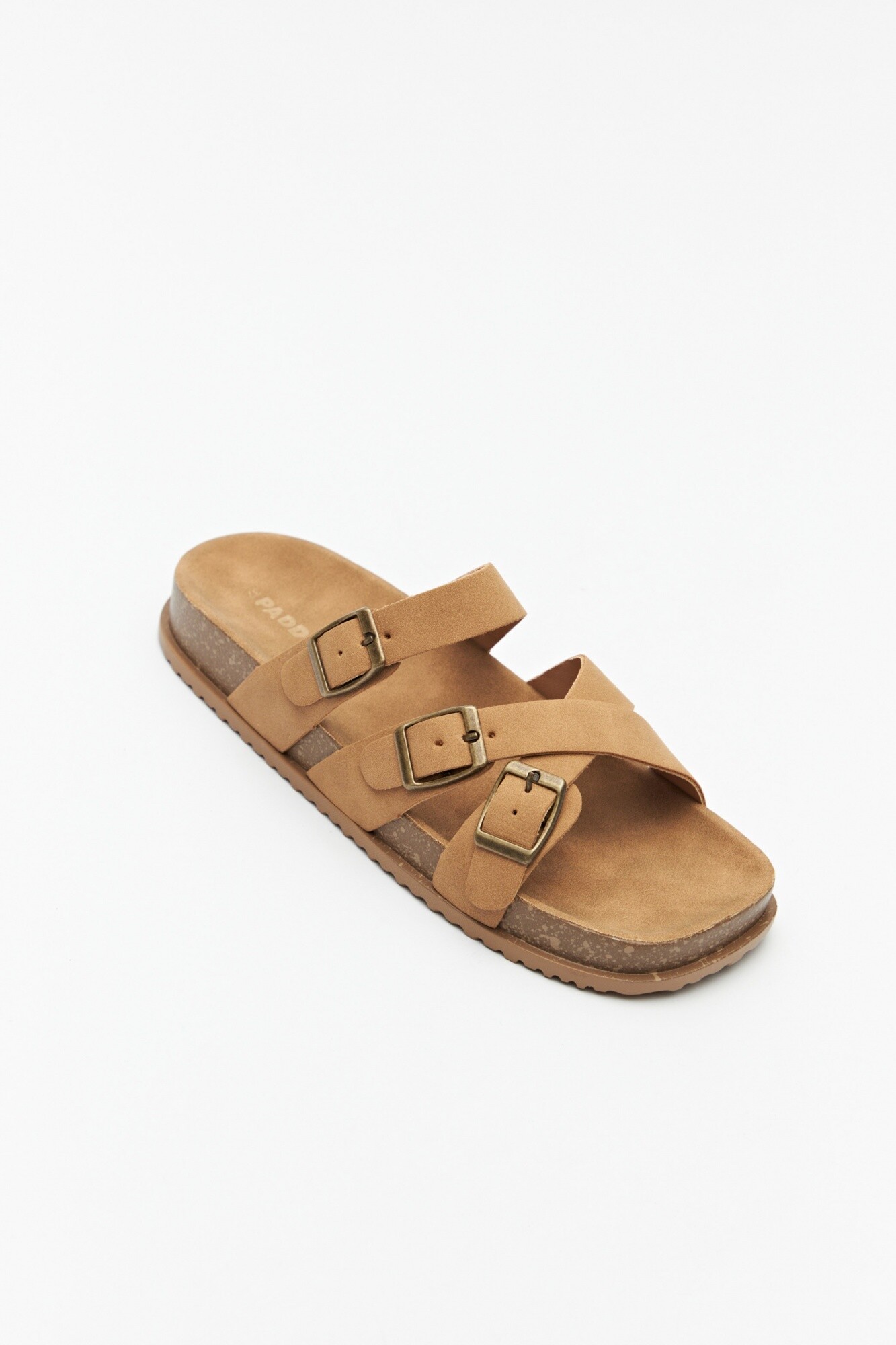 sandalias de plataforma con suela de corcho amortiguadora de 3cm de alto. Tiras cruzadas de gamuza con hebillas metálicas ajustables.