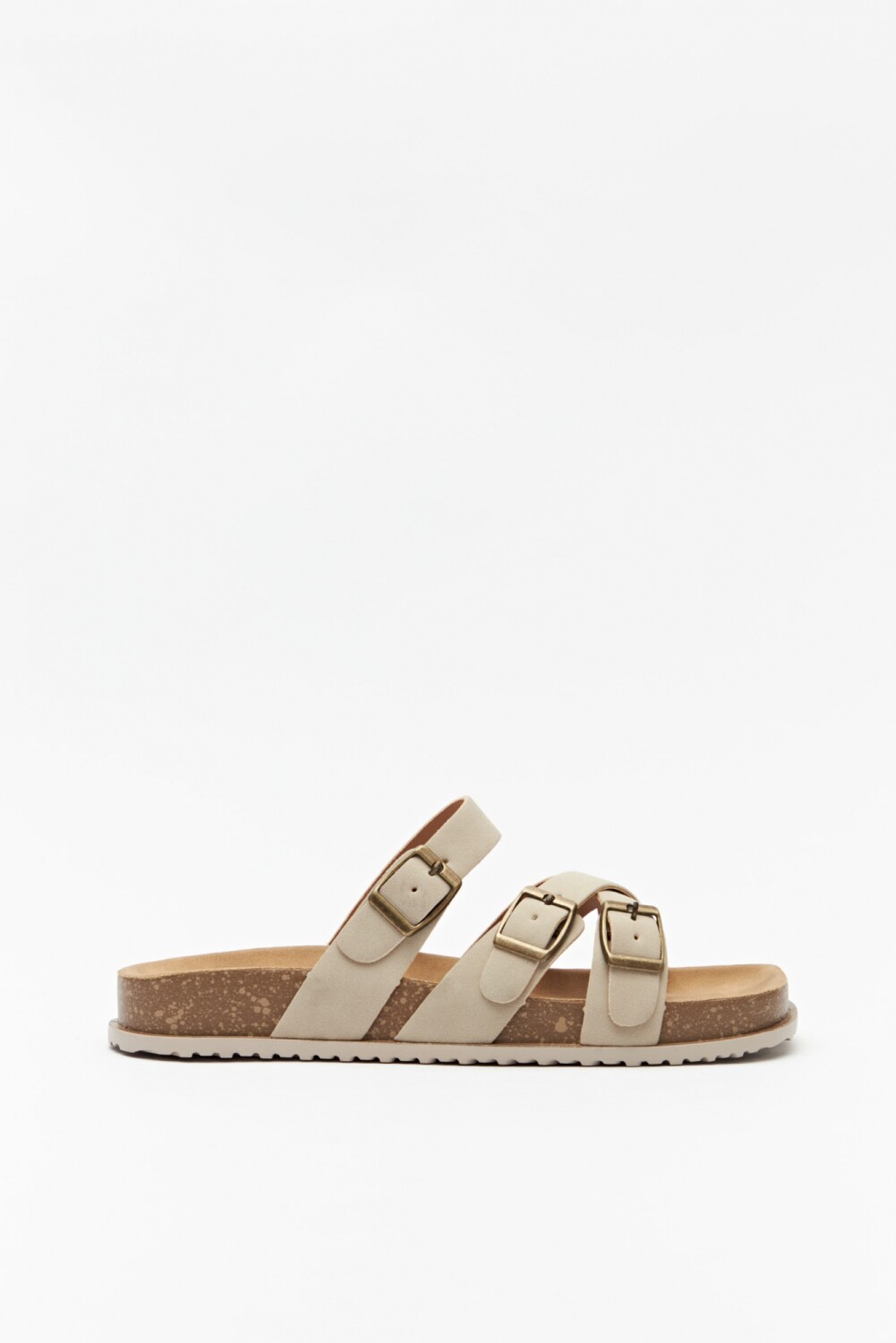 sandalias de plataforma con suela de corcho amortiguadora de 3cm de alto. Tiras cruzadas de gamuza con hebillas metálicas ajustables.