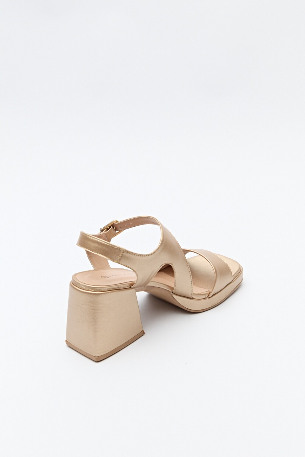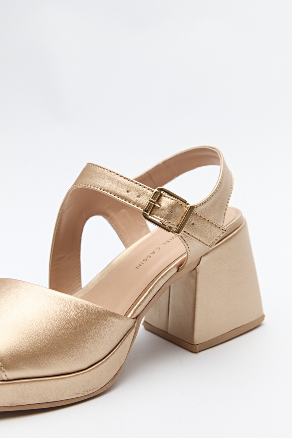 Sandalias con plataforma fina y taco ancho forrado, que ofrece altura con total estabilidad. Incorporan pulsera con hebilla metálica y capellada ancha que asegura el pie. Un modelo ideal para looks de noche o eventos donde el brillo se vuelve protagonista.