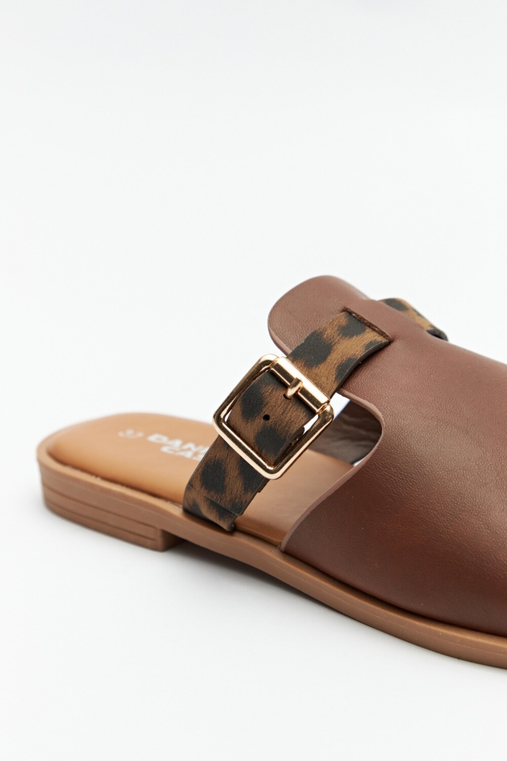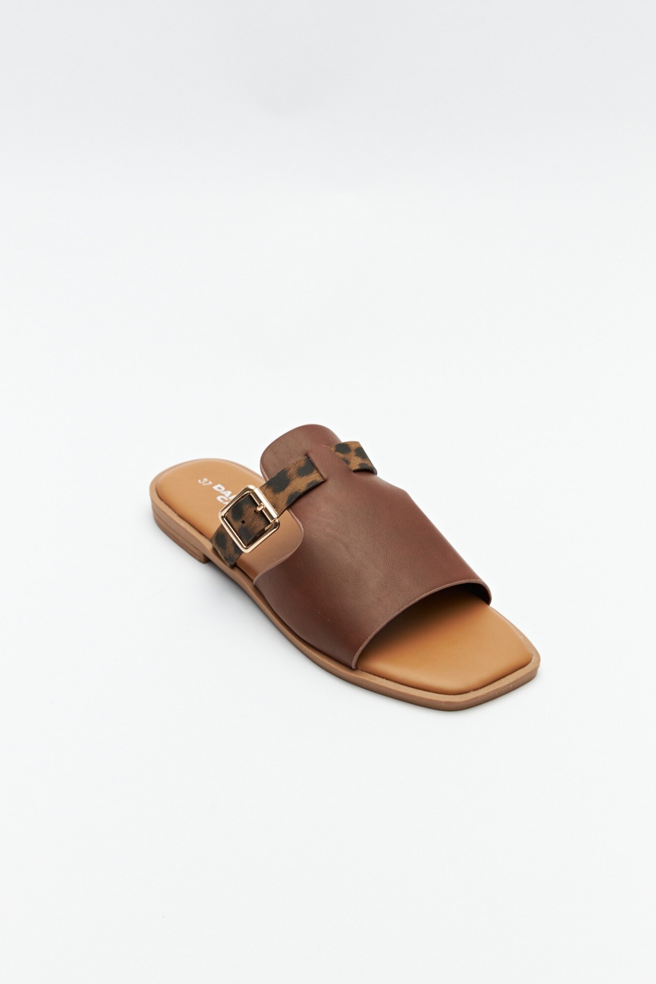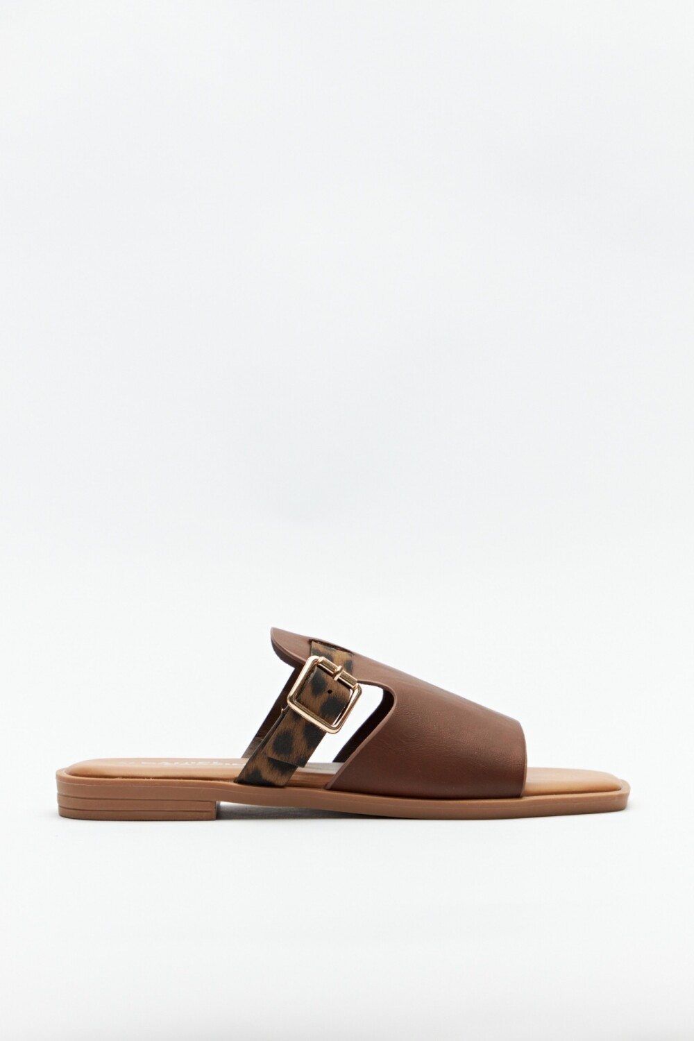 Sandalias bajas de suela acolchonada y pequeño taco de 2cm de alto. Su capellada es en símil cuero texturizado con tira en animal print y hebilla ajustable.