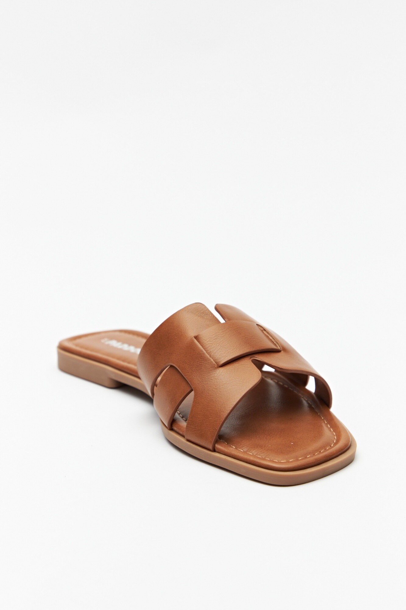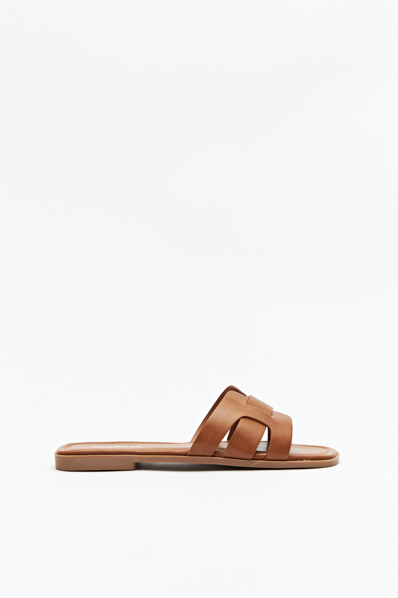 20 Sandalias bajas abiertas en símil cuero con capellada entrelazada.