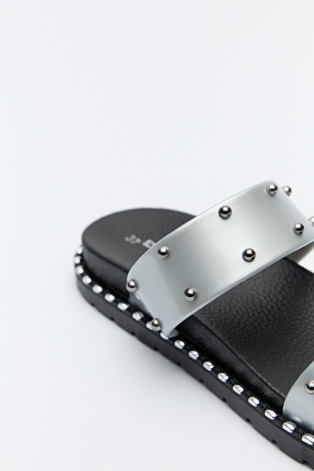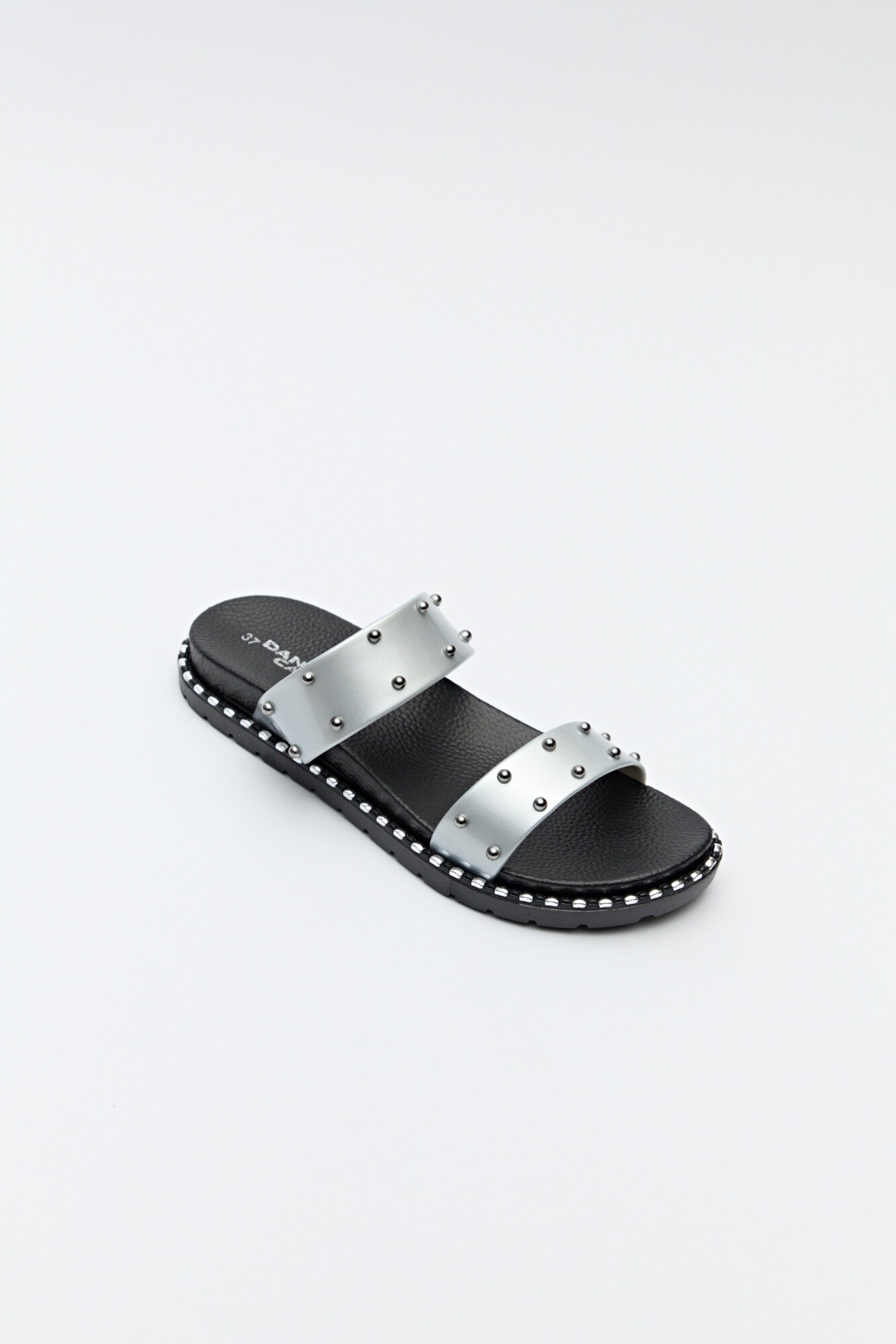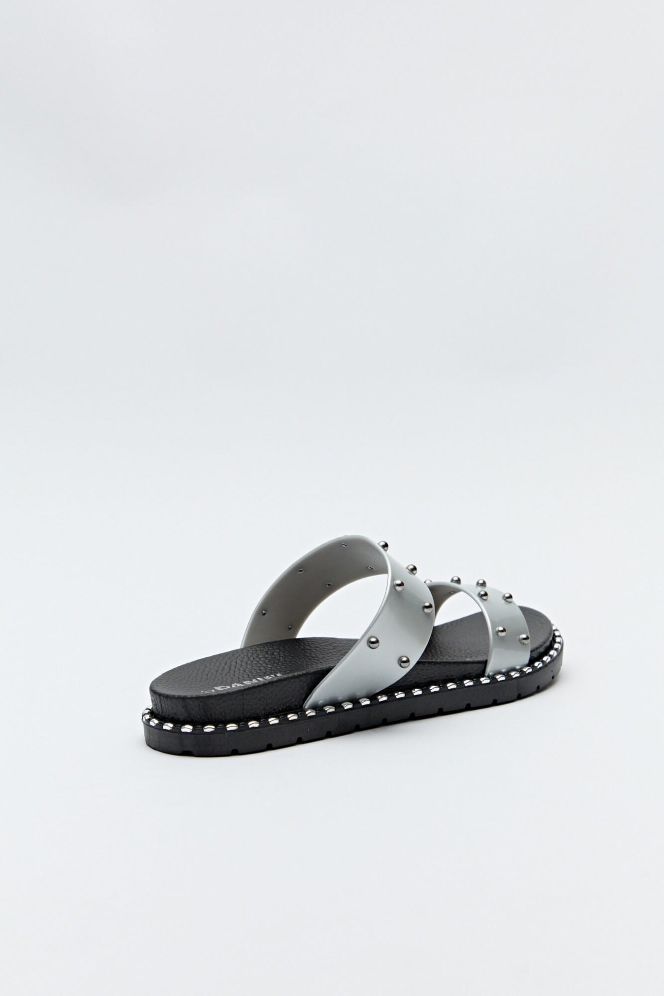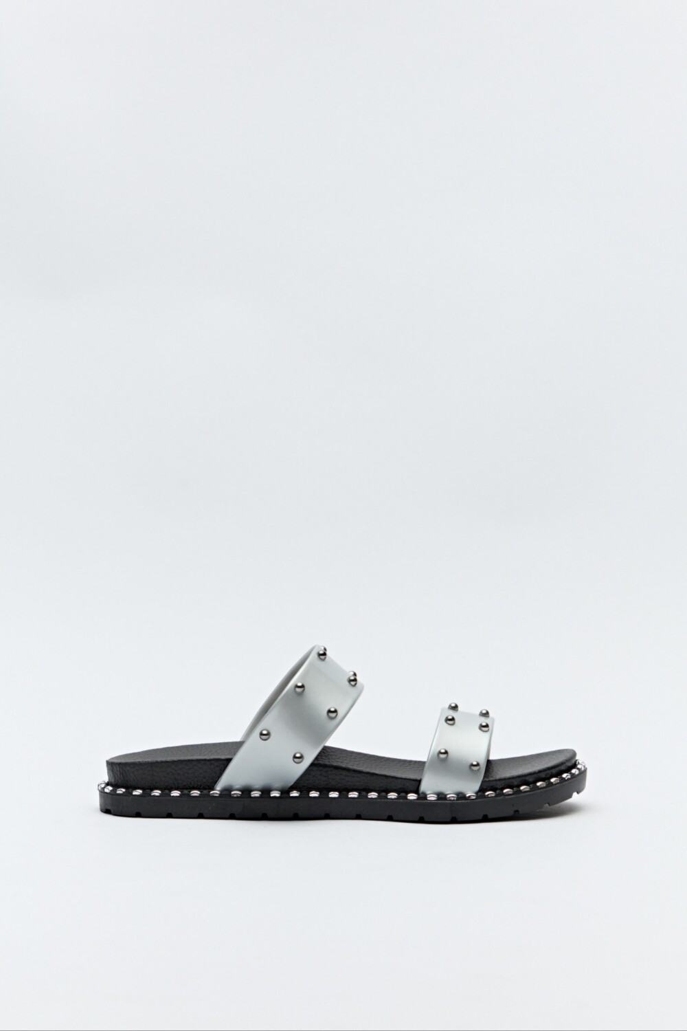Con personalidad y estilo, estas sandalias se destacan por sus tiras anchas con microtachas metálicas y borde con detalles a tono que realzan el diseño. Su base con volumen leve y textura antideslizante garantiza confort sin perder actitud.