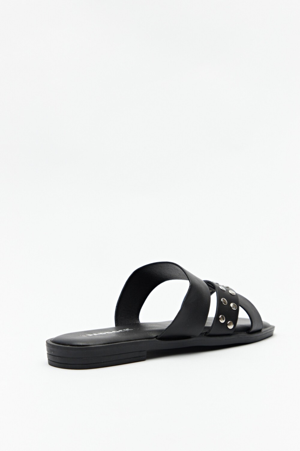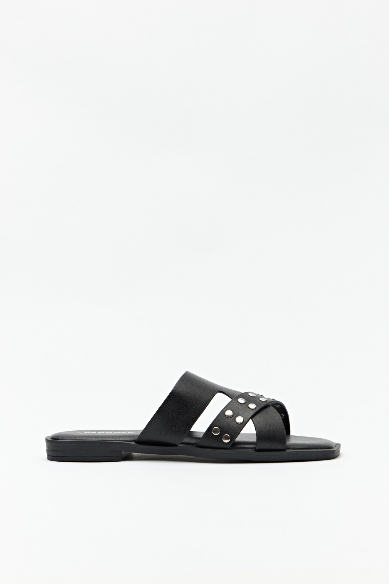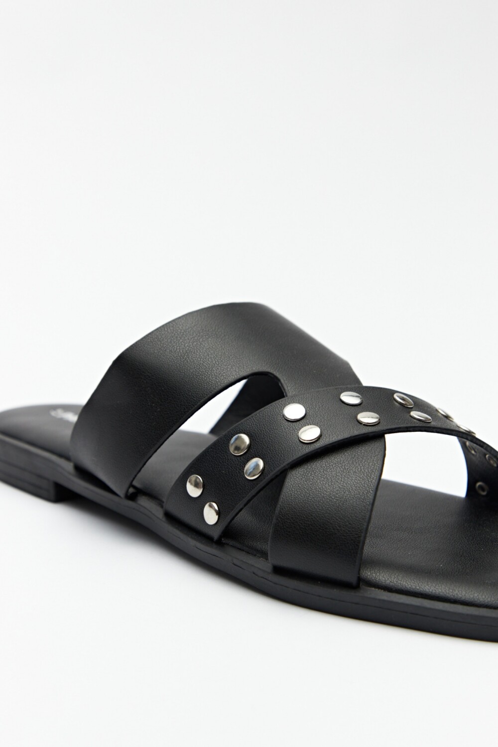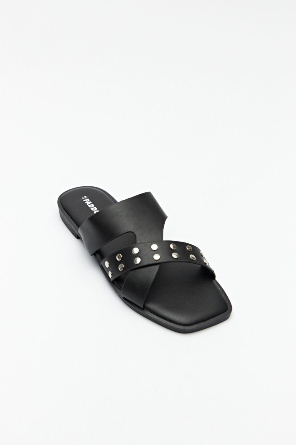 Sandalias bajas abiertas en símil cuero. Su capellada es de tiras asimétricas con apliques de tachas. Su suela es realmente cómoda y son una opción cómoda y elegante para los días de calor.