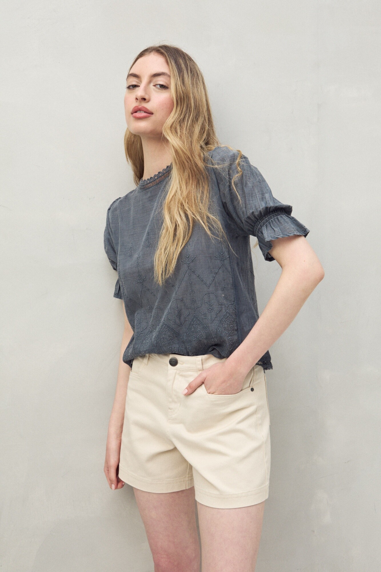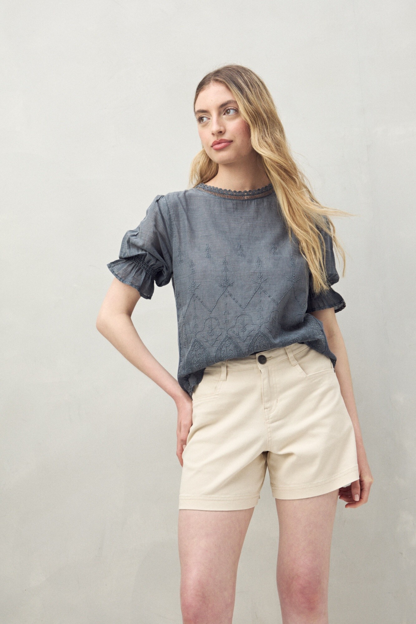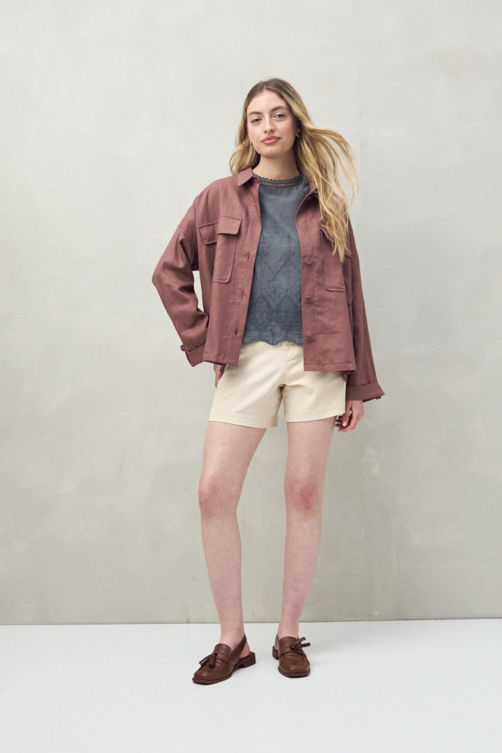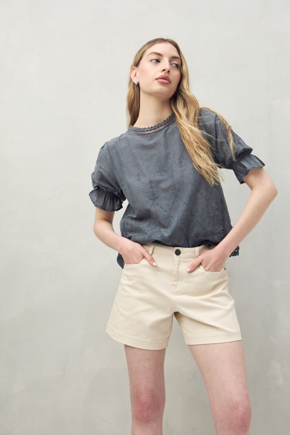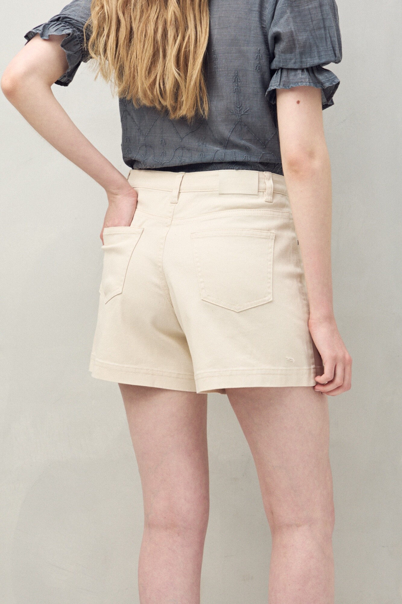 20 Short de algodón con diseño clásico de cinco bolsillos y terminación limpia. Su tiro medio y estructura ligeramente rígida lo hacen un básico atemporal para los días cálidos. Ideal para combinar con blusas ligeras o camisas relajadas y lograr un look casual sin esfuerzo.