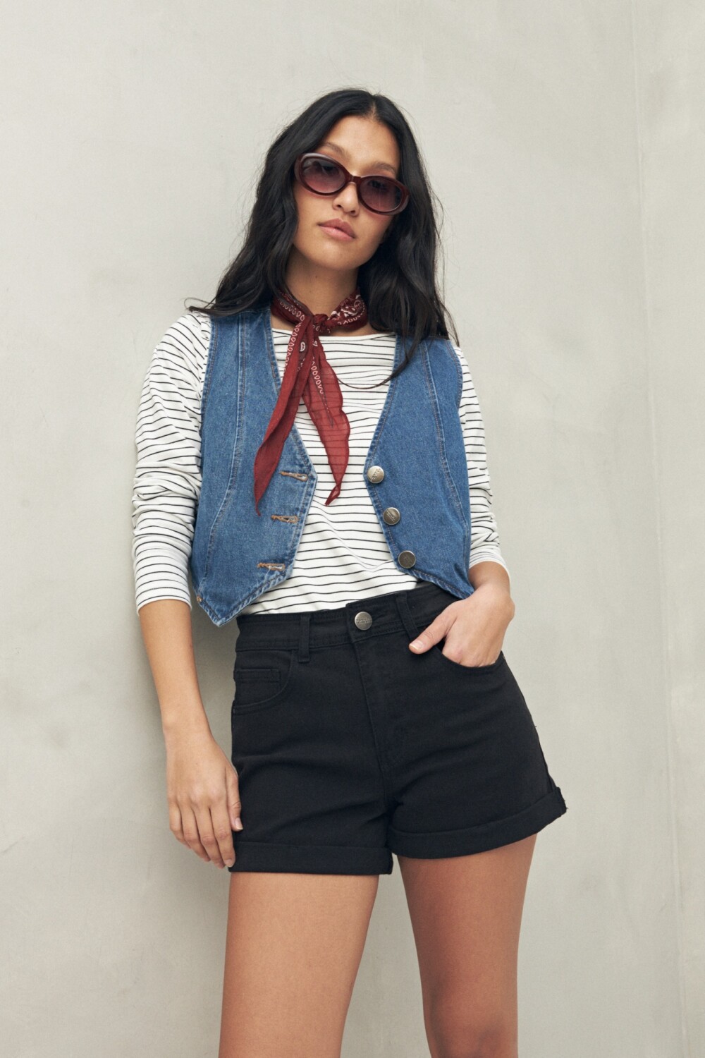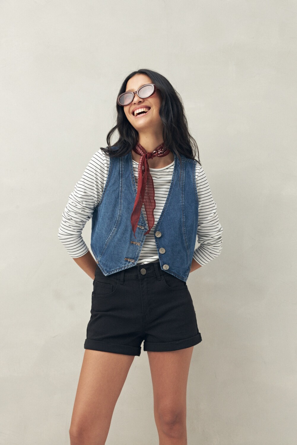 Short de denim con dobladillo fijo y bolsillos delanteros y traseros que suman practicidad al diseño. Confeccionado en un textil con caída ligera y un toque de elasticidad, combina comodidad y estilo. Ideal para looks relajados de verano, ya sea con tops tejidos, camisas livianas o remeras básicas.