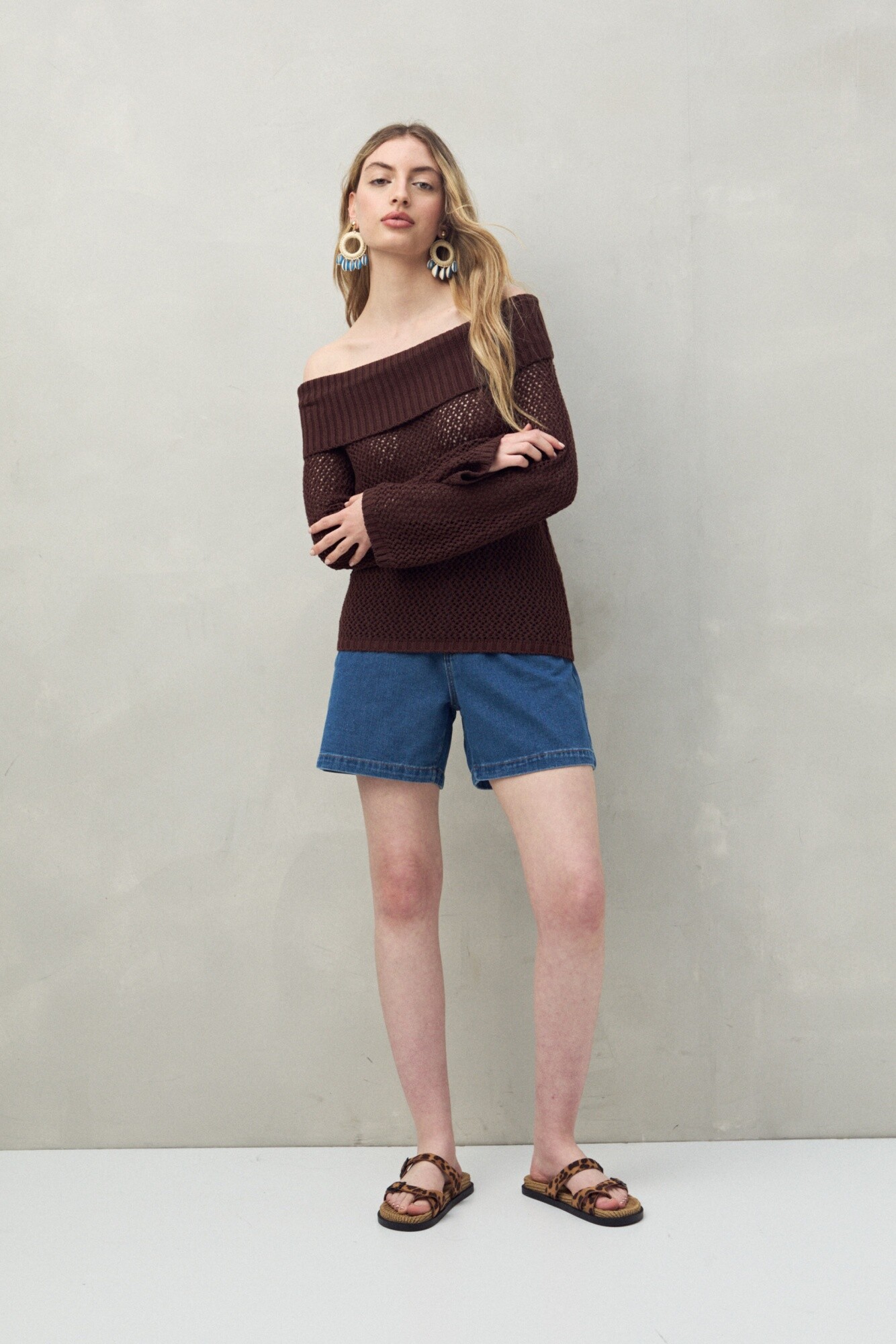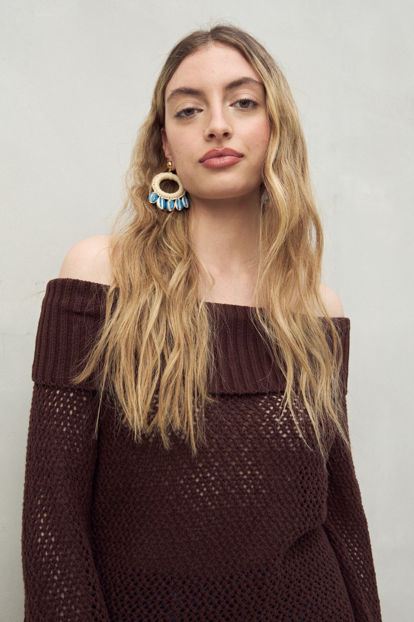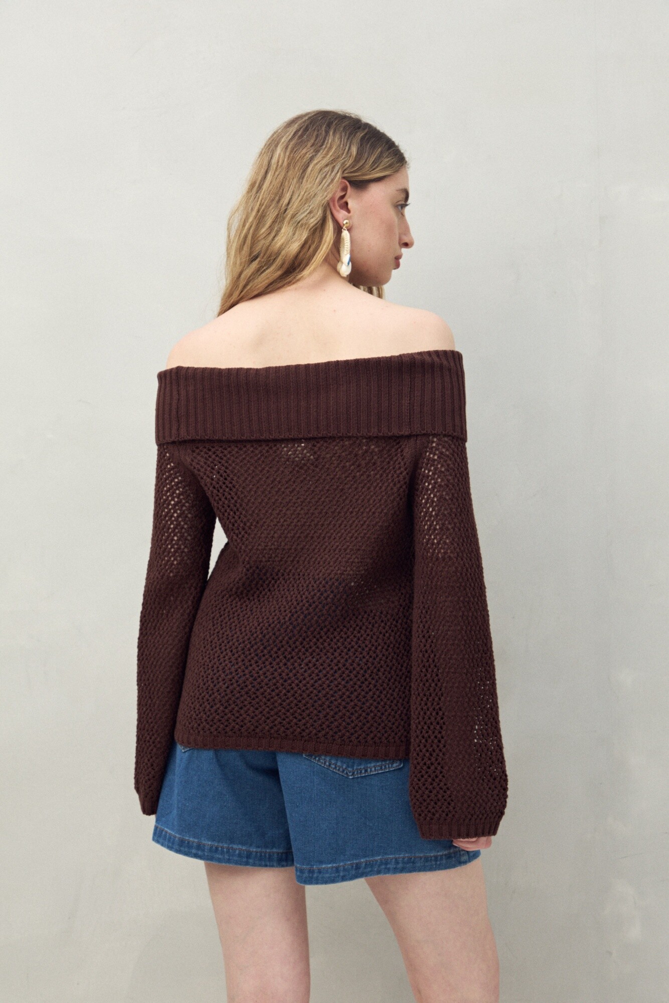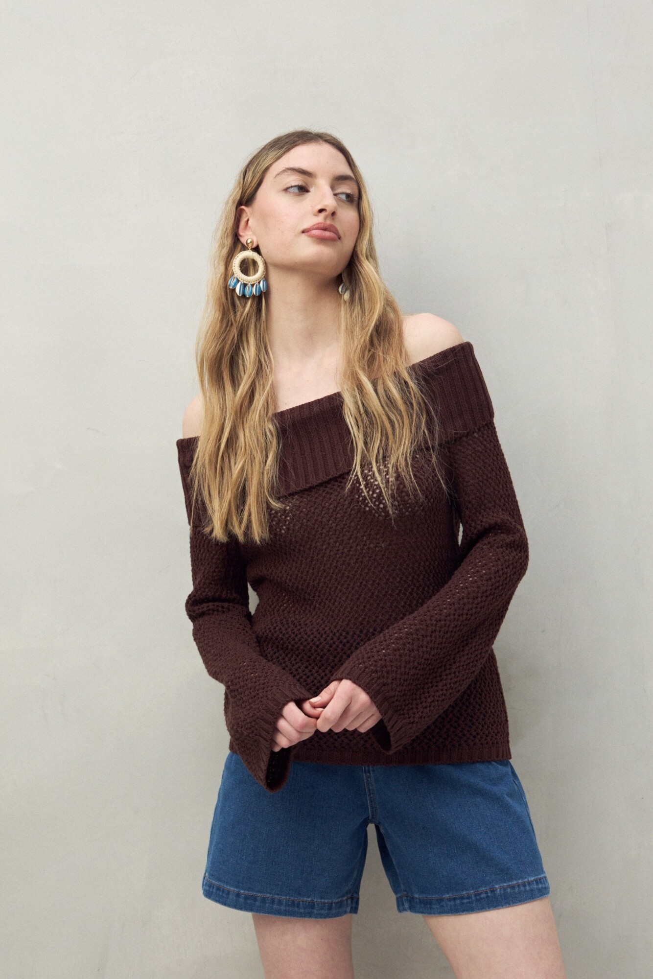Sweater calado de estilo femenino y relajado, con diseño off shoulder que aporta un toque sensual y moderno. Tejido liviano y fresco, ideal para los días de verano o para llevar a la playa. Sus mangas acampanadas agregan un detalle bohemio y sofisticado, perfecto para un look relajado con estilo.