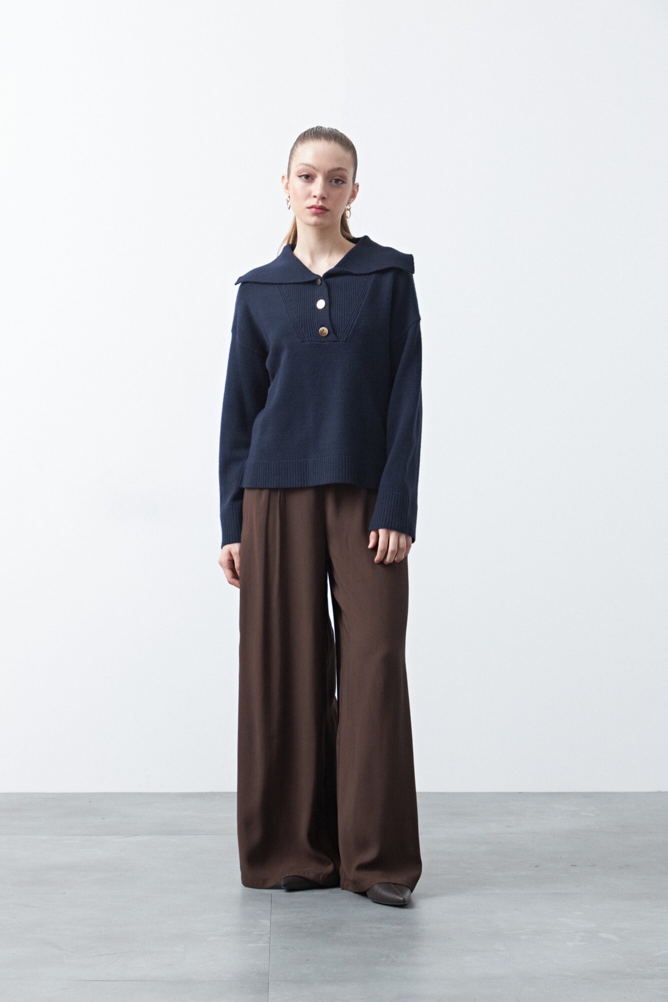Sweater de tejido suave, de silueta relajada y diseño cuidado en los detalles. Presenta grandes botones metalizados en el frente que aportan carácter y un aire sofisticado, mientras que las mangas levemente acampanadas suman movimiento y un toque actual. El corte con pequeñas aberturas laterales mejora el calce y aporta comodidad, convirtiéndolo en una pieza versátil que funciona tanto en looks urbanos como en propuestas más pulidas.