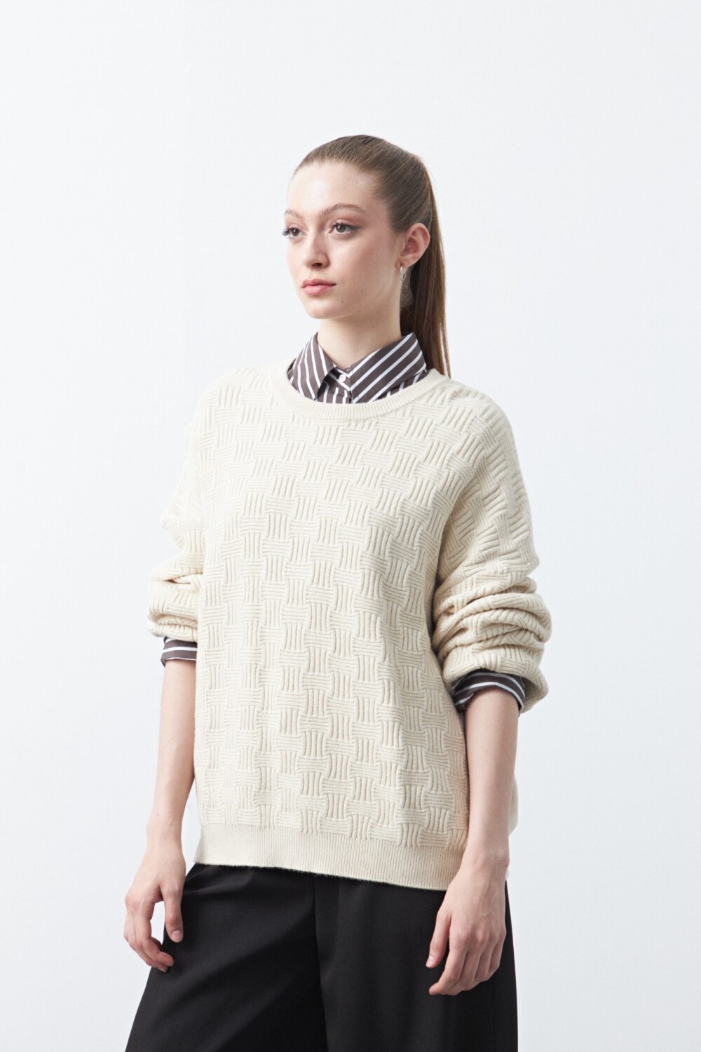 Sweater tramado, de diseño clásico y textura protagonista que aporta profundidad visual y un acabado cuidado. El tejido con relieve genera un efecto sutil pero distintivo, elevando la prenda más allá de un básico tradicional. De calce cómodo y líneas limpias, es una opción versátil que funciona tanto en looks urbanos como en combinaciones más prolijas, ideal para sumar interés al outfit sin perder elegancia.