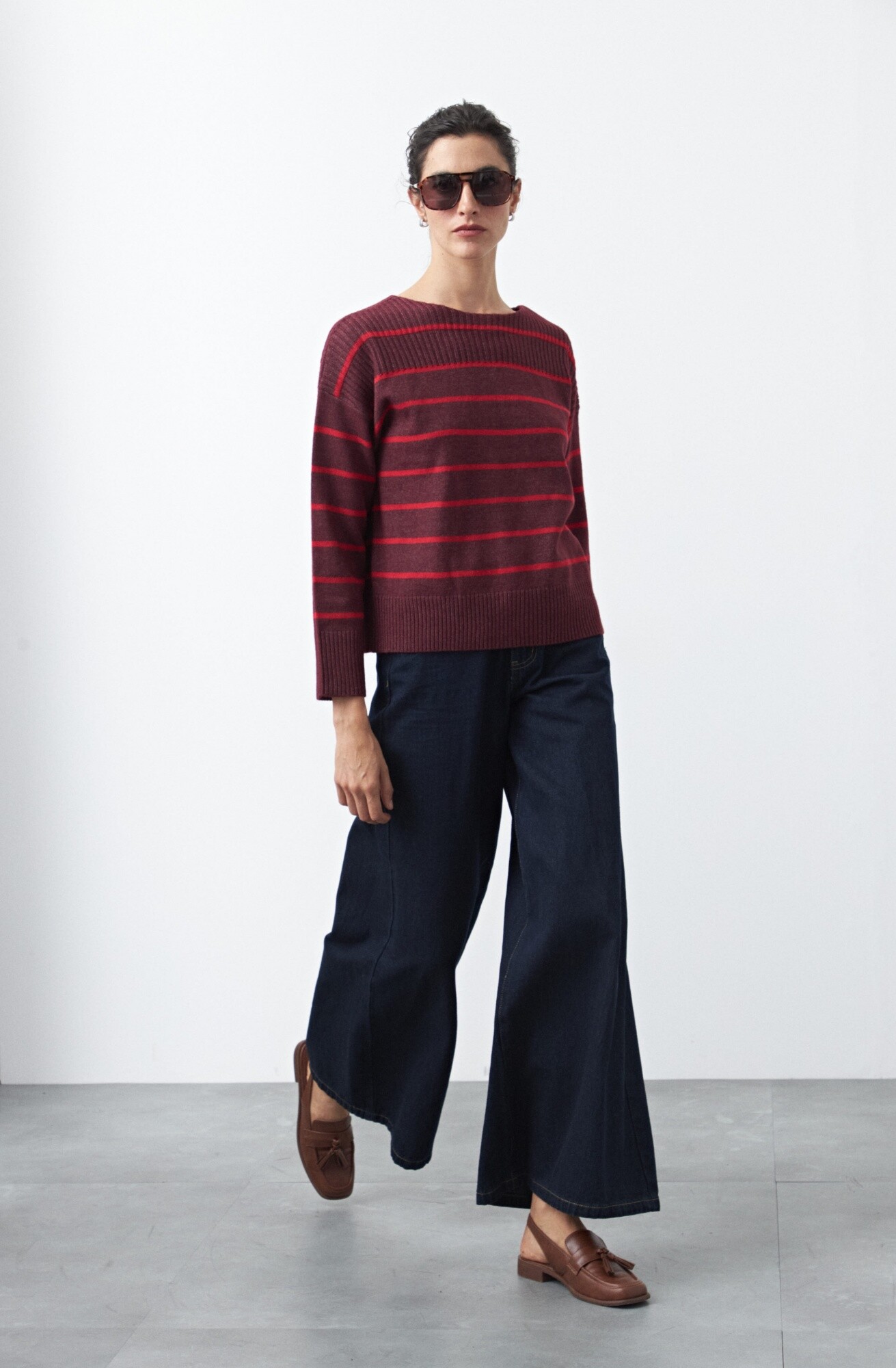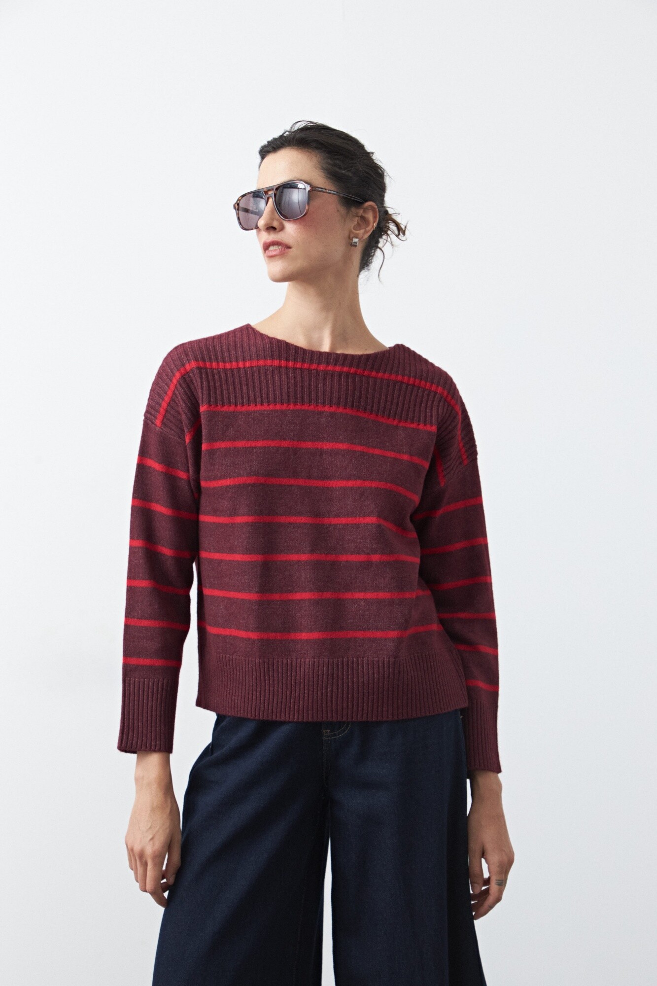 Sweater a rayas de manga larga, con diseño de líneas horizontales que aporta un aire clásico y versátil al look. Su silueta relajada y los hombros levemente caídos generan un calce cómodo y moderno, mientras que el cuello redondo, los puños y el ruedo acanalados suman estructura y terminaciones prolijas.