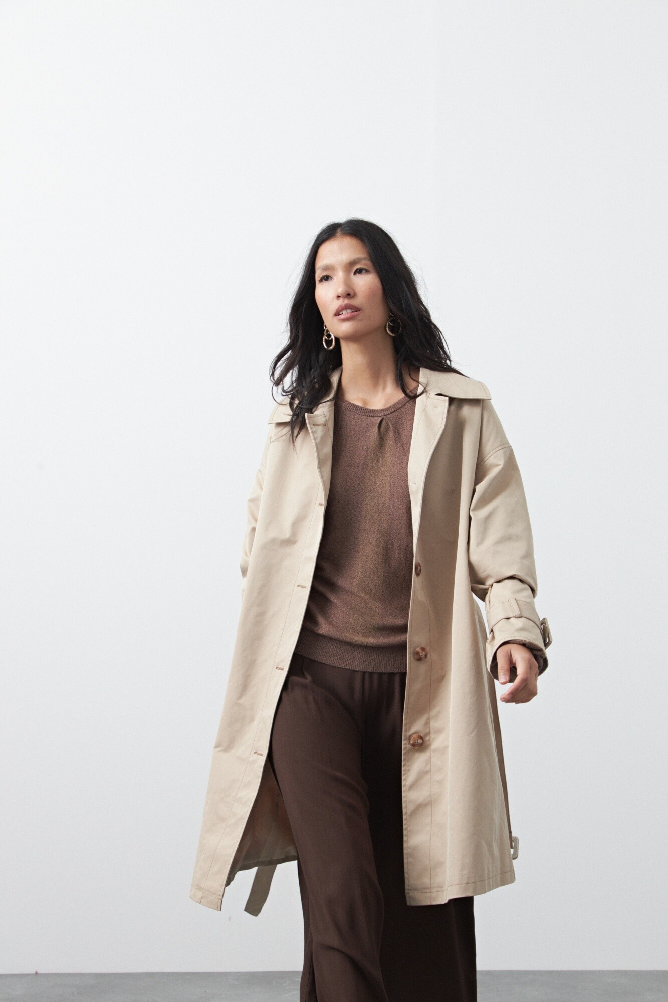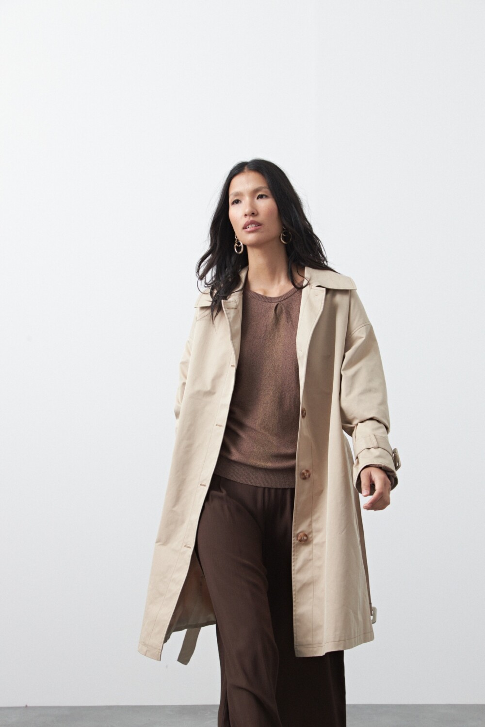 Sweater tejido a rayas que combina diferentes texturas para lograr un efecto visual sutil y moderno. Su diseño presenta cuello redondo y mangas amplias que aportan movimiento y una silueta relajada, mientras que el tejido con hilo metalizado suma un brillo delicado que eleva la prenda y la convierte en una opción ideal para looks de día o de noche.