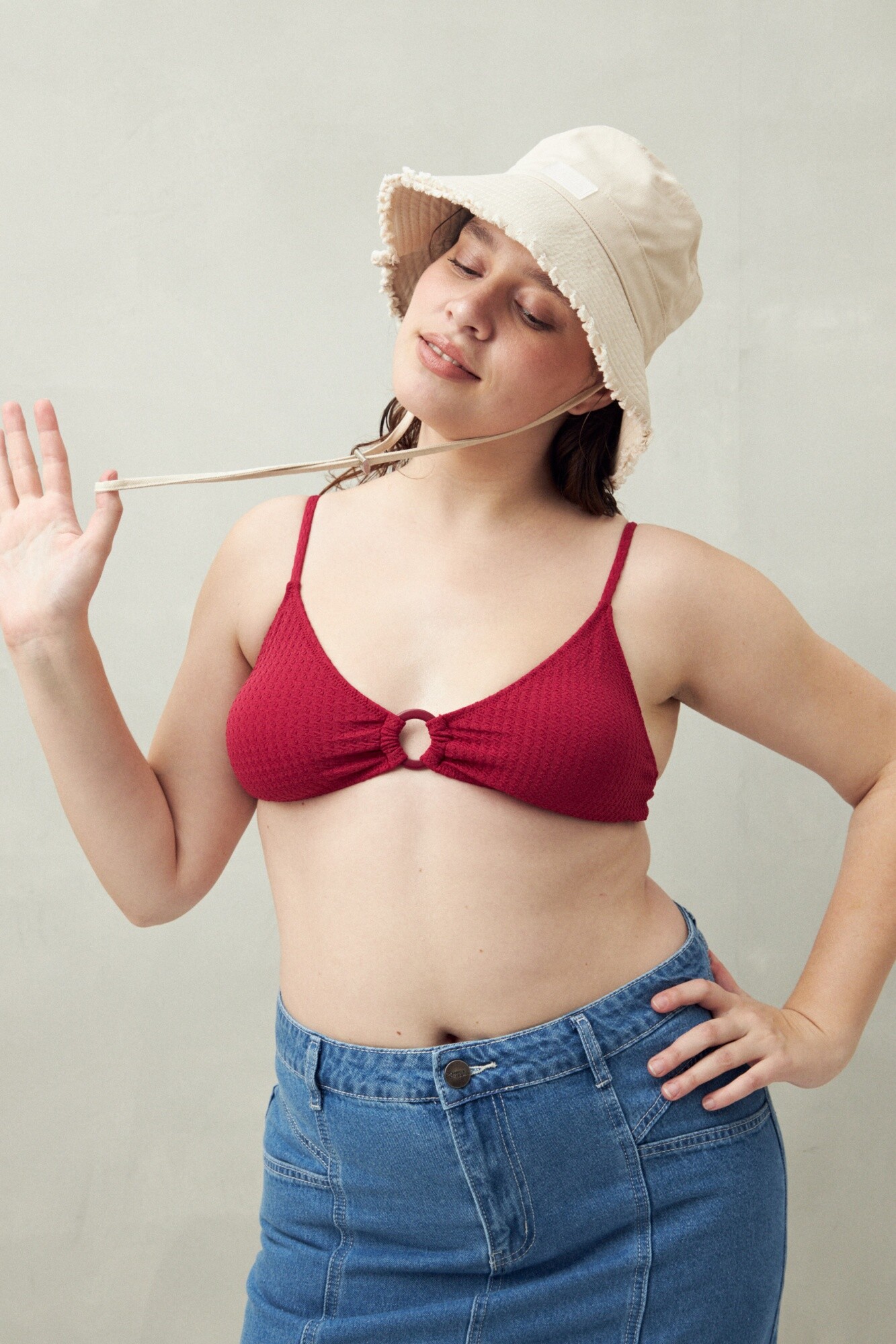 Bikini con textura diferenciada y detalle de aro central que realza el escote con un toque trendy. El lazo en la espalda permite ajustar el calce a medida, logrando un equilibrio entre estilo y comodidad.
