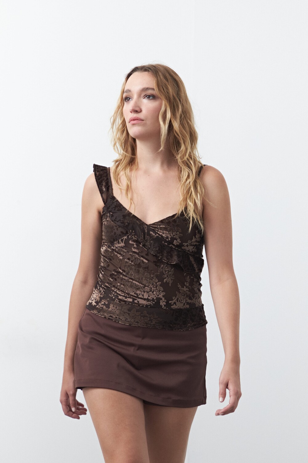Top sin mangas de inspiración nocturna, confeccionado en tejido liviano con textura aterciopelada que aporta un efecto visual sofisticado y elegante. Presenta escote en V con cruce frontal y breteles con leve volado que suman delicadeza al diseño, mientras que el calce entallado realza la silueta de forma cómoda gracias a su composición elastizada. Ideal para looks de noche o propuestas más arregladas, es una pieza clave para elevar cualquier look sin esfuerzo.