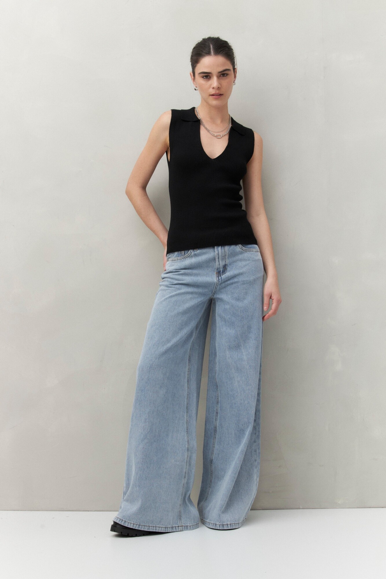 Top tejido sin mangas con escote en V y cuello tipo solapa, una combinación que realza el escote y aporta un aire elegante y moderno. Su tejido acanalado se ajusta suavemente al cuerpo, destacando la silueta sin perder comodidad. Ideal para combinar con pantalones sastreros o faldas largas y lograr un look pulido con toques contemporáneos.