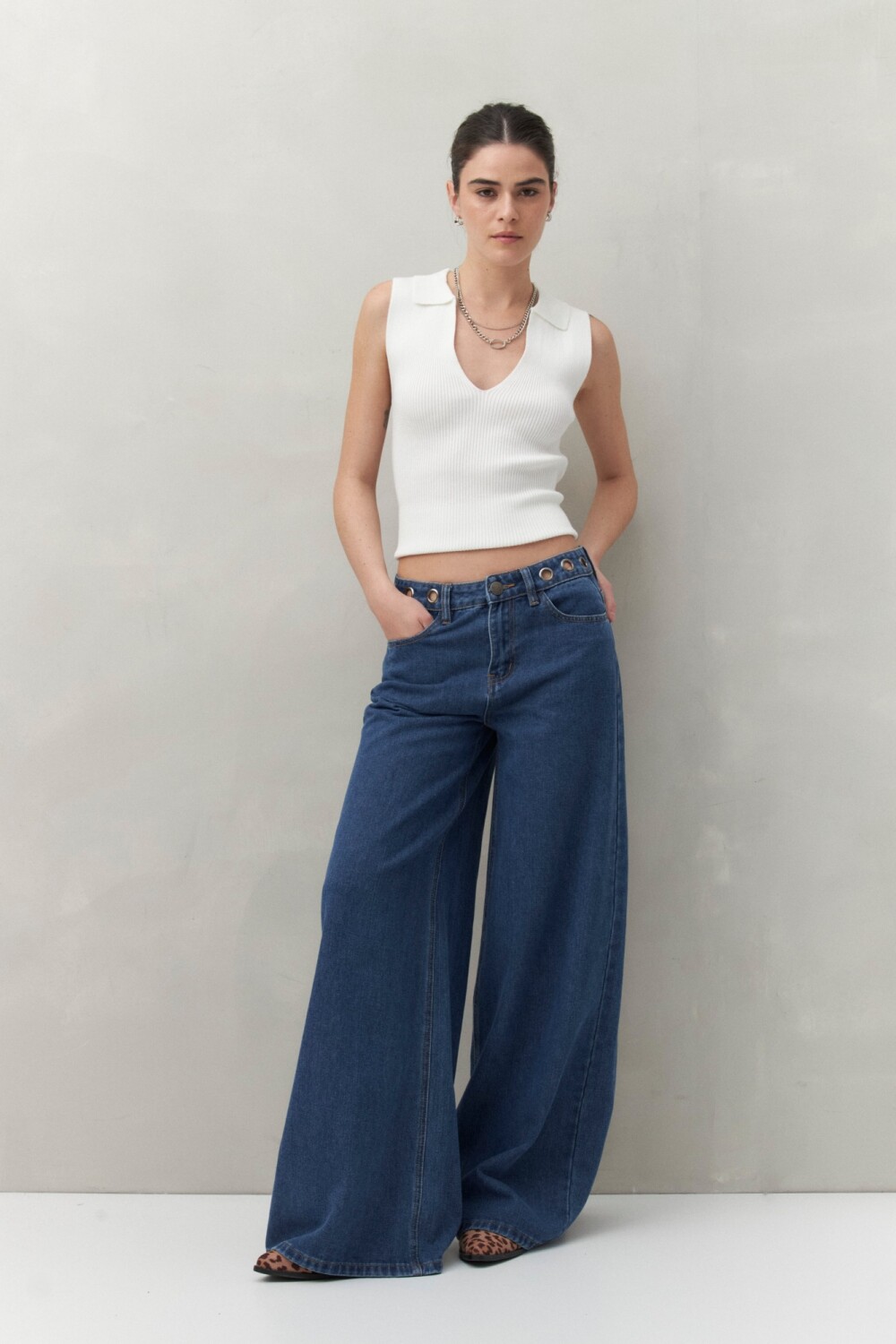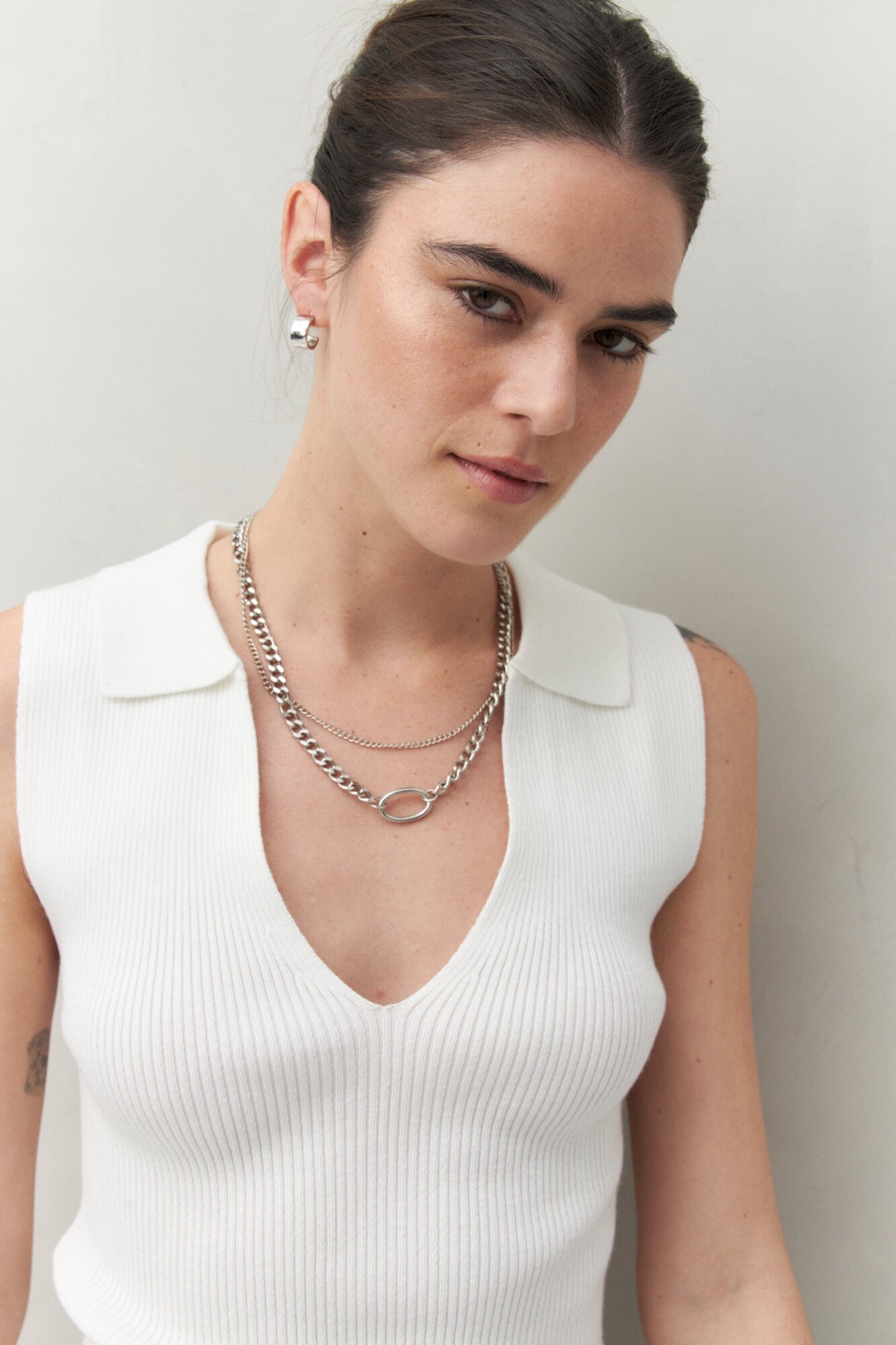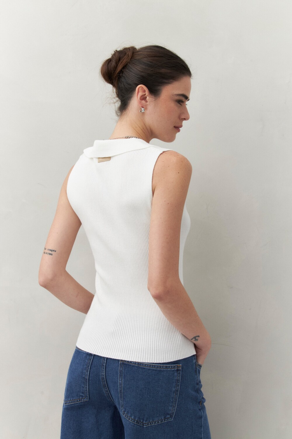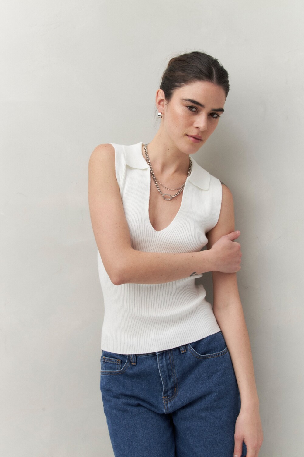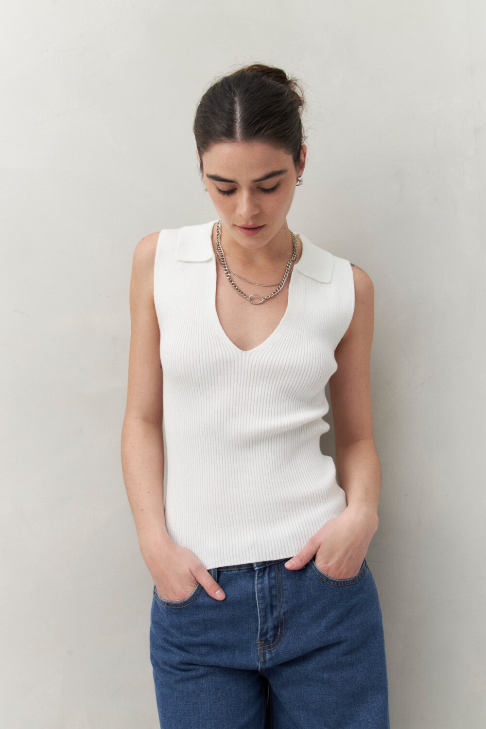 Top tejido sin mangas con escote en V y cuello tipo solapa, una combinación que realza el escote y aporta un aire elegante y moderno. Su tejido acanalado se ajusta suavemente al cuerpo, destacando la silueta sin perder comodidad. Ideal para combinar con pantalones sastreros o faldas largas y lograr un look pulido con toques contemporáneos.
