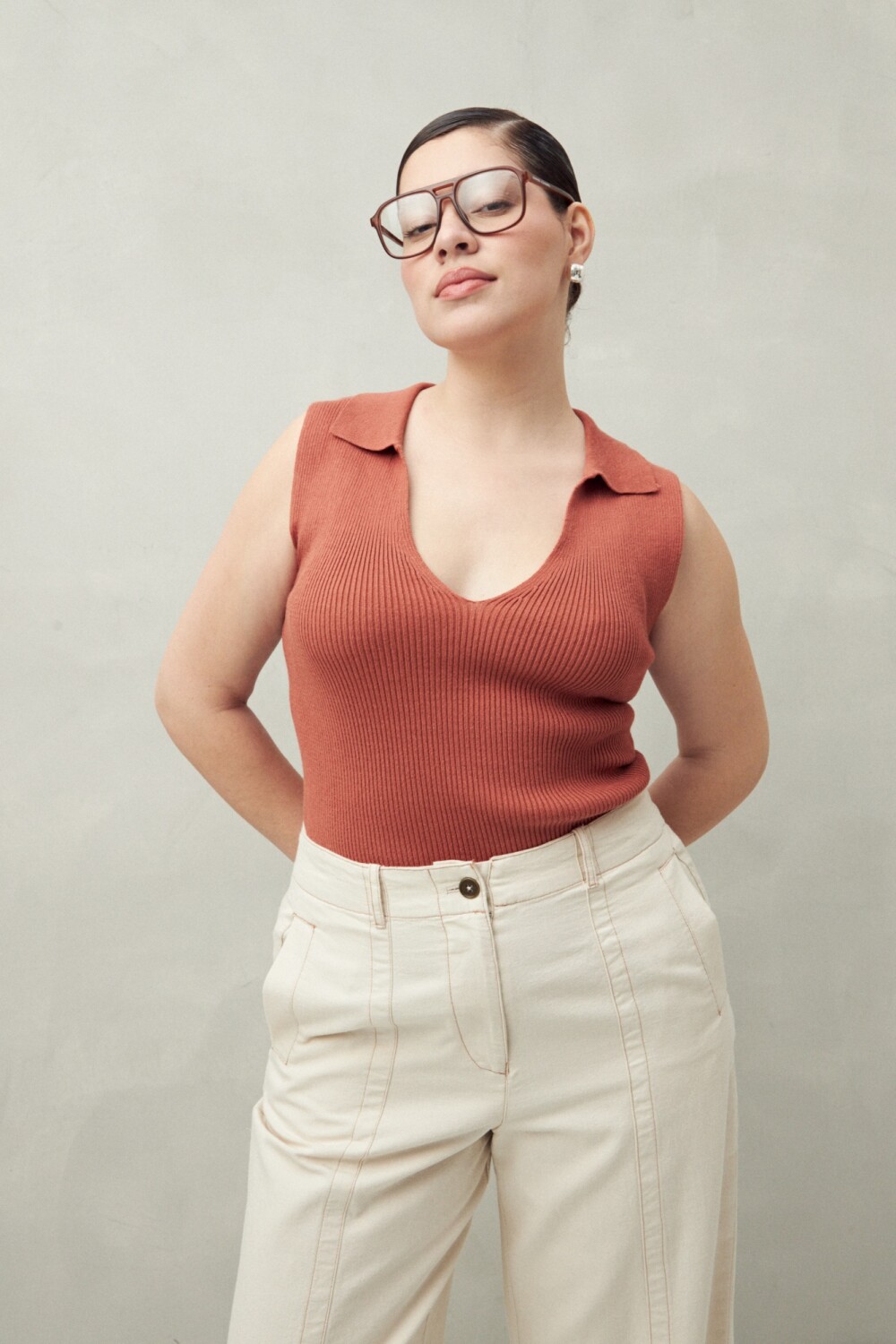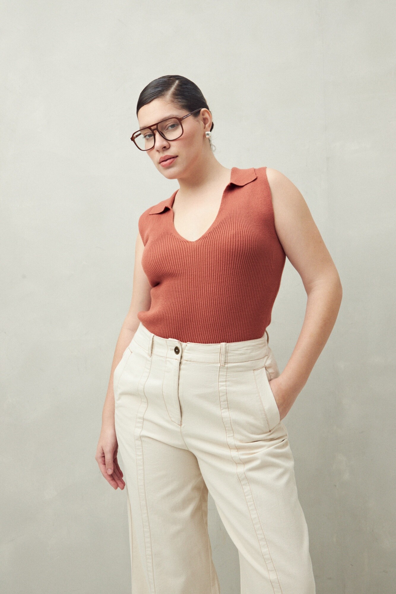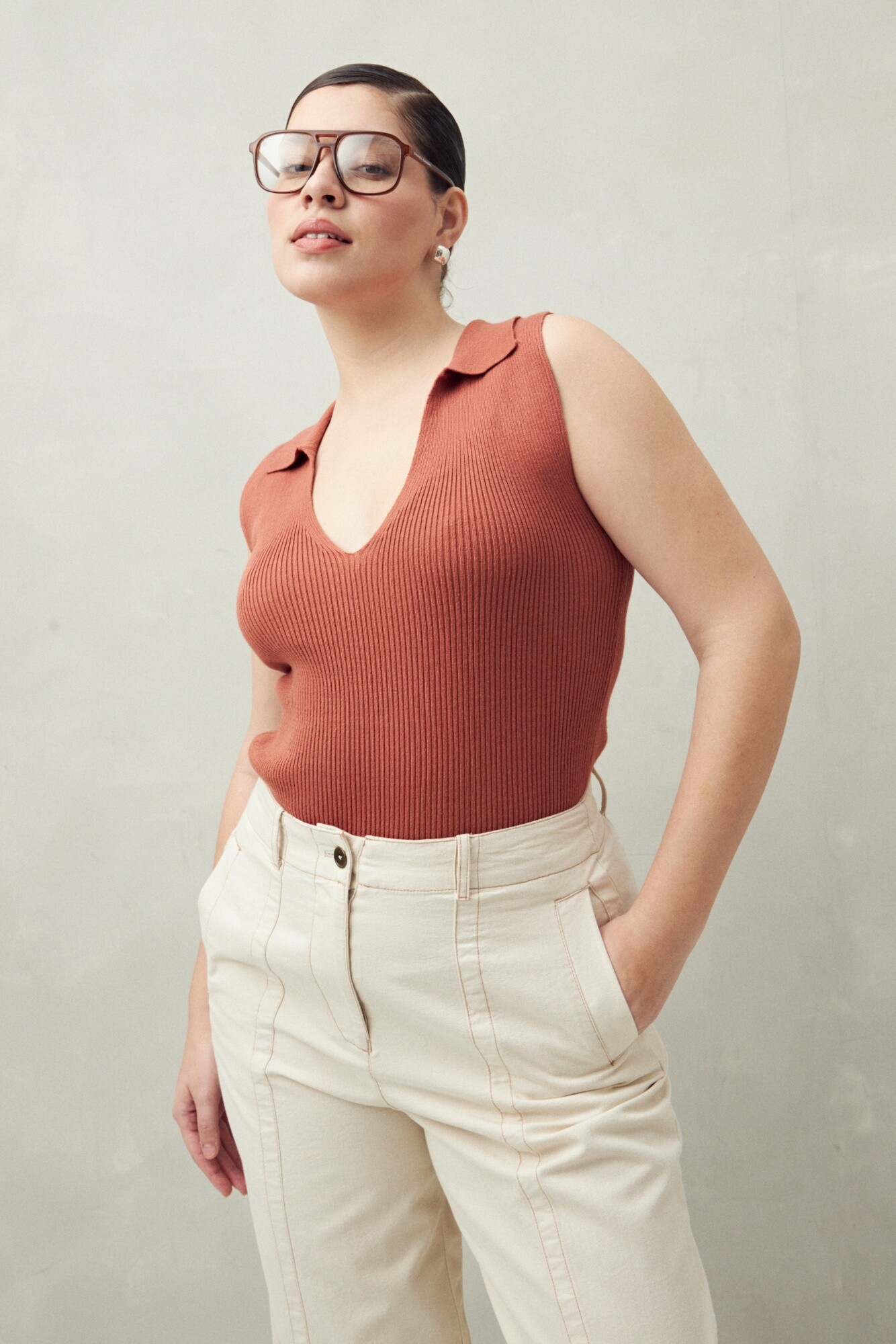 Top tejido sin mangas con escote en V y cuello tipo solapa, una combinación que realza el escote y aporta un aire elegante y moderno. Su tejido acanalado se ajusta suavemente al cuerpo, destacando la silueta sin perder comodidad. Ideal para combinar con pantalones sastreros o faldas largas y lograr un look pulido con toques contemporáneos.
