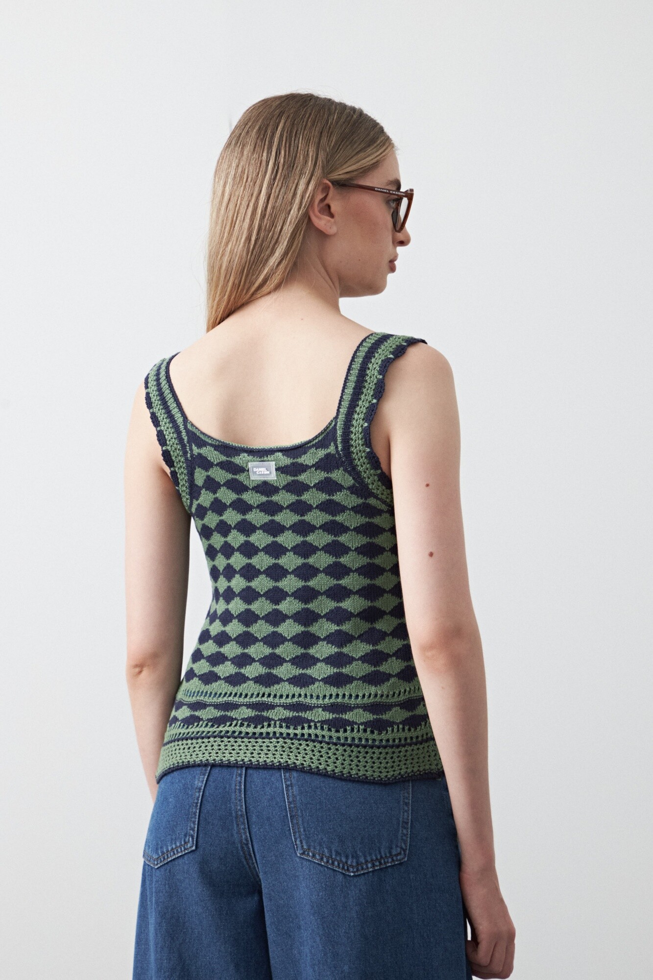 Top sin mangas tejido con diseño geométrico en relieve, que aporta textura y un atractivo visual distintivo. El escote amplio y los breteles tejidos con terminaciones trabajadas refuerzan el carácter artesanal de la prenda, mientras que la estructura acompaña la silueta de forma cómoda. Una pieza protagonista, ideal para sumar interés a looks relajados o más armados, clave para elevar cualquier look desde lo textil.