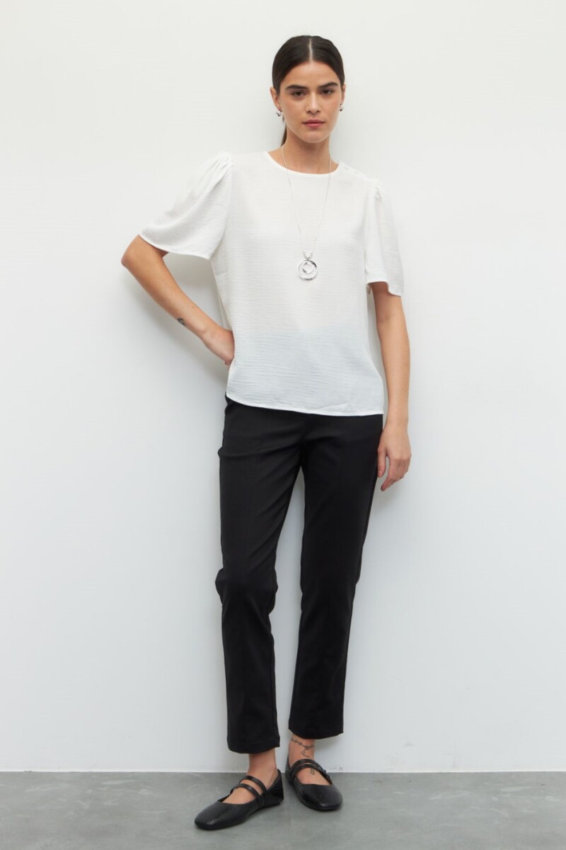 Top de mangas abullonadas de caída espléndida, tiene delicados botones forrados en la misma tela y es súper liviano.