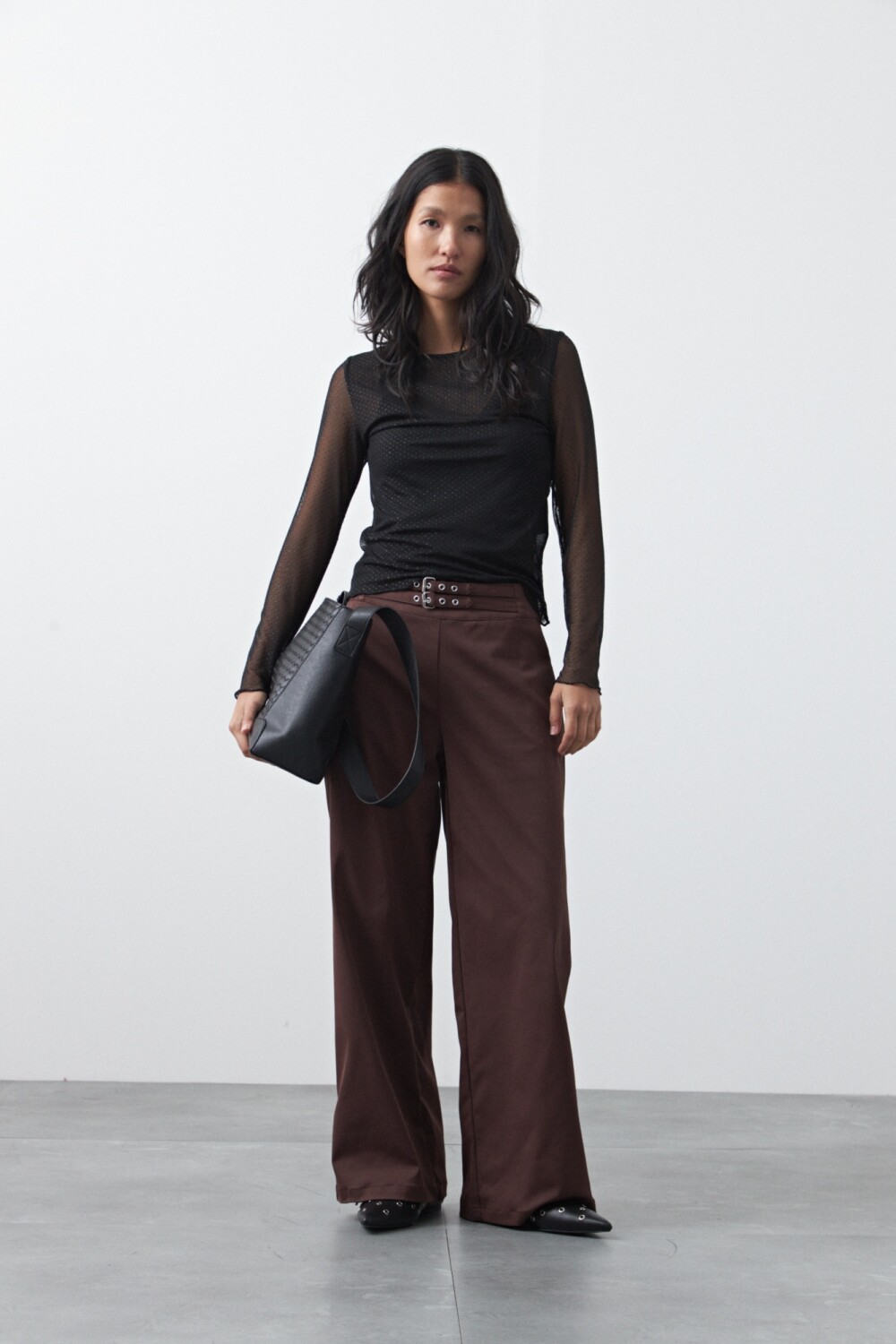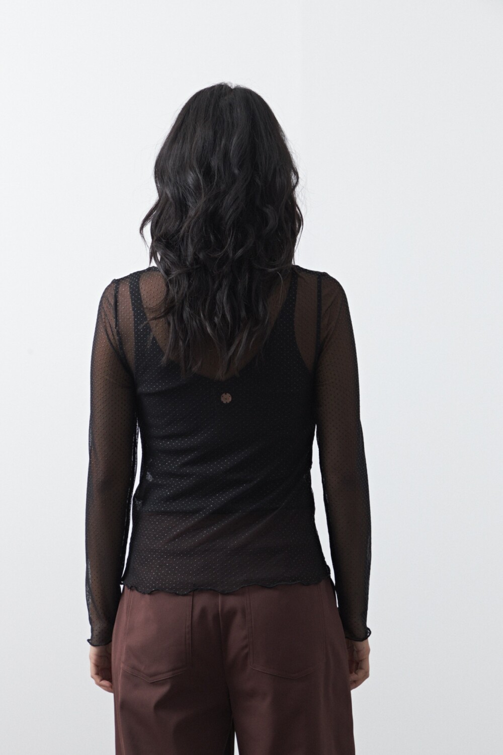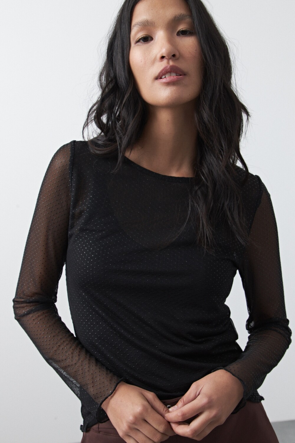 Top de manga larga confeccionado en tejido translúcido con micro textura que aporta profundidad visual y un efecto delicado al diseño. Su silueta ajustada y liviana acompaña el cuerpo con suavidad, mientras que la transparencia sutil suma un aire sofisticado ideal para estilismos nocturnos. Una prenda en tendencia que funciona como pieza protagonista y se integra fácilmente en looks urbanos o más elegantes.