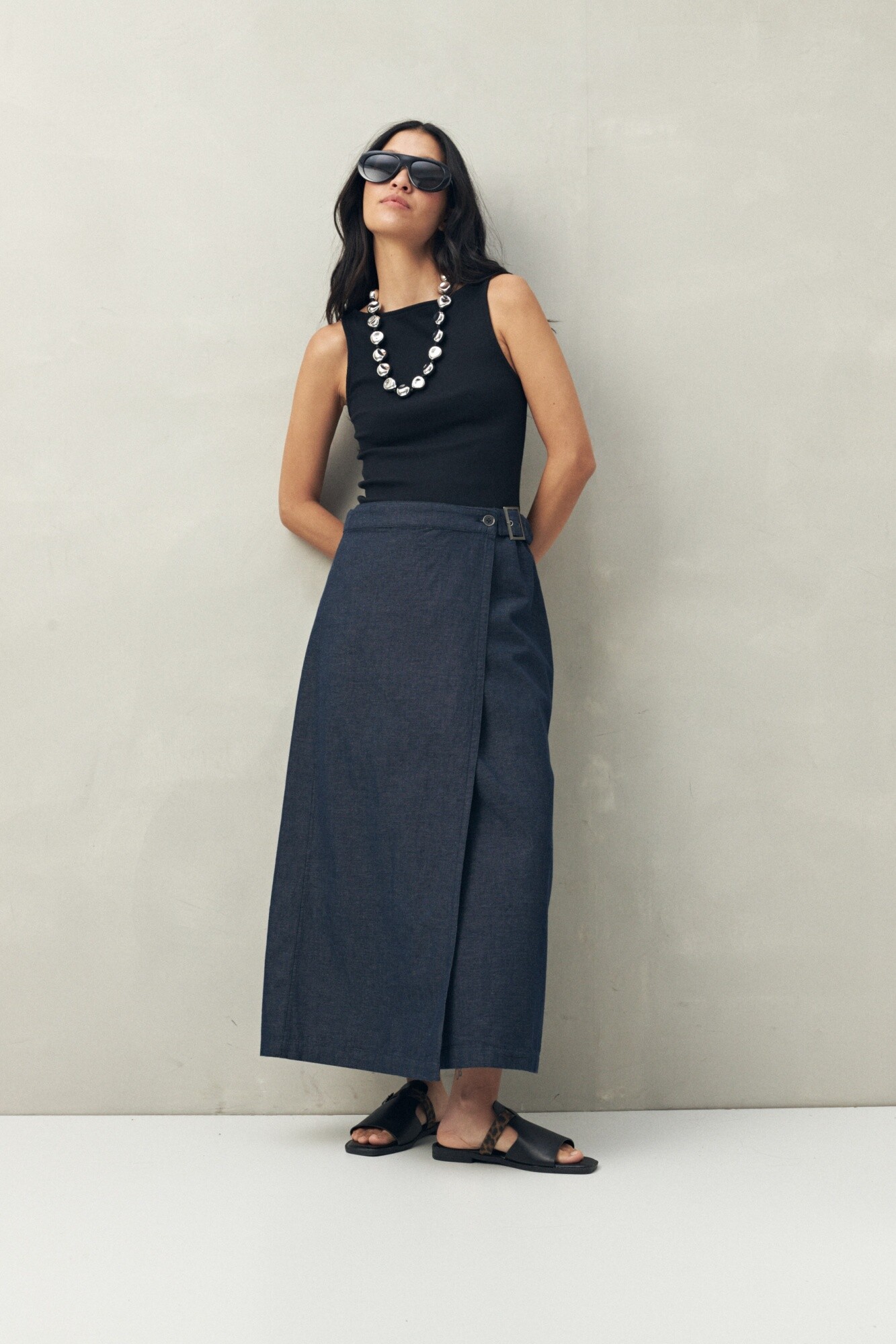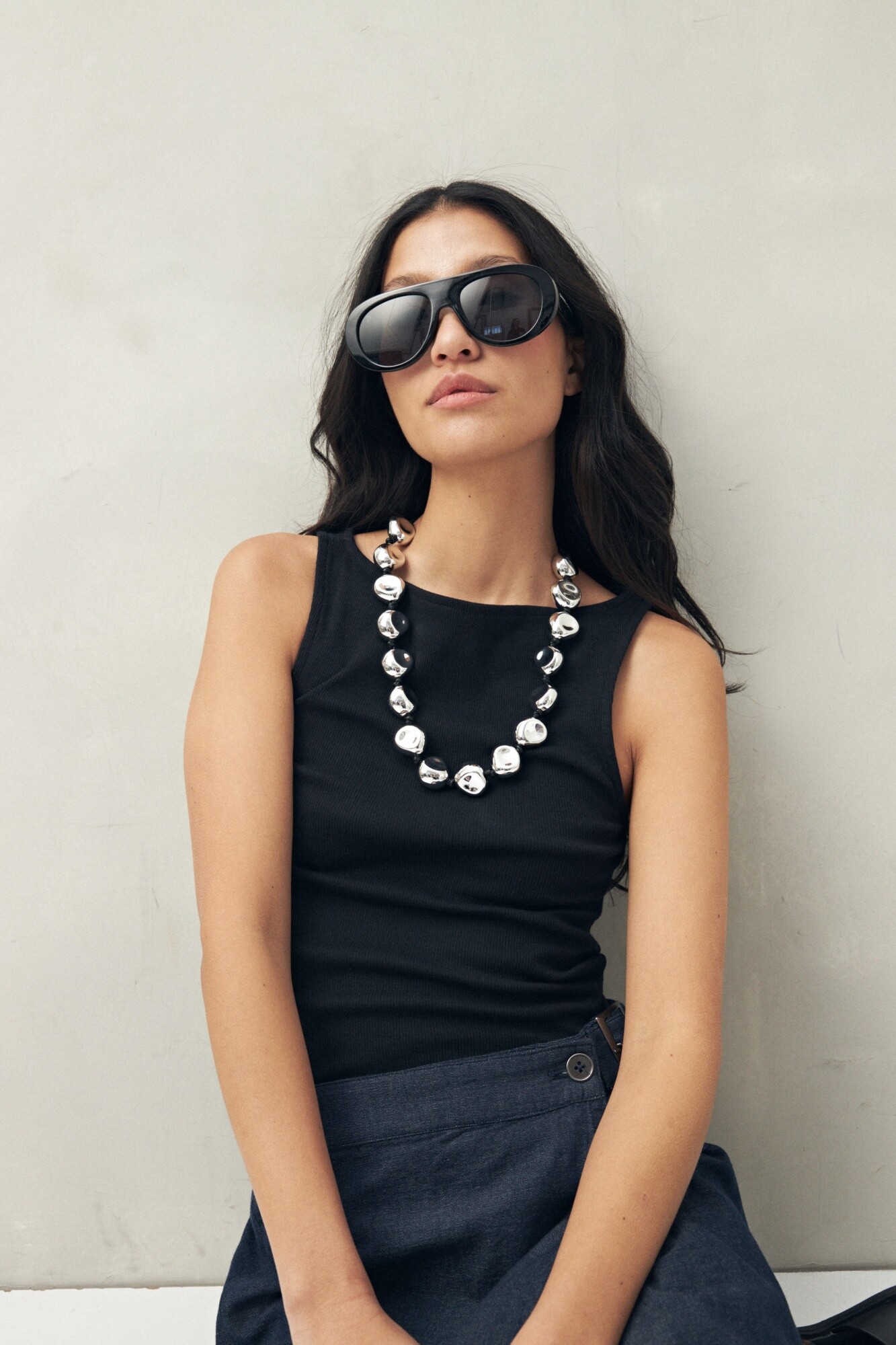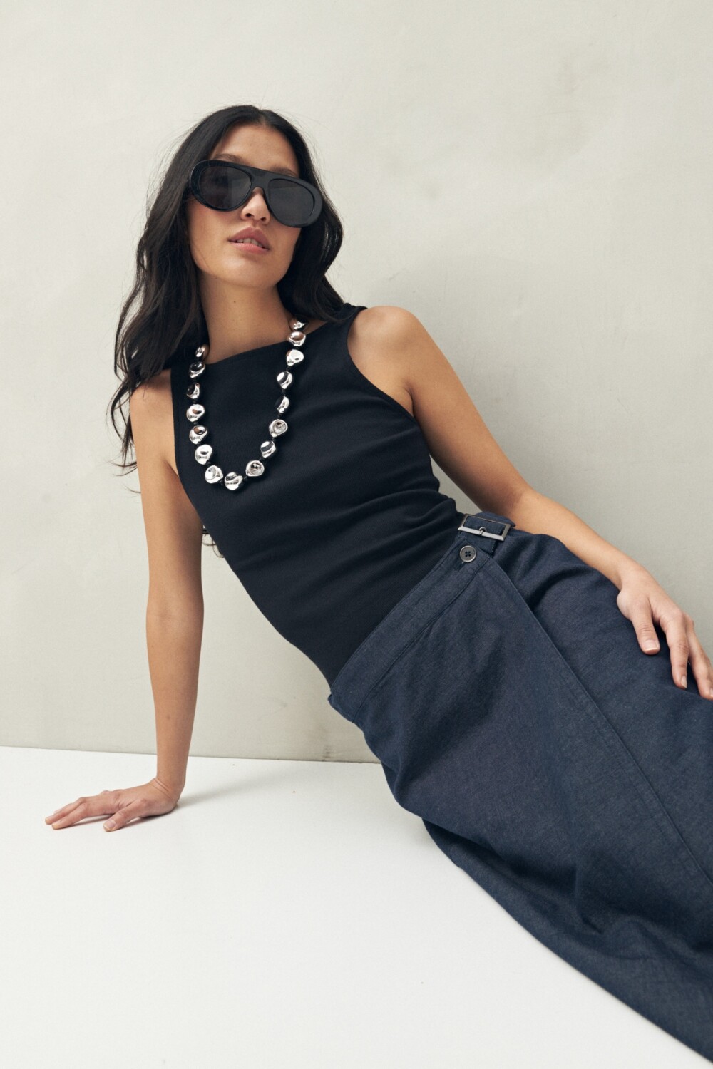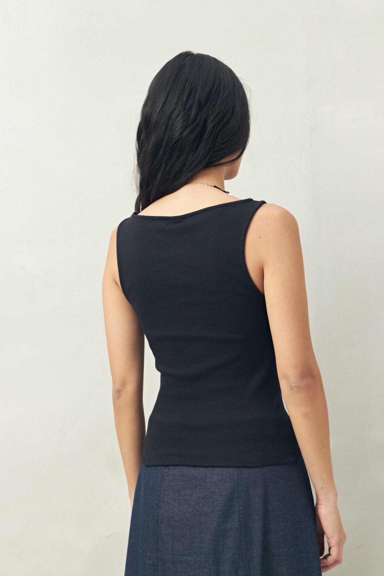 20 Un básico con aire contemporáneo, ideal para acompañar desde jeans hasta faldas o shorts. Su tejido de algodón con un toque de elastano ofrece suavidad, elasticidad y un calce cómodo que realza la silueta. El escote recto aporta una estética moderna y limpia, perfecta para looks minimalistas o como base de capas. Clave para elevar cualquier look con simpleza y estilo.