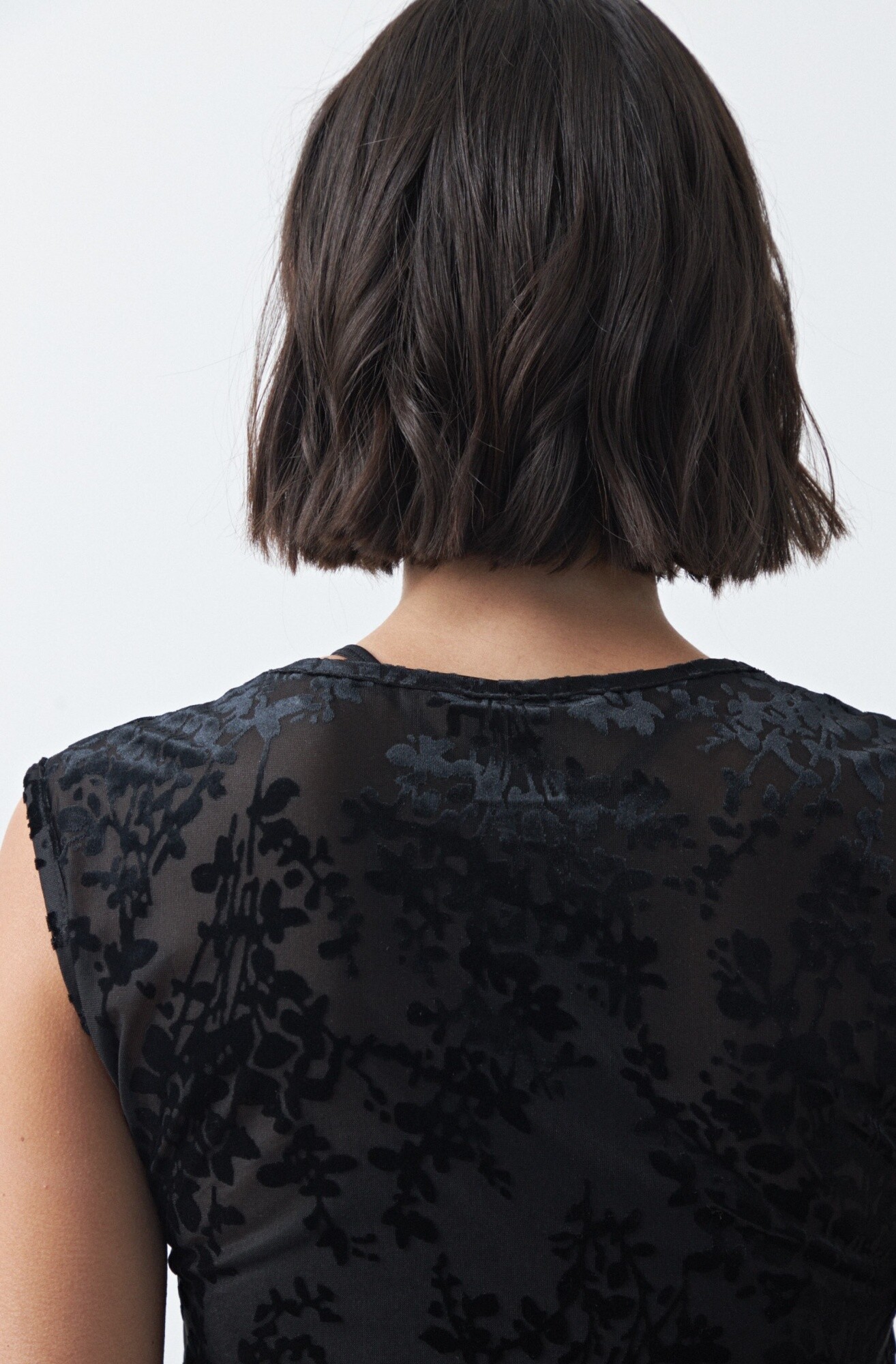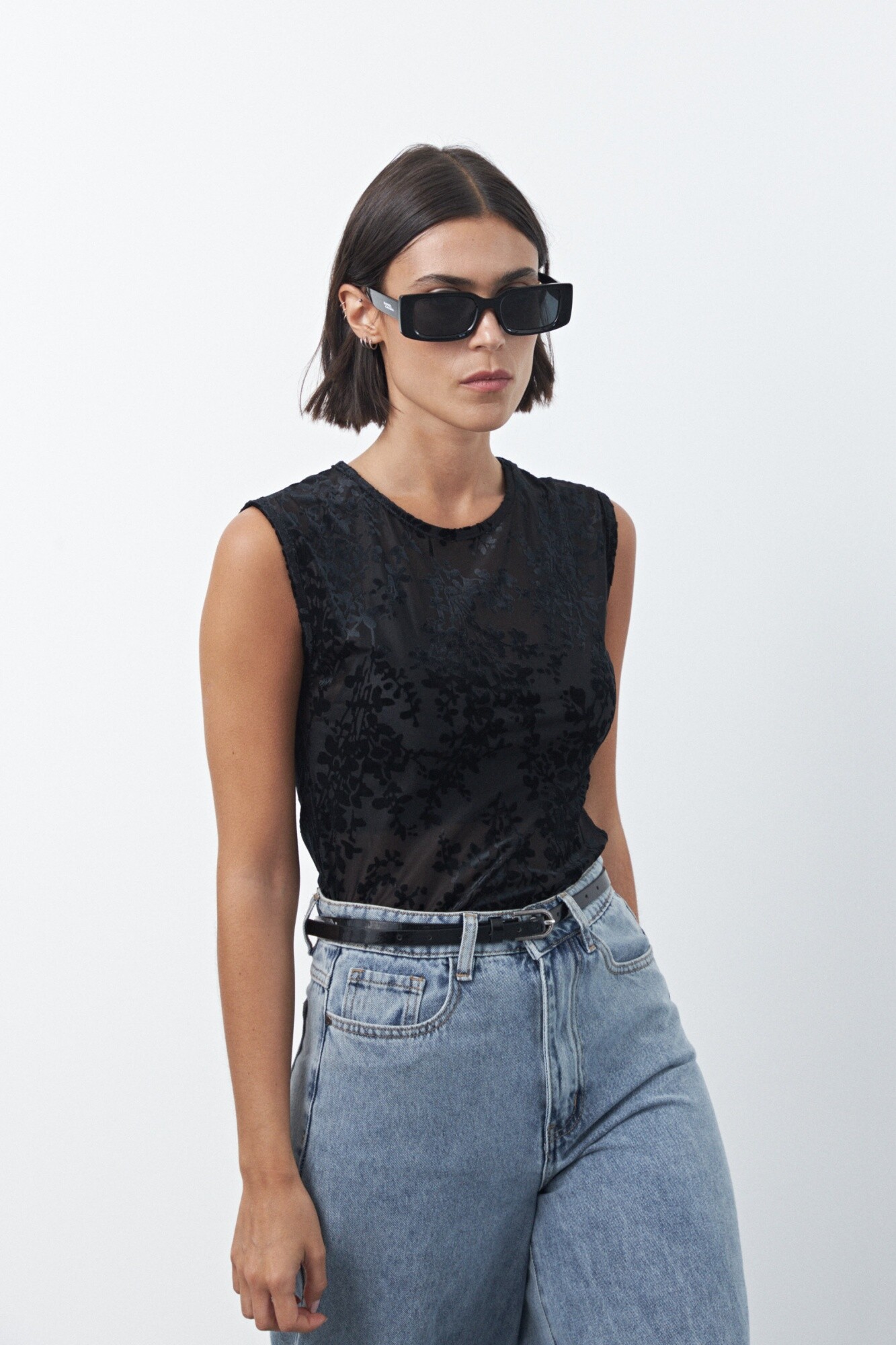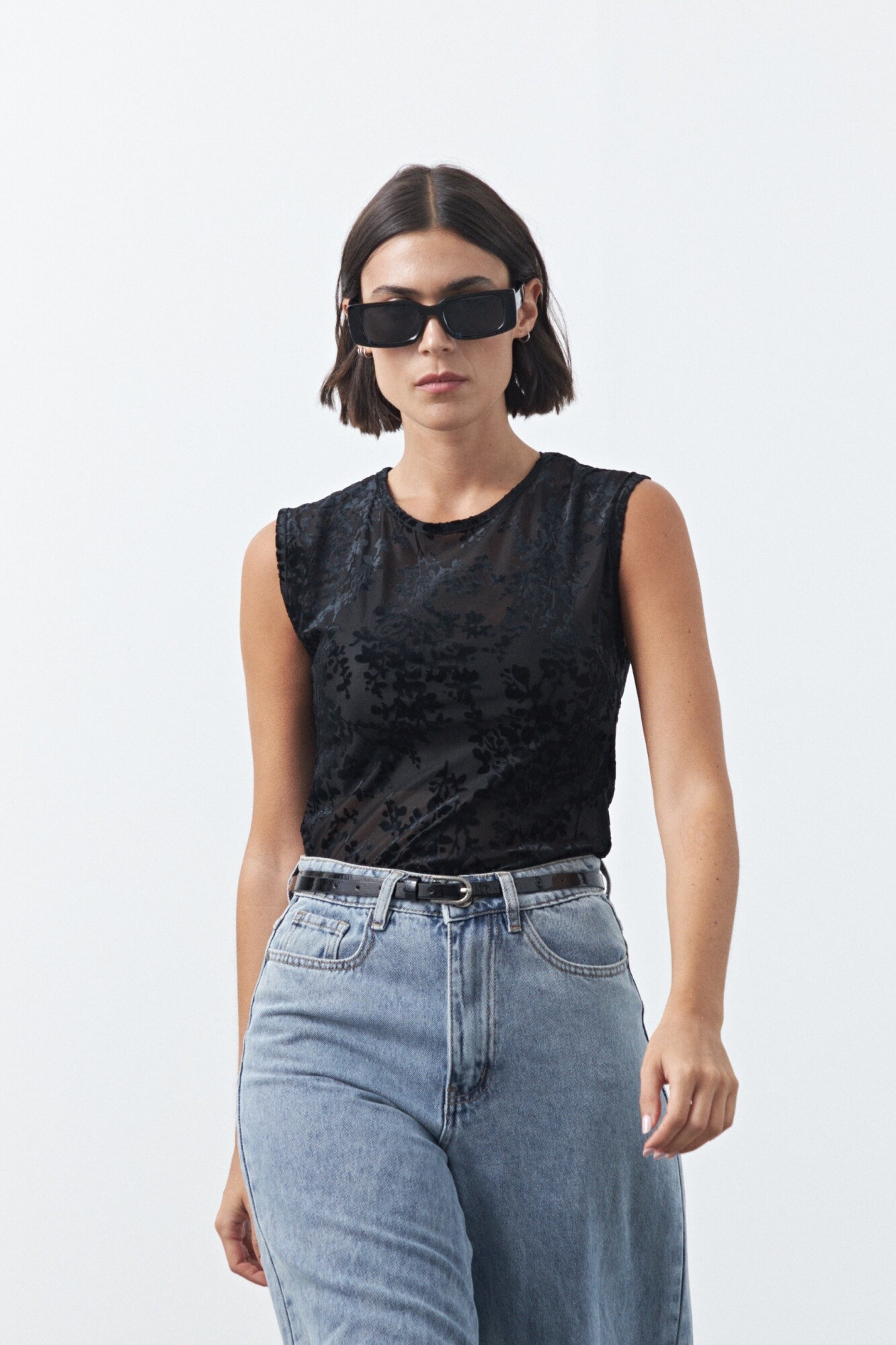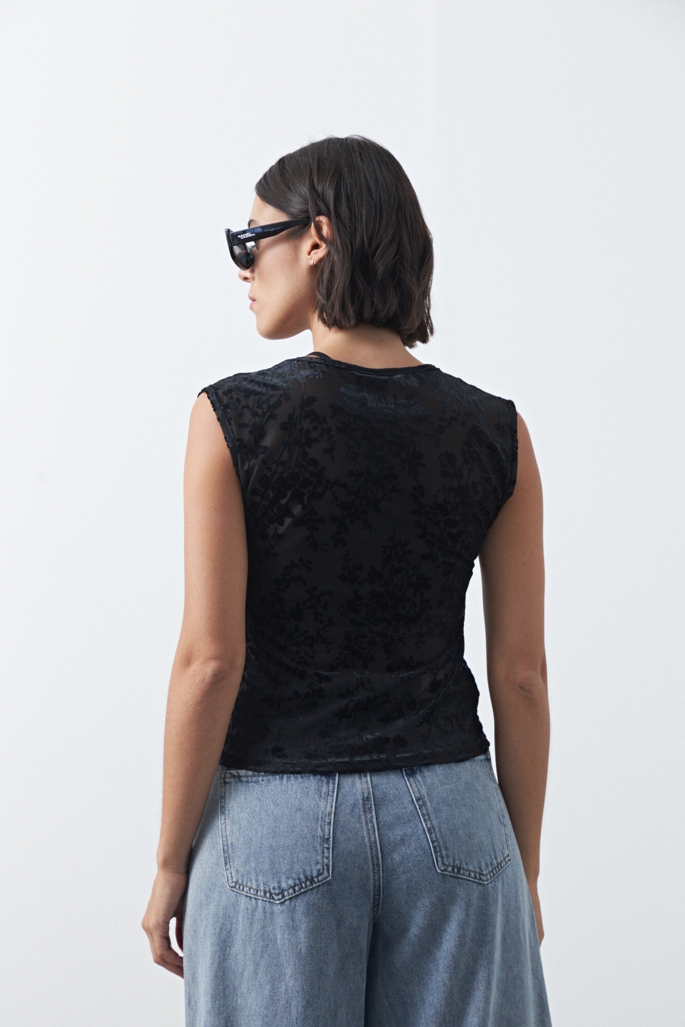 Top de tul con estampa aterciopelada que aporta textura y un efecto visual sutil. De calce al cuerpo y mangas cortas, es una prenda liviana y versátil que funciona tanto sola como en capas, ideal para elevar looks básicos y un gran aliado para un look de noche.