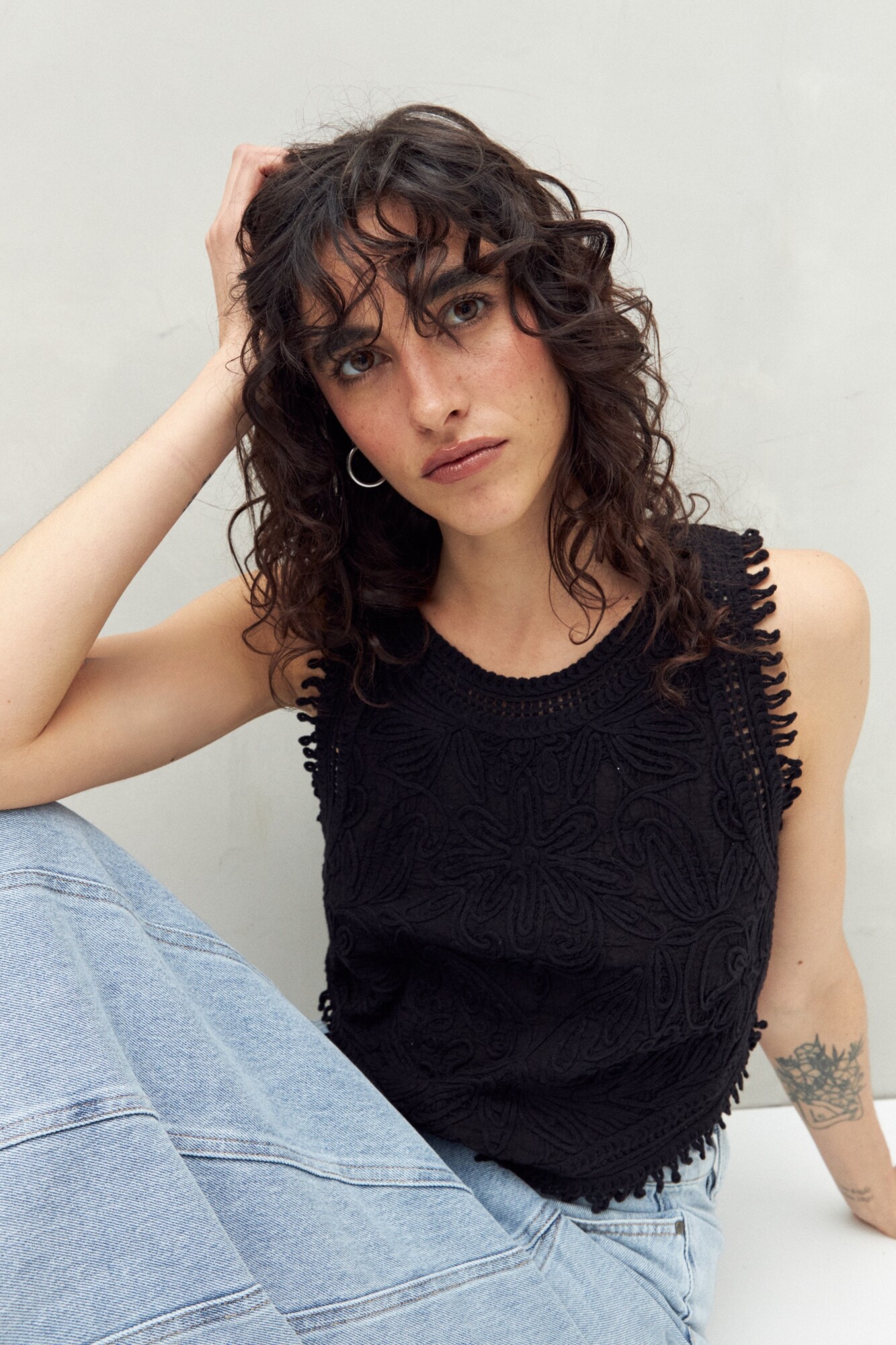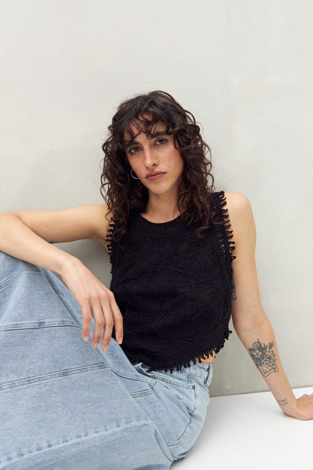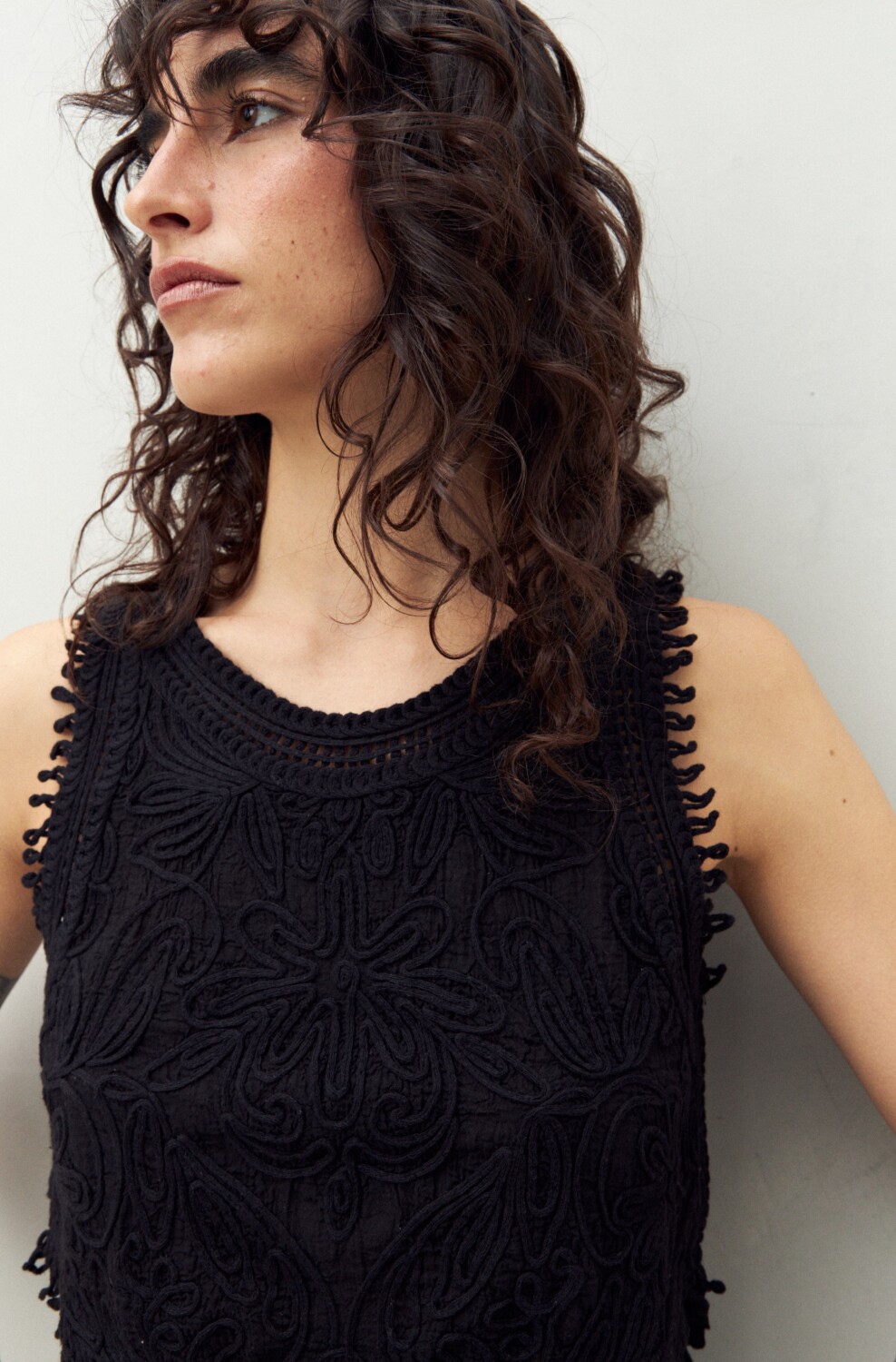 Top con diseño bordado en relieve que aporta una textura artesanal y muy protagonista. Su calce recto y el ruedo en pico crean una silueta distintiva, mientras que los detalles festoneados en sisas y escote suman un acabado delicado y femenino. Una prenda en tendencia, ideal para elevar looks de día con un toque boho sofisticado.