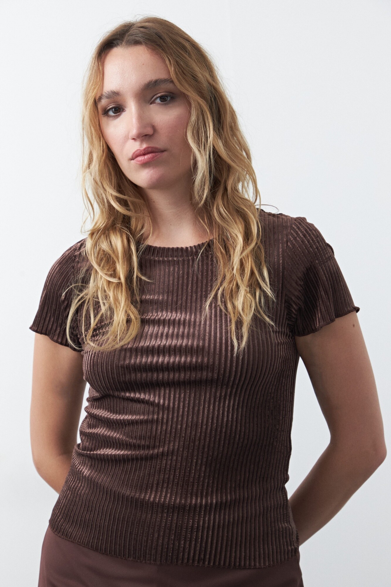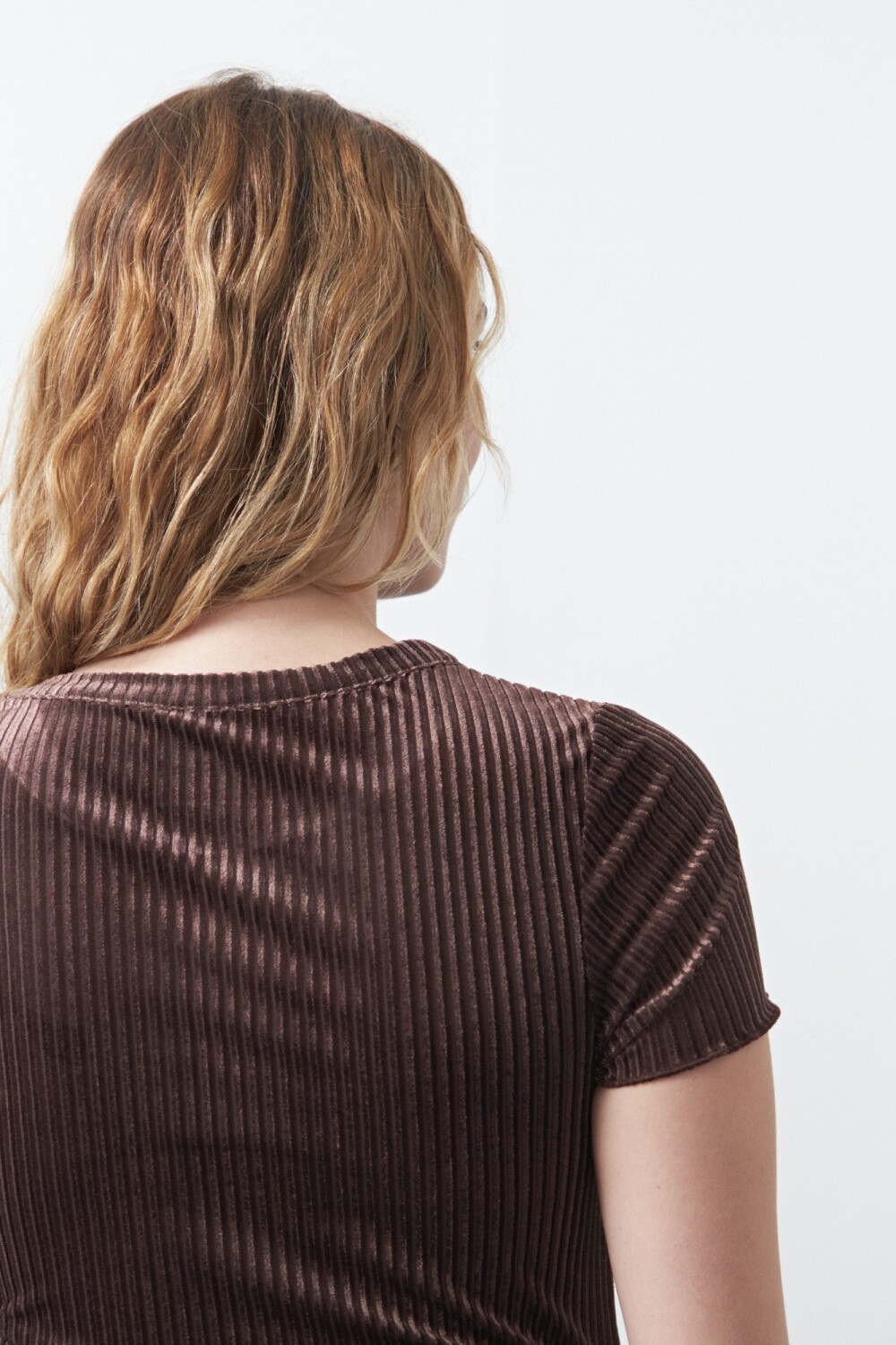 Top de manga corta confeccionado en terciopelo, de textura suave y acabado con leve brillo que aporta un aire sofisticado. Su tejido con elasticidad acompaña el cuerpo con un calce cómodo y favorecedor, mientras que el diseño limpio lo convierte en una opción ideal para looks de noche o propuestas más arregladas. Una prenda versátil que suma elegancia y se adapta con facilidad a distintos estilismos.
