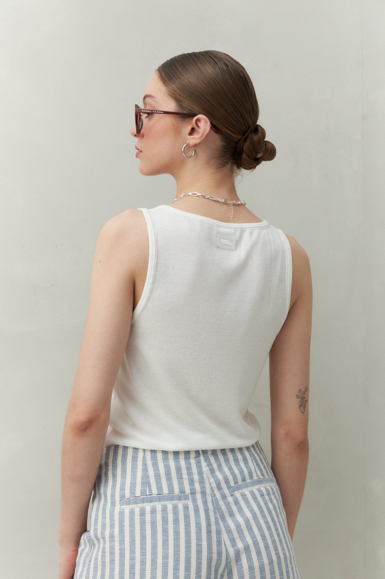 20 Un básico atemporal que se adapta a cualquier look. Su tejido de viscosa con toque de elasticidad aporta suavidad, caída y un calce cómodo que realza la silueta sin ajustar. Ideal para combinar con jeans, faldas o shorts, tanto en versiones casuales como más arregladas. Un infaltable del guardarropa que se renueva cada temporada por su versatilidad y estilo minimalista.